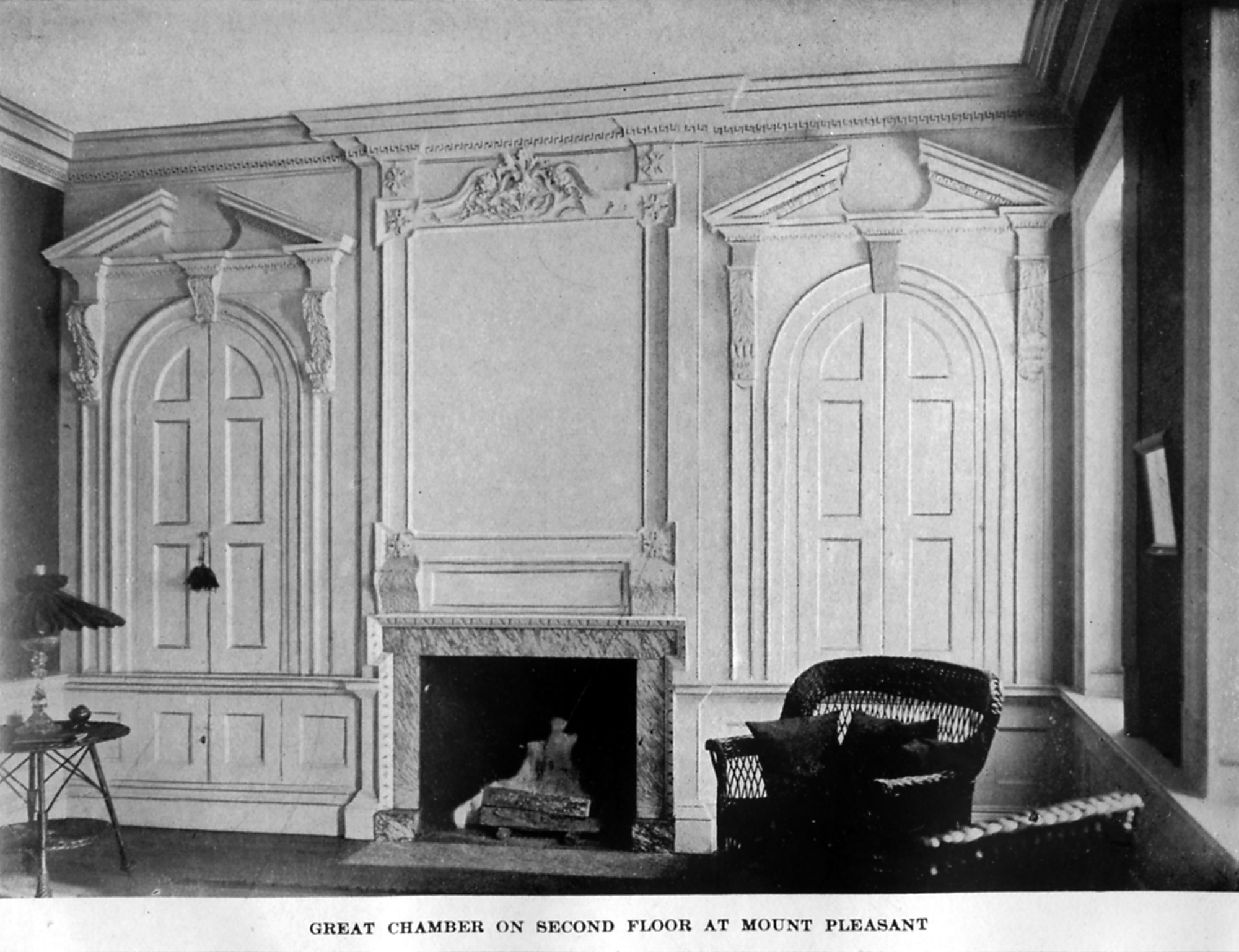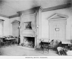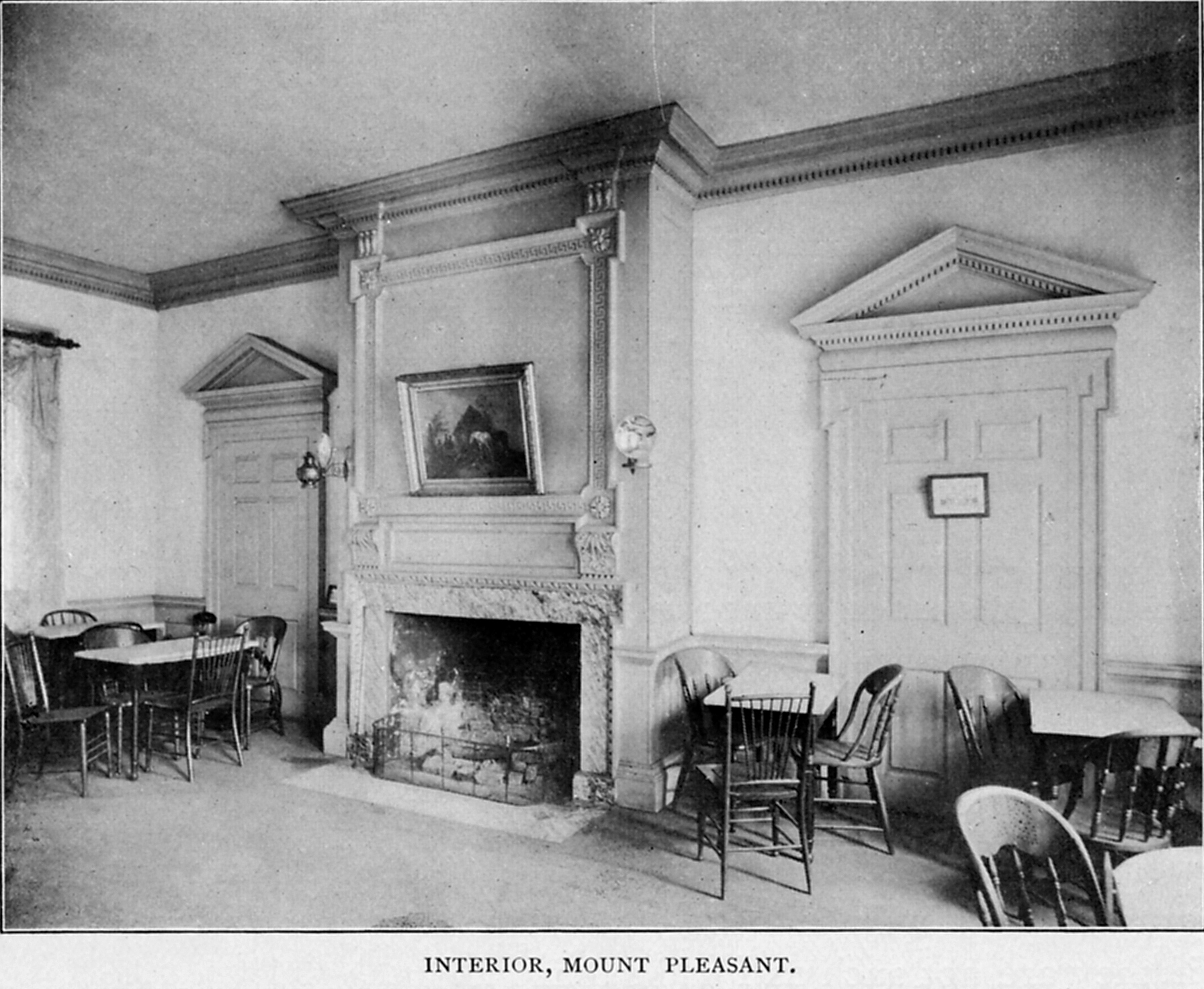 Notwithstanding the book’s title, the text primarily consists of biographies of the mansion’s inhabitants while only six sentences of the seventeen page Mount Pleasant chapter deal with the buildings on the site. Westcott is not particularly impressed with the fabric of the house, describing the “not very handsome” chimneypieces “with pretentious panels above”, and the woodwork “in the old fashion”. The entire effect is said to be “of the old times.”