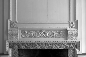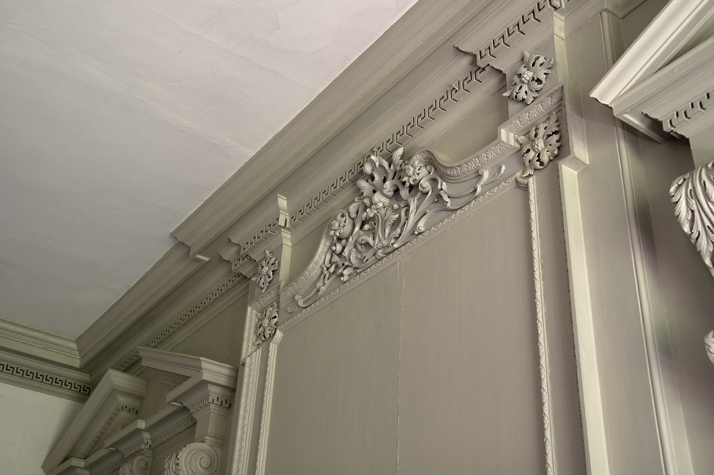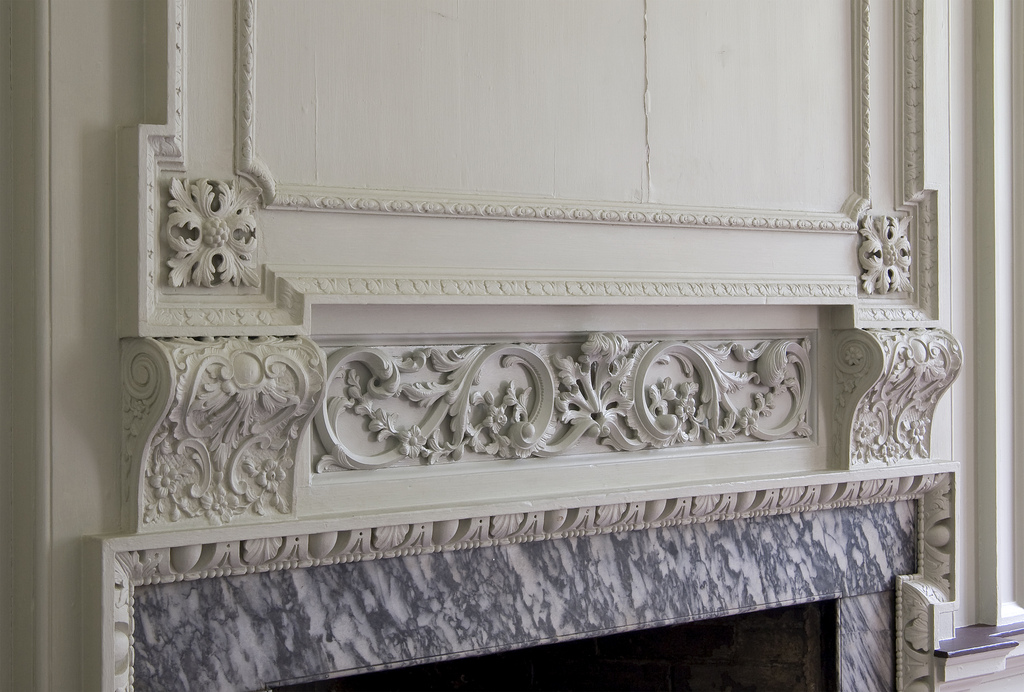 My projects at Mount Pleasant have been completed. The chimneypiece frieze and tympanum applique have had two layers of oil paint applied, a primer coat and top coat that is close to, but does not exactly match the color of the rest of the woodwork of the room which was re-painted in 1994. The new paint is also slightly more light reflective or glossy and is a closer match to the gloss of the existing interior paint applied in 1975 than the re-painting in the drawing room which appears quite flat for an oil paint.