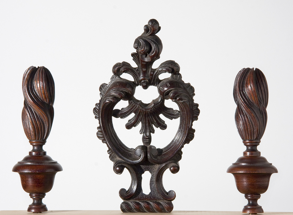Reproduction cartouche and finials for a case housing a movement by Burrows Dowdney, Philadelphia, c. 1770. On loan to the Department of State, Washington, D.C., Dietrich American Foundation