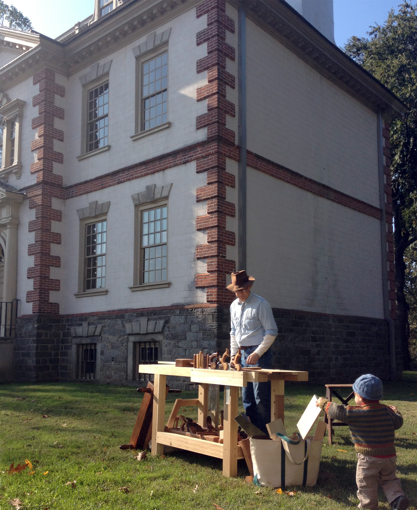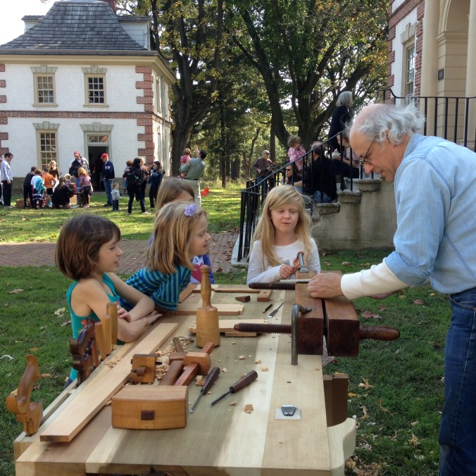 The weather was perfect for Harvest Day at Mount Pleasant and there was a steady stream of interested visitors to my bench with a number of them trying out the planes when I was planning a board to make a panel for a framed door. It was interesting to hear a lot of “So that’s how it’s done” as I drove the long tapered pegs into the draw-bored holes of the mortise and tenon joints and visitors saw the joints pull tightly together without clamps or glue.