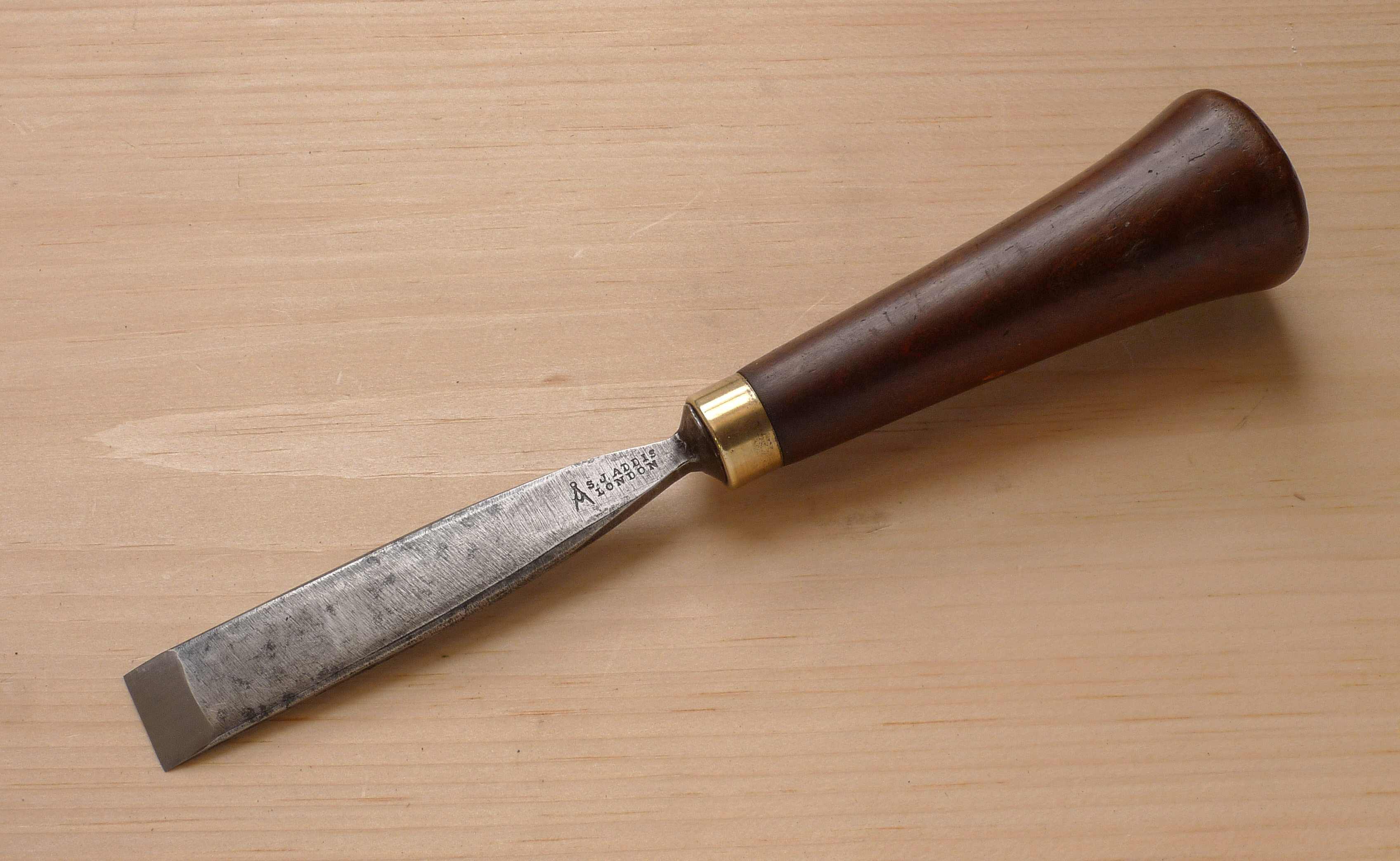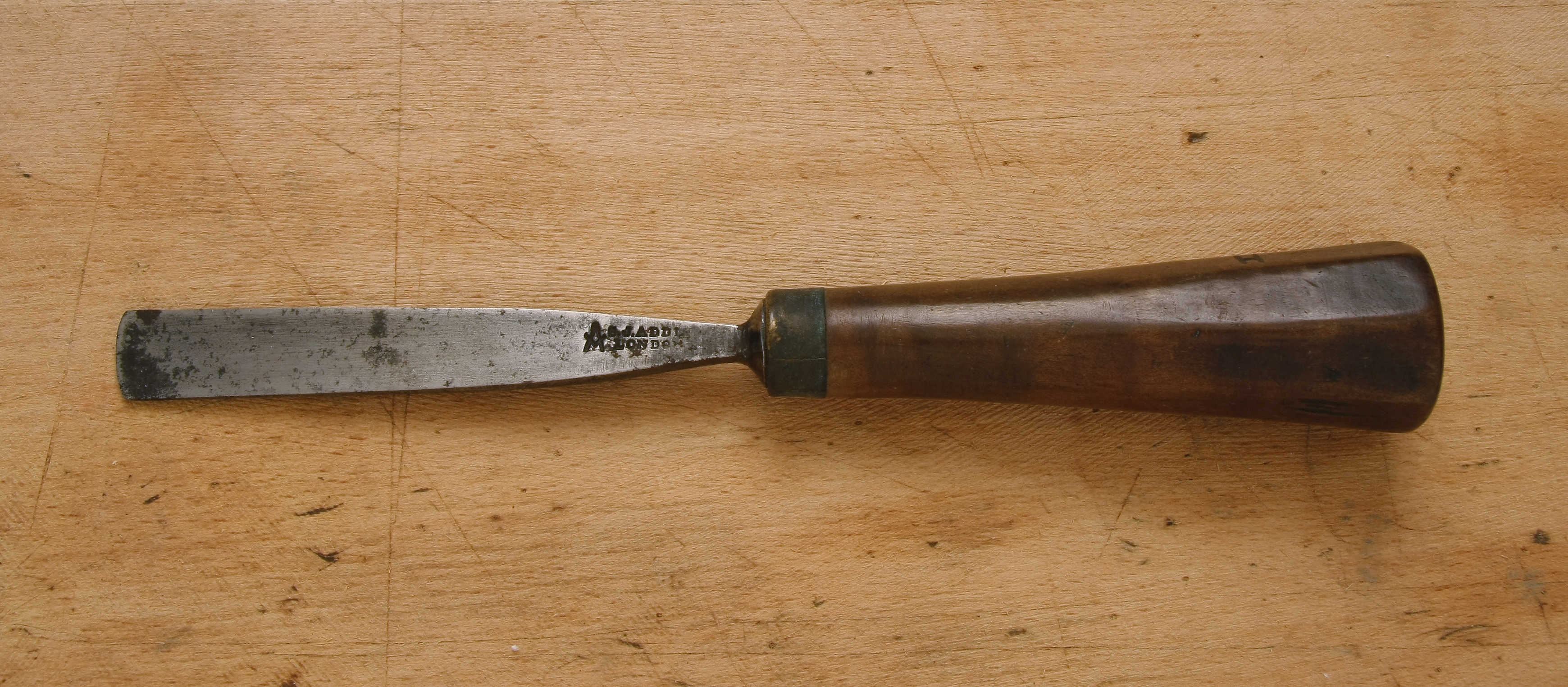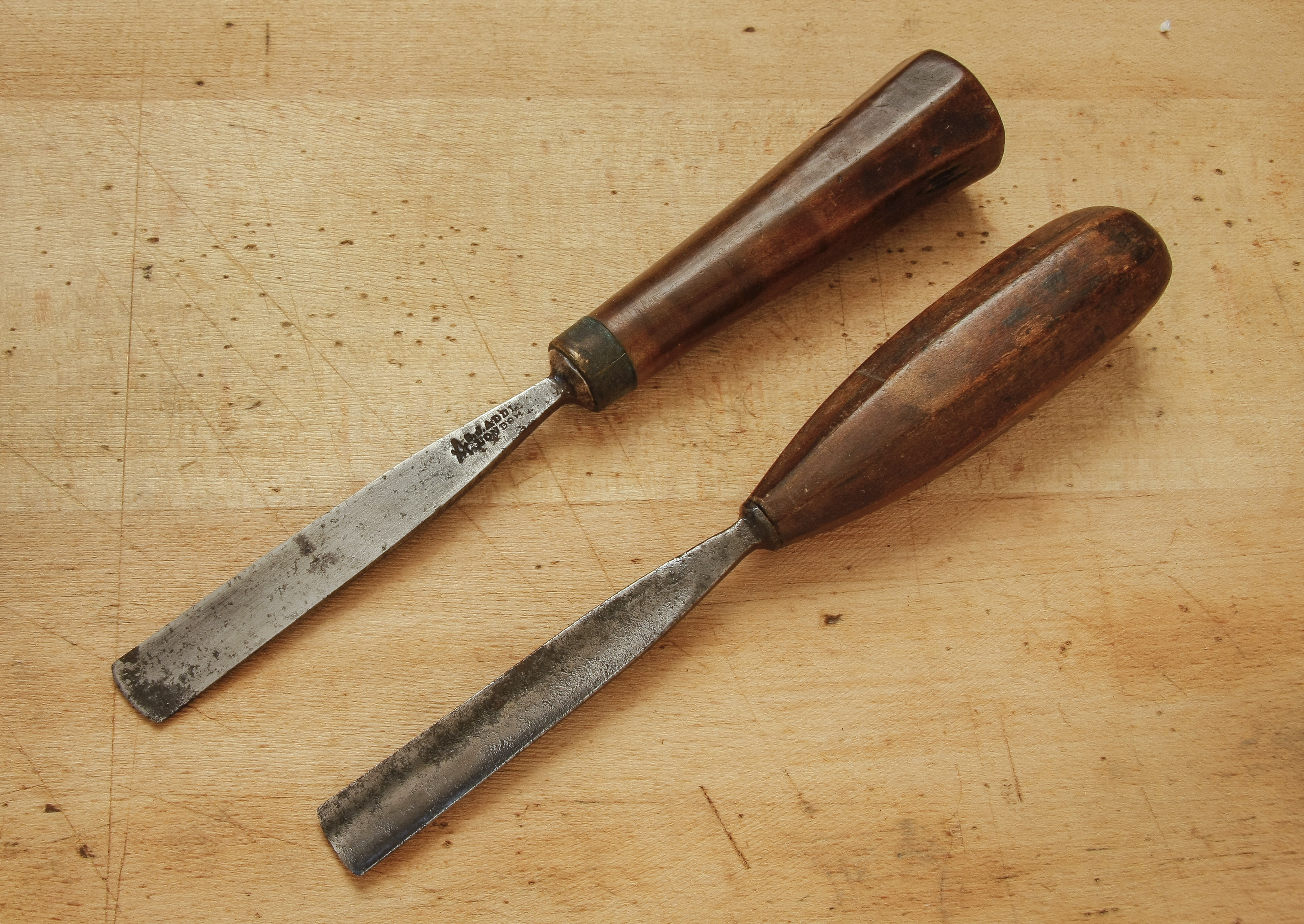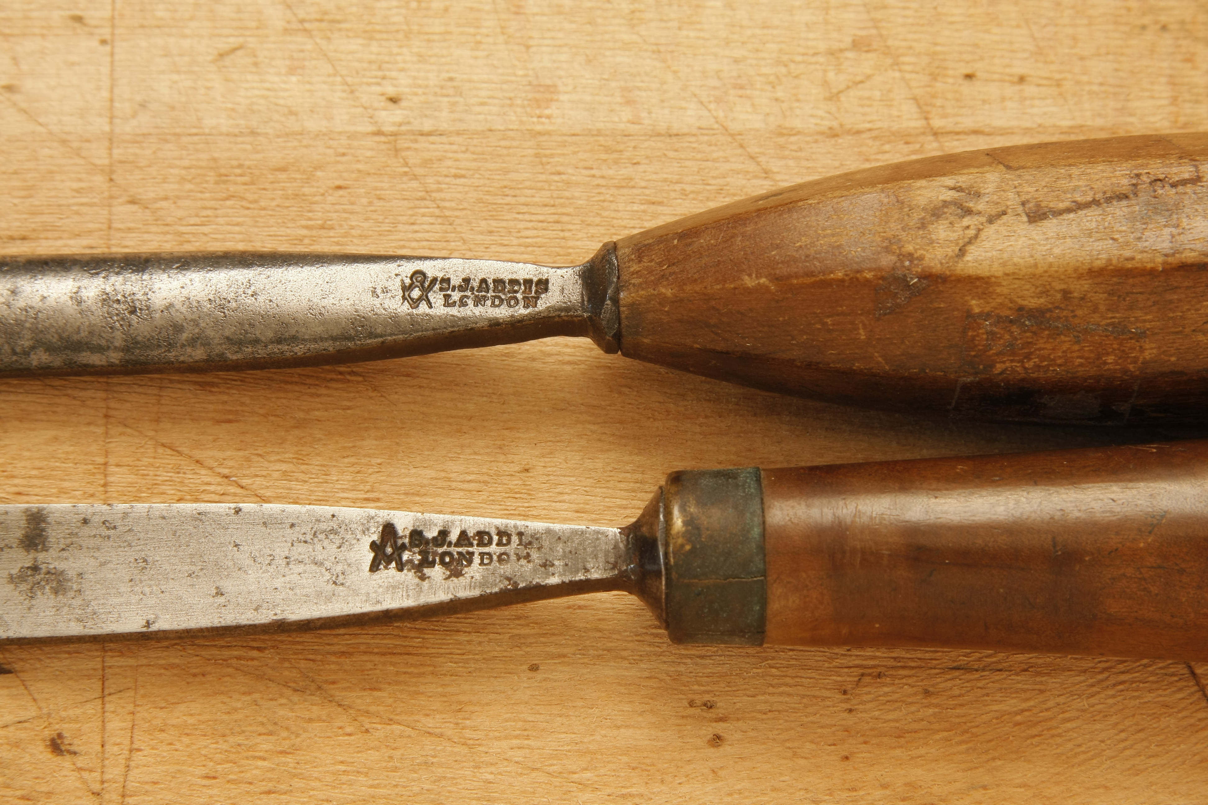 Addis gouges beforeThey are both marked with a crossed compass and square followed by S.J. ADDIS/LONDON. The upper tool in the photo below has the Addis imprint on the back and no sweep number, the lower tool has the imprint on the front and is marked “3” on the back, indicating it is the flattest or slowest sweep gouge as designated by the Sheffield List or the London Pattern which had recently been introduced by Sheffield, England edge tool makers to easily identify the shapes of their carving tools for what had become an international market. Both these tools were likely made in the 1880’s by the edge tool makers Ward and Payne, Sheffield, who purchased the trademark “S.J. ADDIS” after his death in 1871. For information on the Addis family of edge tool makers click here.