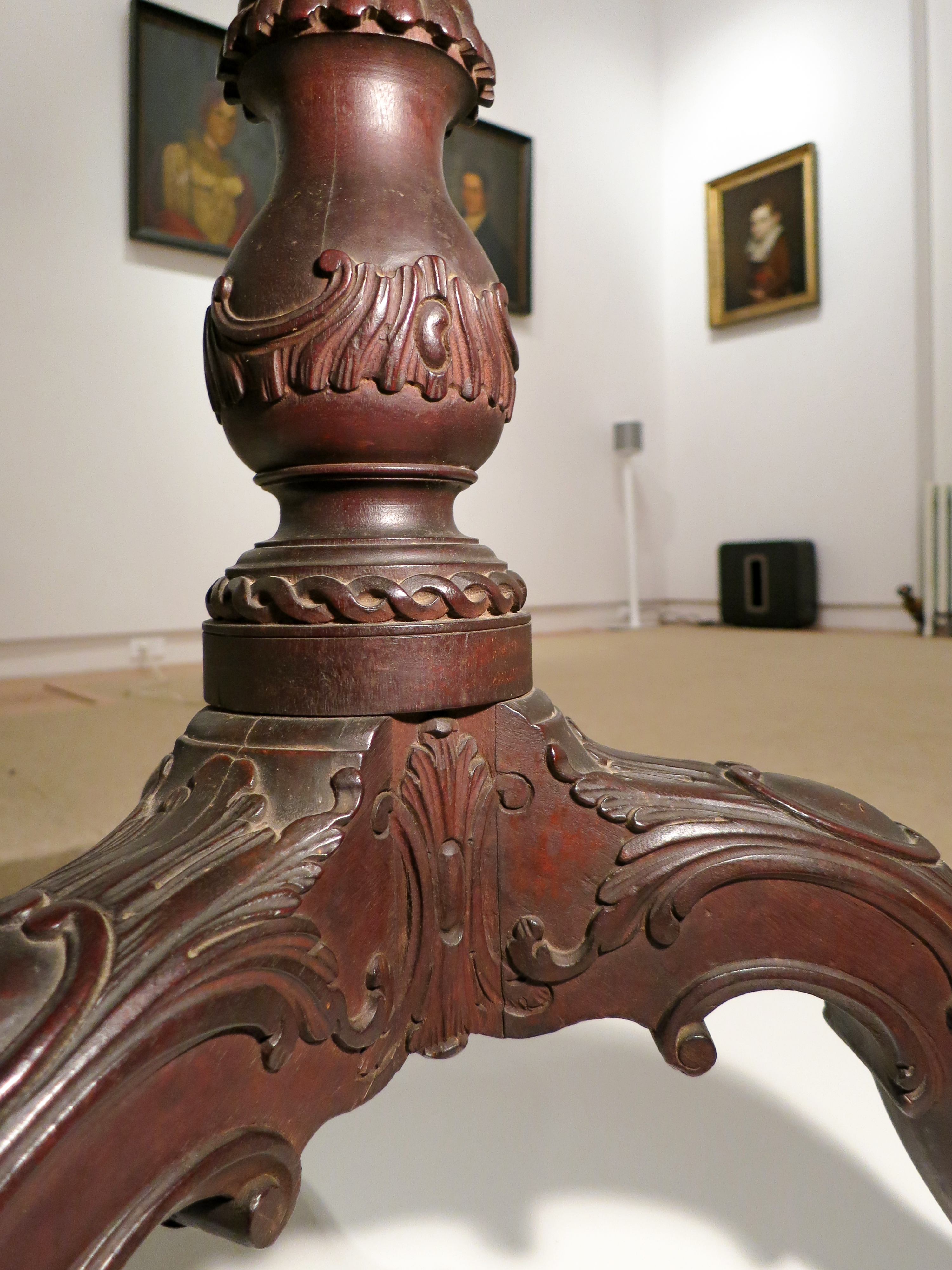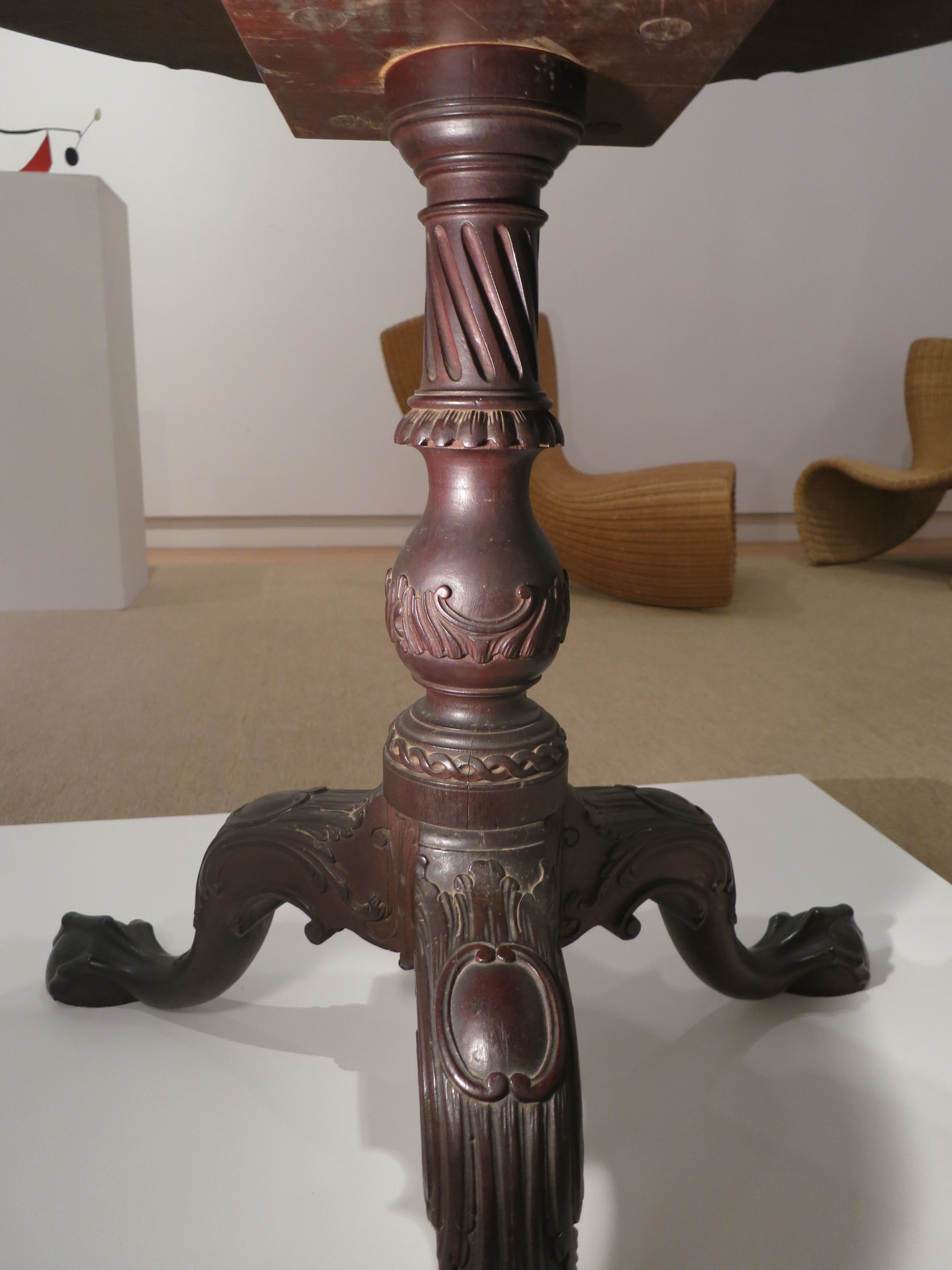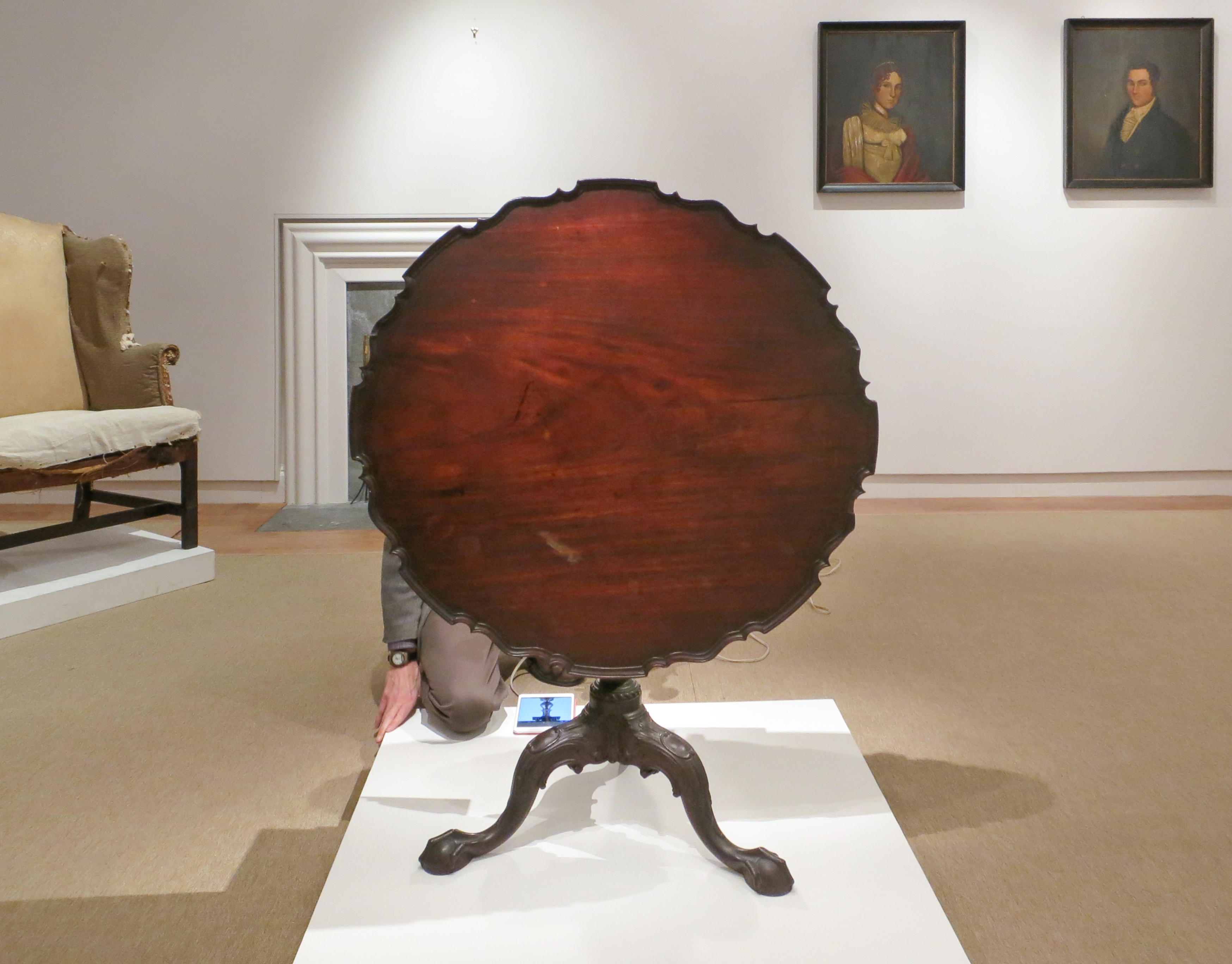 For nearly a decade the American furniture market has been awash in highly ornamented 18th century Philadelphia tea tables, with newly discovered elaborate tables turning up on the market every few years. I recently examined a table previously unpublished and unknown to the field that is scheduled to be auctioned January 31st. It is very close in appearance to a table in the collection of the Metropolitan Museum of Art. The catalogue description of the table selling in January suggests the possibility that the two tables might have been made as a pair. This idea, that paired scalloped top Philadelphia tea tables might have been made for a single client to be used in  single or multiple rooms is an interesting one. Are there extant estate inventories documenting pairs of tables? Are there invoices where pairs of tea tables are shown being purchased at the same time as pairs of card tables so commonly were? And what does it mean in the mid-18th century to be a “pair”? When looking at objects through the telescope of an age where there might exist millions of objects identical practically down to a molecular level, when is close enough good enough? More about that later. Here are a few details of the newly discovered table.