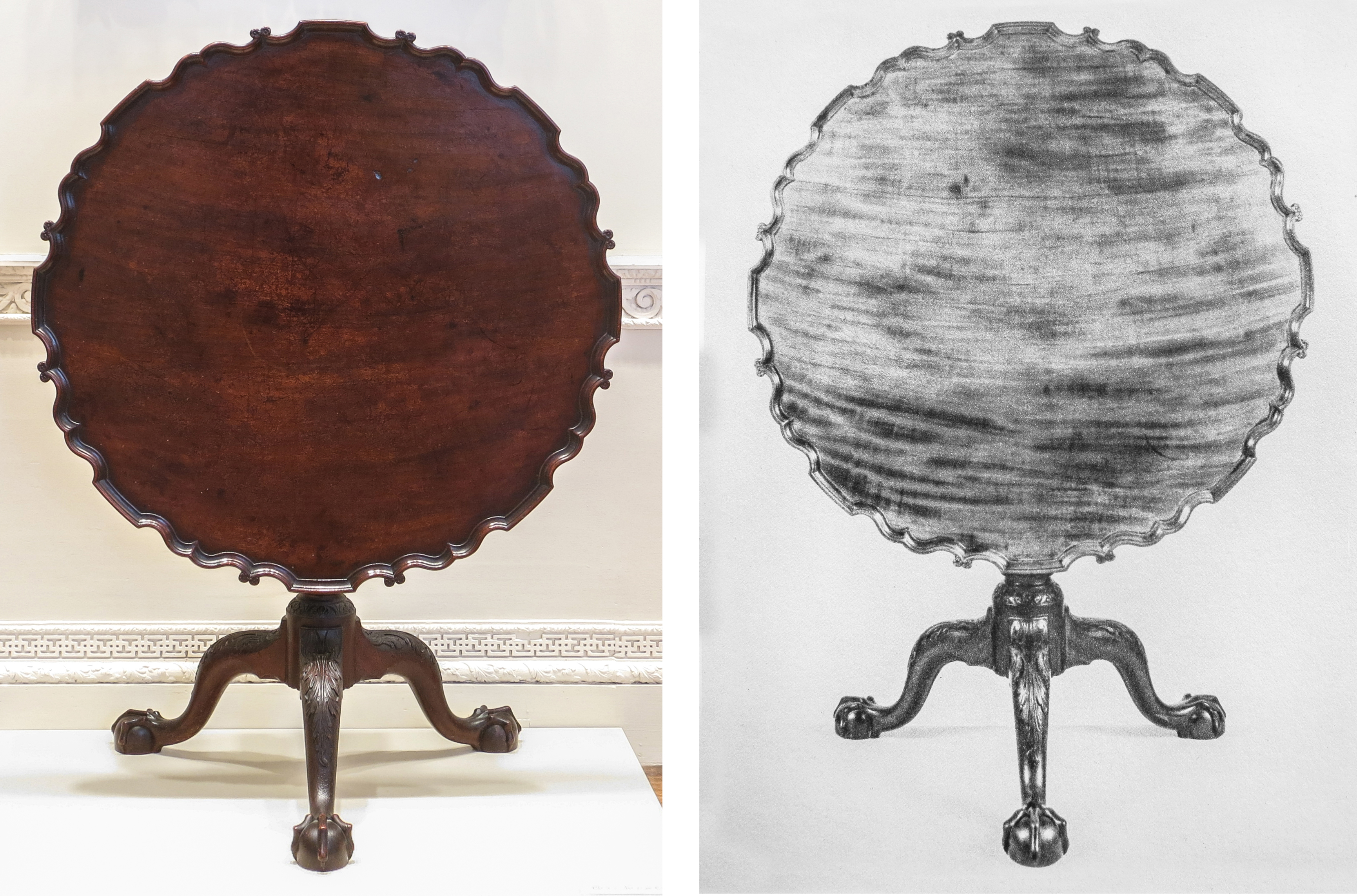 Examining other “pairs” of tables with similar degrees of elaboration located in institutions and sold in the marketplace, I was surprised to find matching tops occurring again and again. The table that sold this January in New York and its “pair” at the Metropolitan Museum of Art became one more set for me to add to this list (see the first image.) Two other “pairs” of tables are illustrated here (see the third and fourth images above.) It is possible to see, even with the effects of wear and differing surface coatings, that in each case the tops of all the “pairs” were flitch cut and would have been adjacent boards coming off the tree. Furthermore, the size of the top, the number and design of the segments of the scallops, and even the grain orientation when made into a table, corresponds in each “pair”. In addition, the wood of the tops in each “pair” is distinct, each set appears to have been cut from different trees or at least, quite different sections of a large tree. Lavishly embellished 18th century Philadelphia tea tables survive as singular examples and probate inventories do provide evidence that single tables were purchased in the 18th century. But without knowledge of original ownership and the survival of wills, probate inventories or bills, it cannot be determined if a mate to any of those tables has been lost to time or not yet discovered. What does appear relatively certain is there is not a third table that matches any of the pairs. If these tables were not bespoke as pairs, why would this be so? Was the mold broken after each set was made as other furniture historians have implied occurred in the design and production of abundantly decorated sets of 18th century Philadelphia chairs?