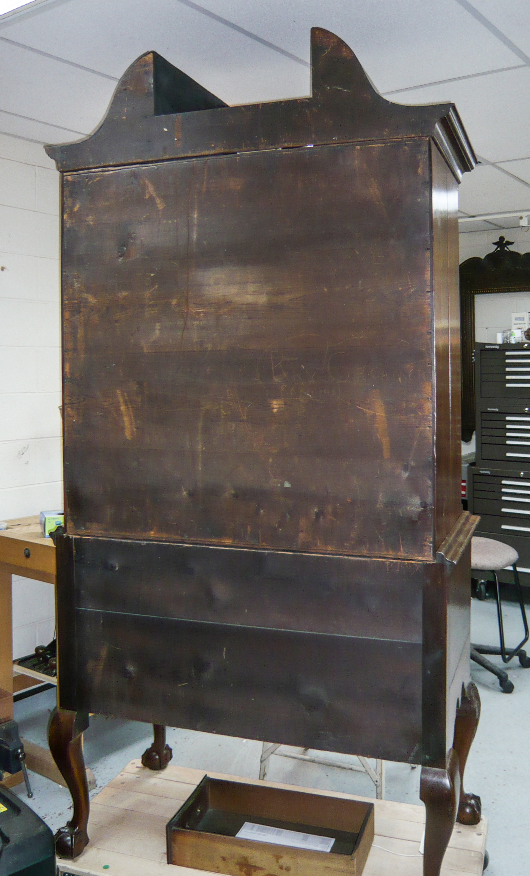 The covered scroll top of a high chest made in Philadelphia c. 1760 that is made as a third component of the chest, and lifts off, allows a rarely seen view of this form of construction.