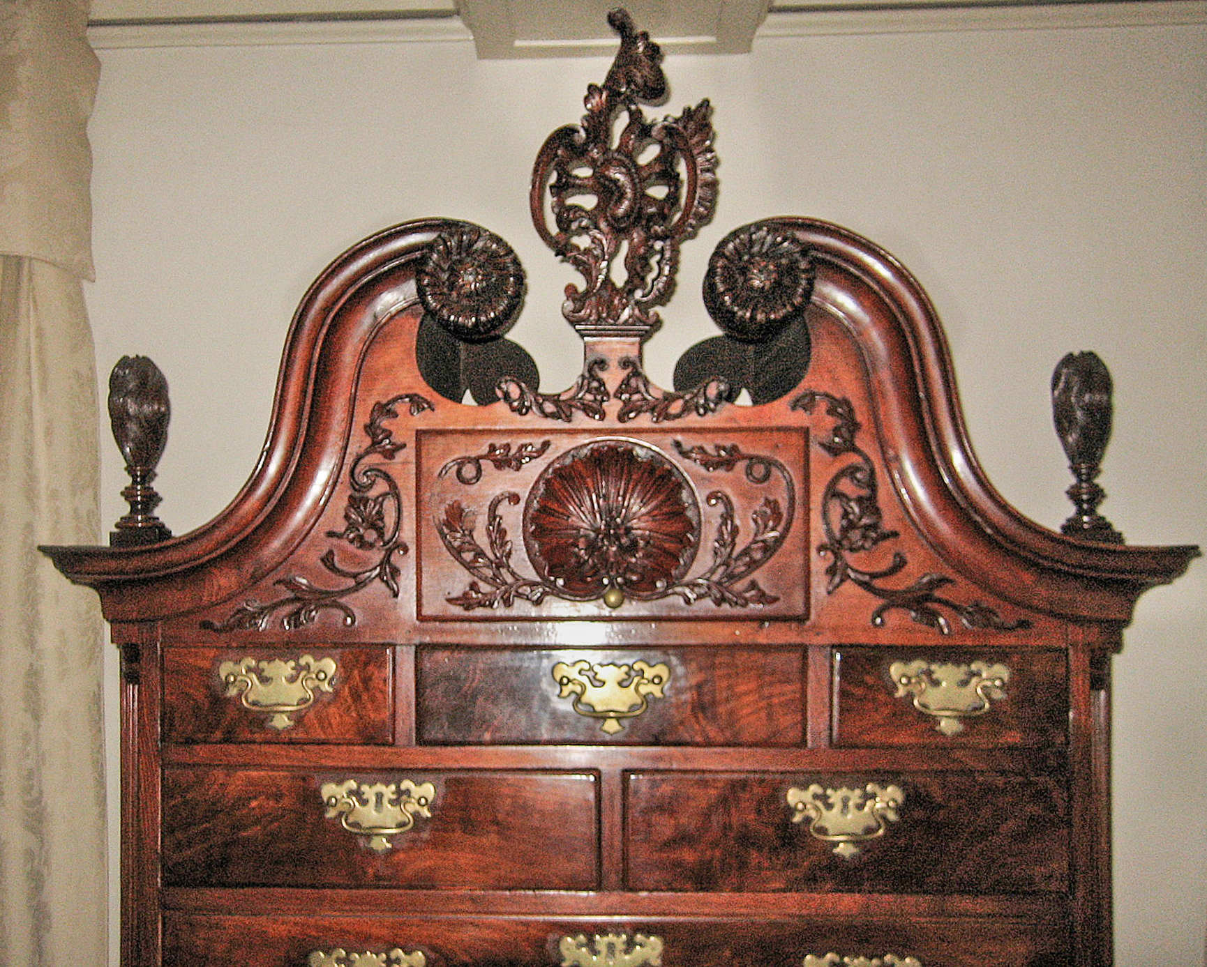 A comment on a previous post about enclosed bonnets on mid-18th century high chests cited another solution to their design. Instead of a flat board running front to back supporting the superstructure, a round, a roughly shaped bolt of yellow poplar or white cedar could be fit between the tympanum and the backboard which had been cut to match the profile of the tympanum. The thin “roof” boards were nailed to a rabbet in the bolt allowing a flush fit. This construction can be difficult to decipher from photographs where elements behind and above the scrolls appear as a dark mass due to accumulated dirt and the oxidation of the surfaces.