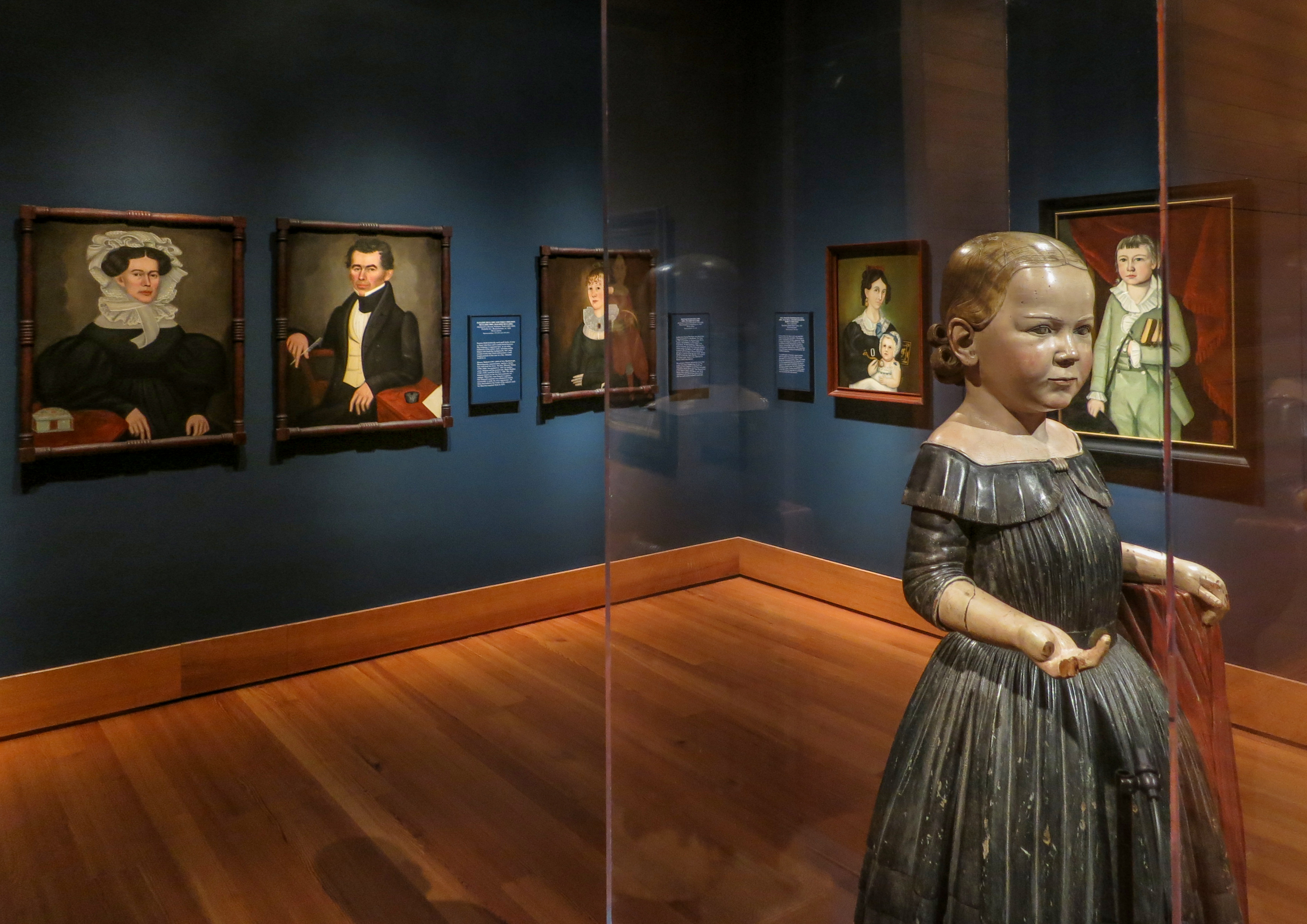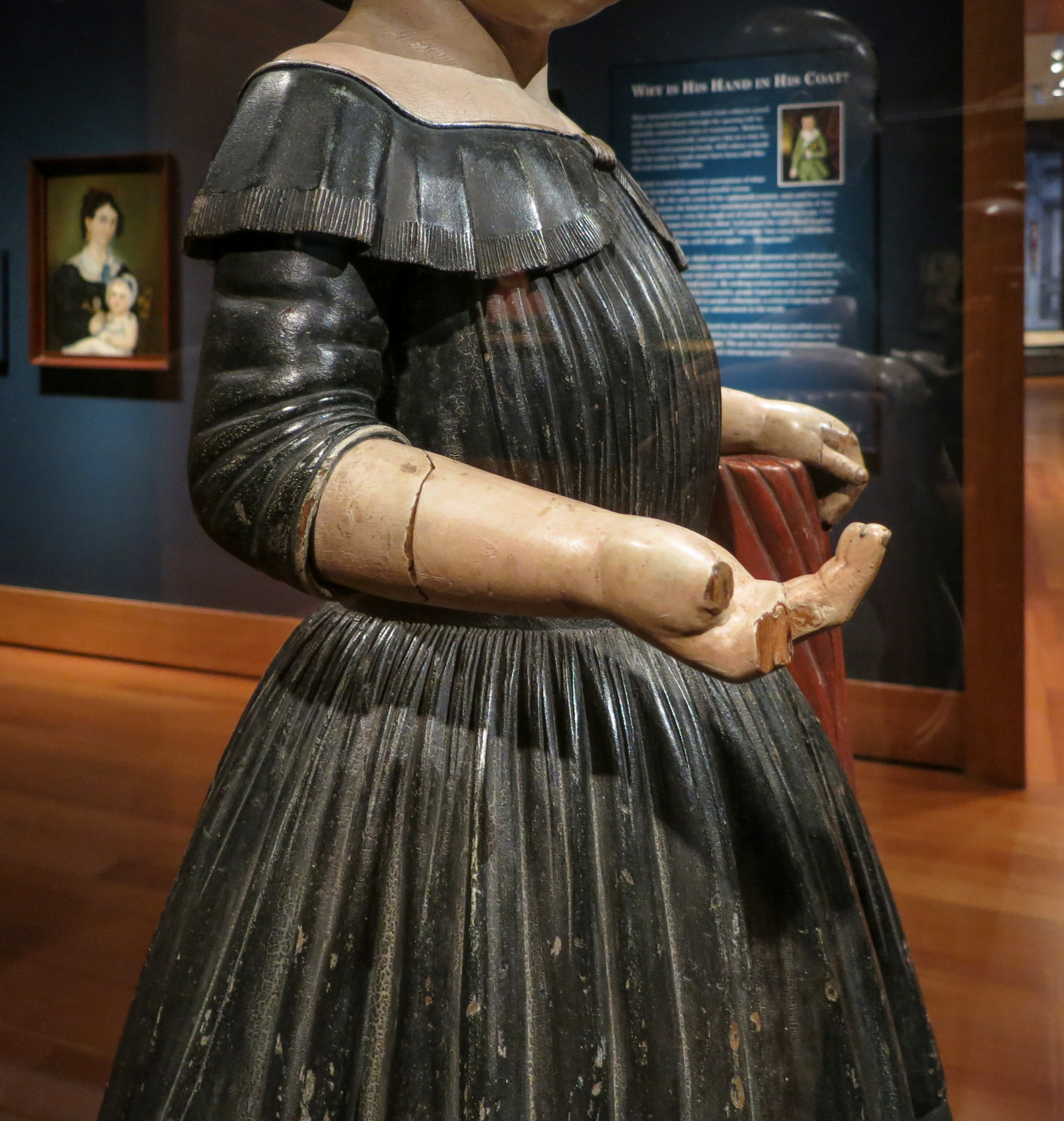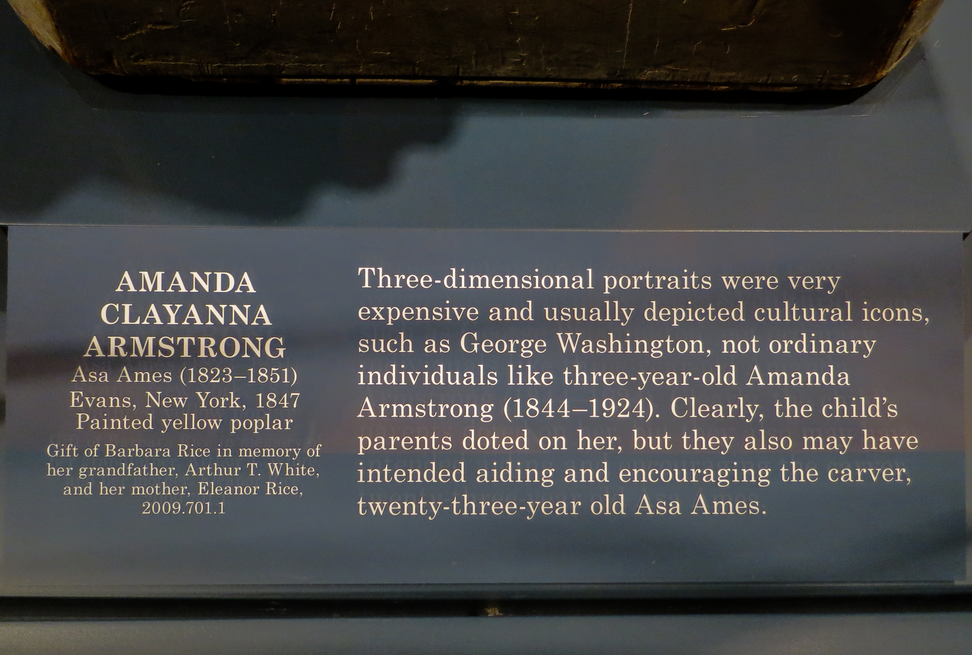 The 2015 “Working Wood in the 18th Century” conference was held in the auditorium of the DeWitt Wallace Decorative Arts Museum, Williamsburg, Virginia. Much of my free time was spent roaming the galleries of the museum. At times it felt like old home week as there was so much carved material from the early 18th to the early 20th centuries made in Philadelphia to examine. But I found myself returning to a full size figure carving in yellow poplar of a three year old girl Amanda Armstrong (1844-1924) by the 23 year old Asa Ames who died less than four years after carving Amanda’s portrait. As the label notes, full size carved portraits were typically reserved for leading citizens and cultural icons. So it was quite unexpected to come across Amanda’s startling portrait then have to consider the sad fact that I will likely never see any other carved work produced by Asa Adams.