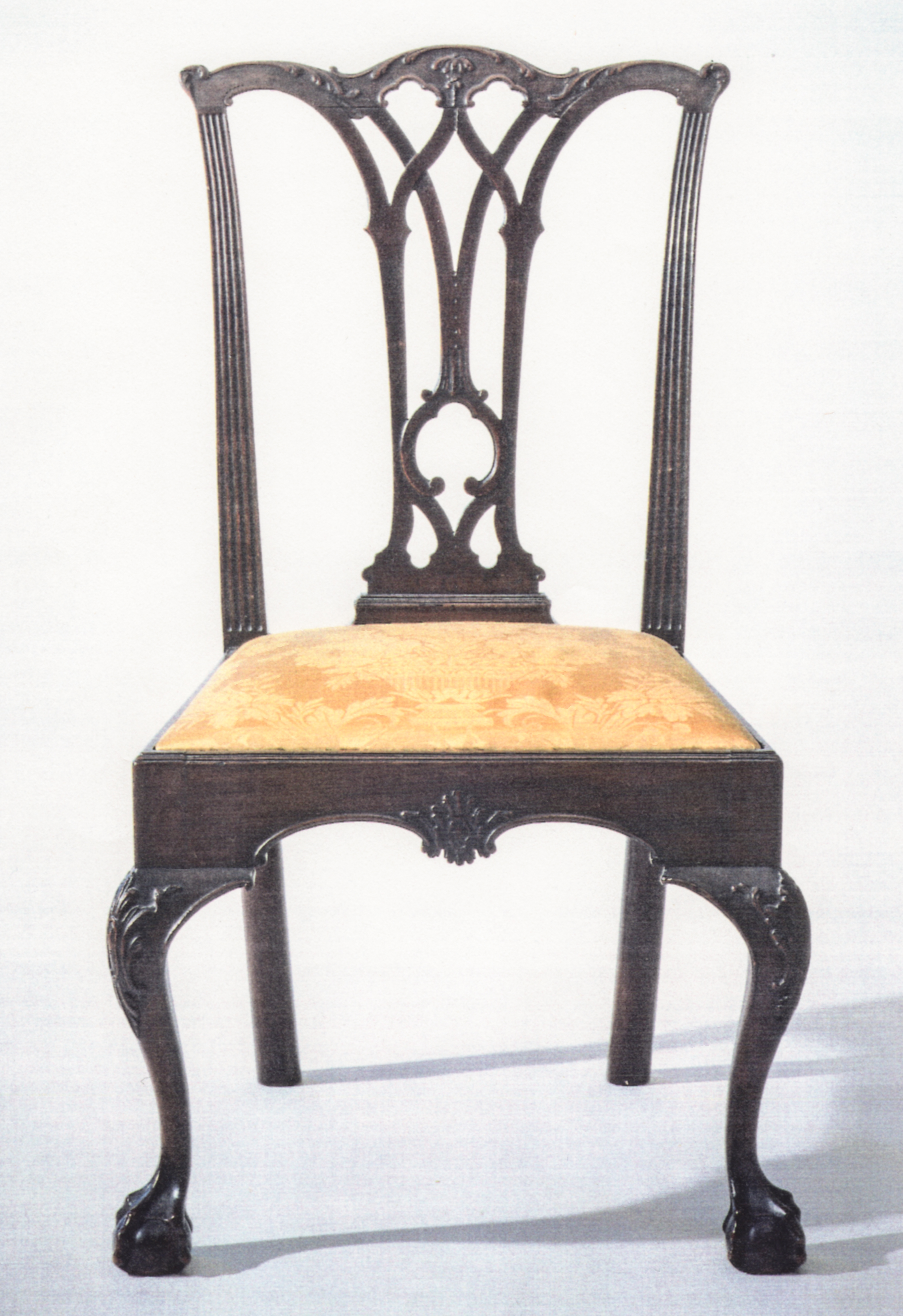 rear legThe surviving rear leg on the dressing table was used as a model for shaping and carving two new front legs and one new rear leg. While only the sides of the rear legs had carving on the knees, the carving on the front legs wrapped around the knee completing the bilateral design. The matching high chest base, known only from a magazine advertisement, was one source of information confirming the appearance of the original front legs of the dressing table.High chest base Equally important was the opportunity to examine  a pair of chairs in the collection of the Winterthur Museum that had entered that collection in 1957 with a tradition of ownership by Charles Carroll of Baltimore, Maryland. These chairs, and several others of the set in private collections, were most likely the chairs designed and made en suite with the dressing table and high chest base. If the Carroll provenance associated with the chairs holds up to future research, it would infer Carroll family ownership of the matching high chest and dressing table. One chair of this pair at Winterthur bears the same version of Thomas Tufft’s label pasted into drawers of the high chest and dressing table at the Philadelphia Museum of Art. (see Charles F. Hummel. A Winterthur Guide to American Chippendale Furniture, Middle Atlantic and Southern Colonies, Winterthur, 1976, pgs. 66-67, figs. 58, 58a.)