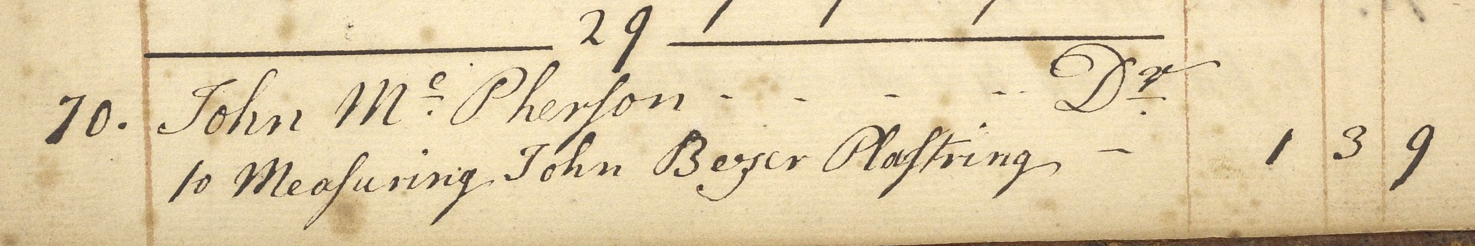 At the end of the month, on May 29th, 1765, Nevell charged Macpherson £1.3.9 for measuring the completed interior plastering work done by John Bezer.
