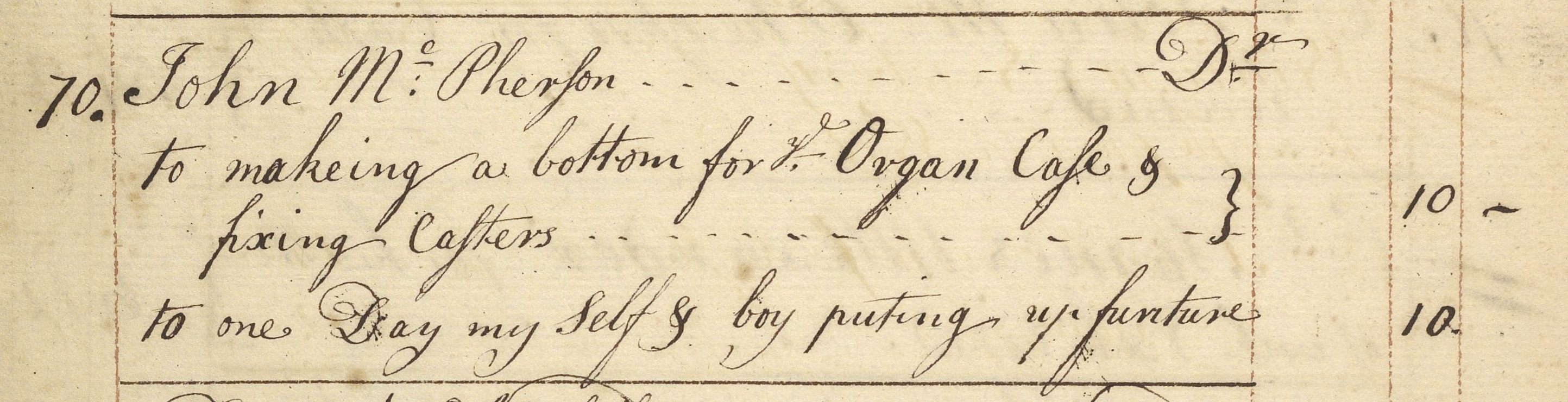 On May 18th Nevell and a young apprentice spent one day “putting up furniture” at Mount Pleasant and the same day Nevell charged Macpherson for “making the bottom for the organ case & fixing casters.”