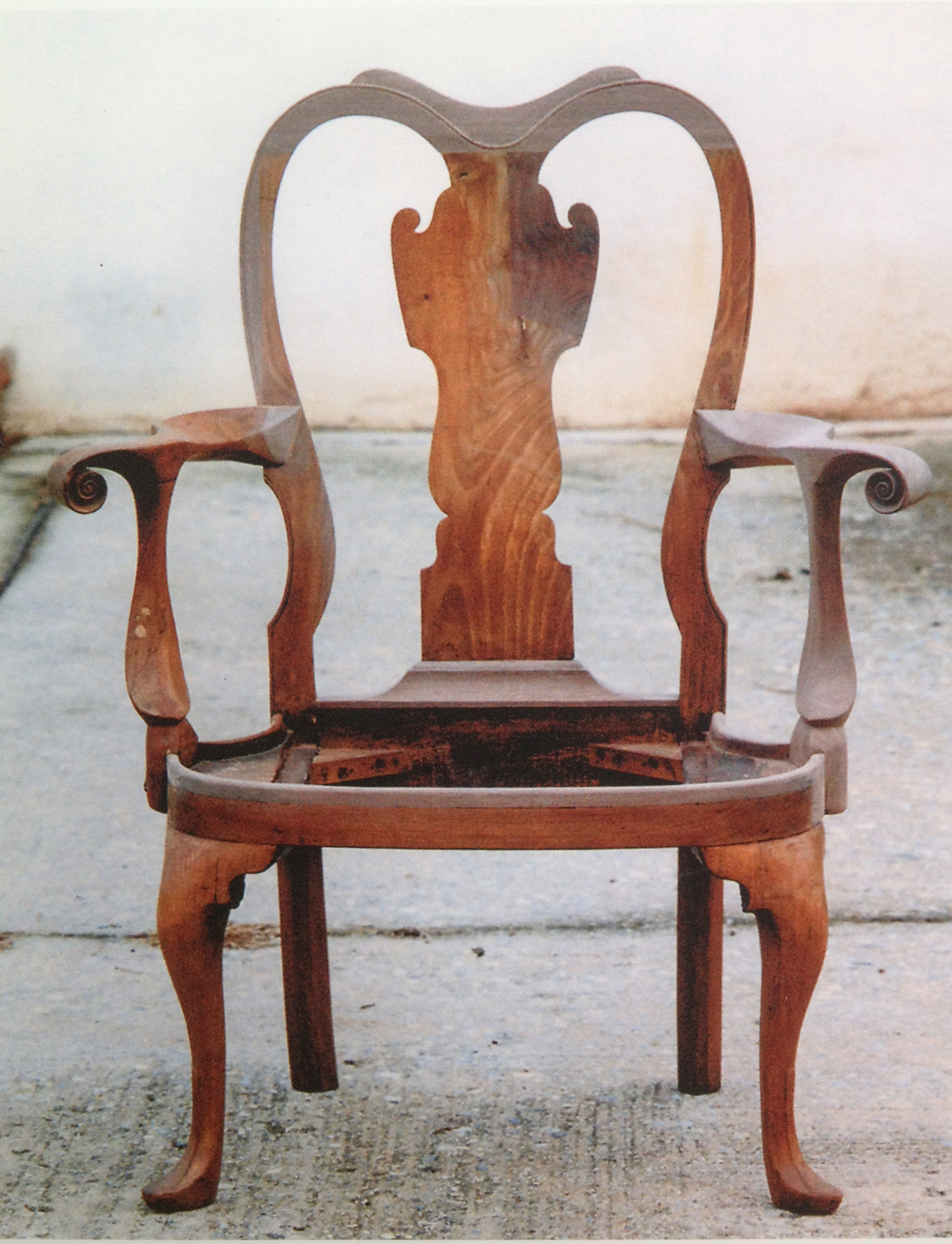 As I began to work on the chair, researching an appropriate crest design, patterning the arm and arm support, and choosing walnut whose grain and texture best matched the chair, I had a nagging thought that wouldn’t go away – that I had seen the chair before. I think it was most strongly felt during the difficult process of finding a piece of wood that would match the grain of the splat. Even though pith was present in the board used for the splat and it was not difficult to see why it would have broken at such a fragile point, it was an unusually shaped loss.