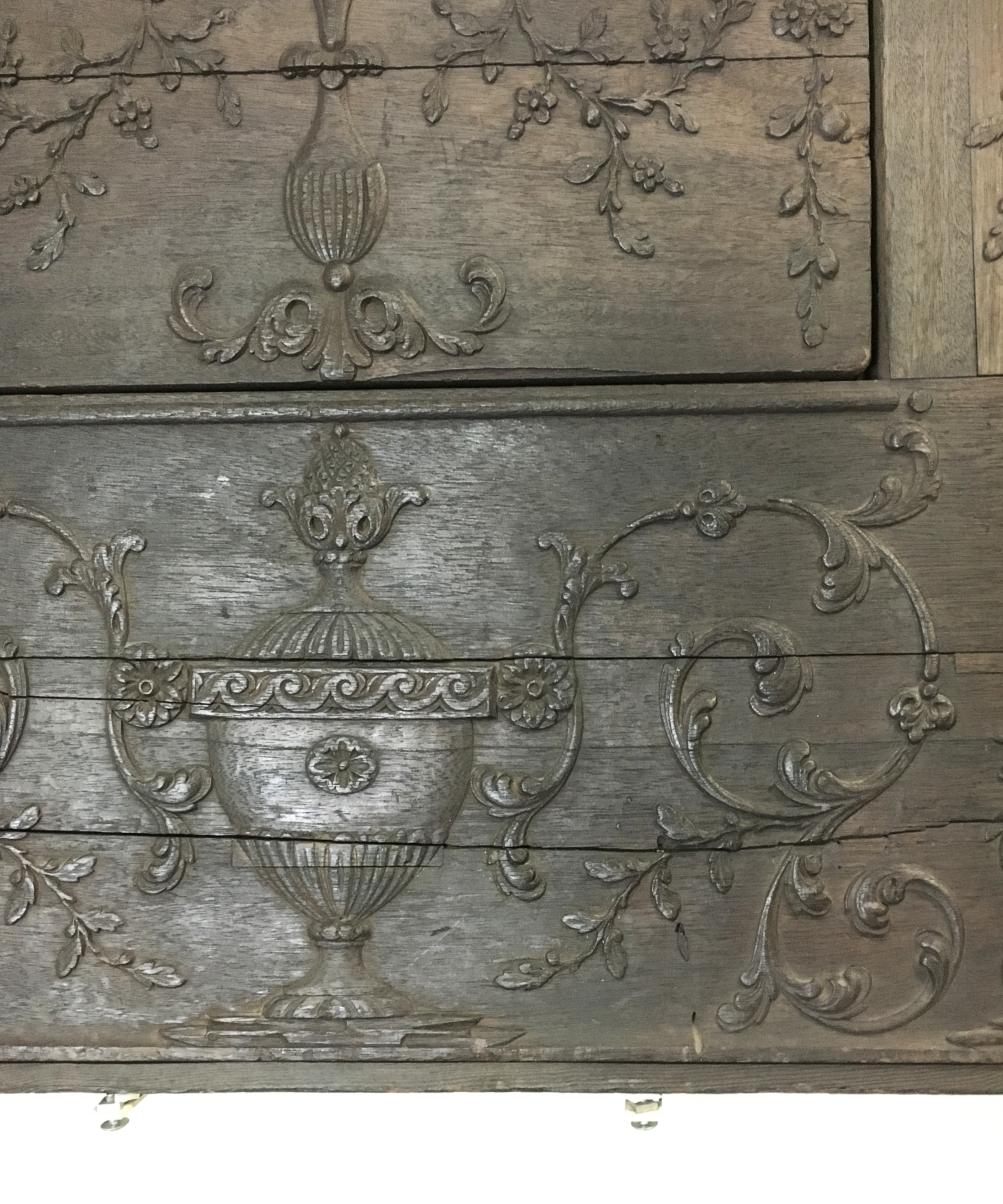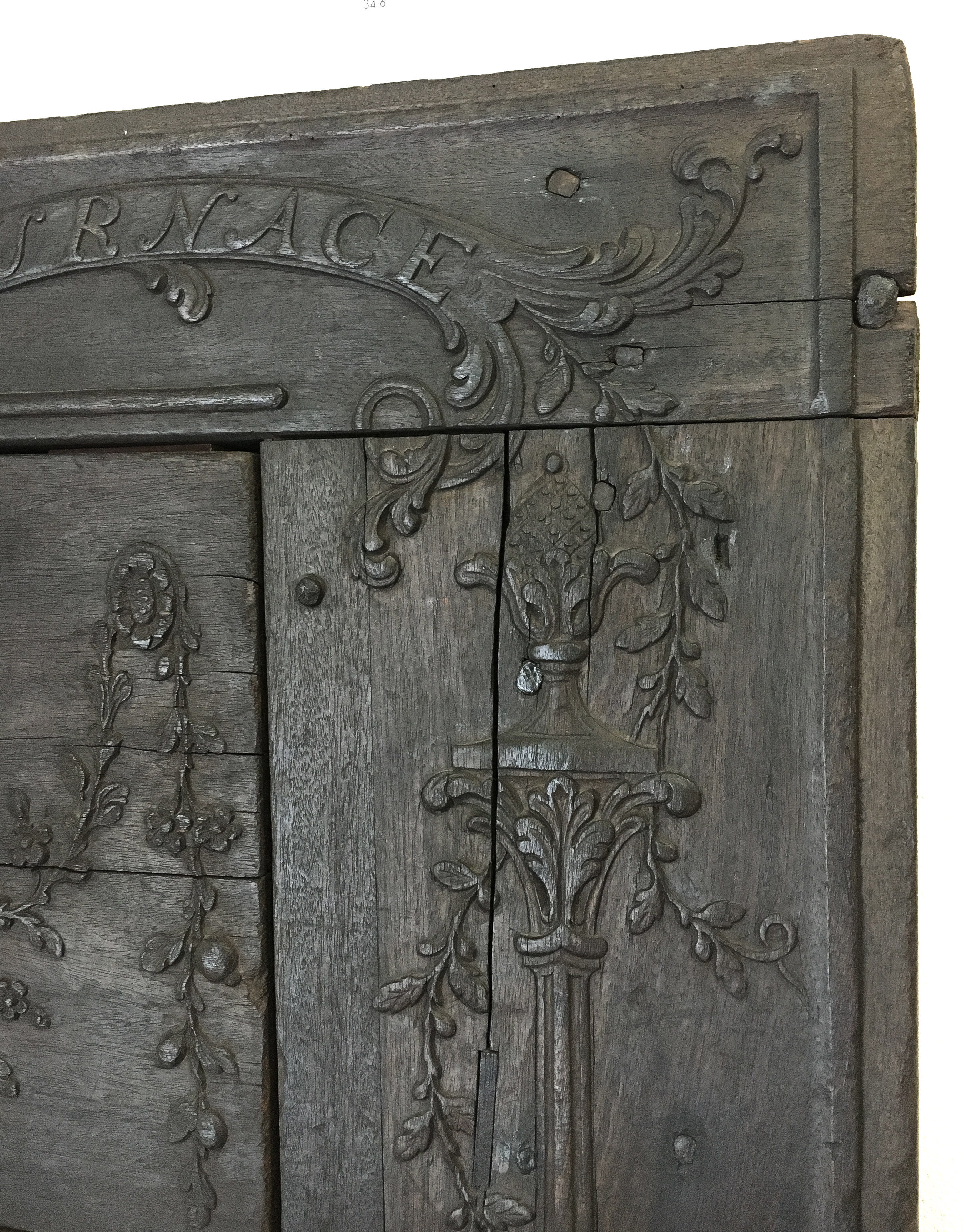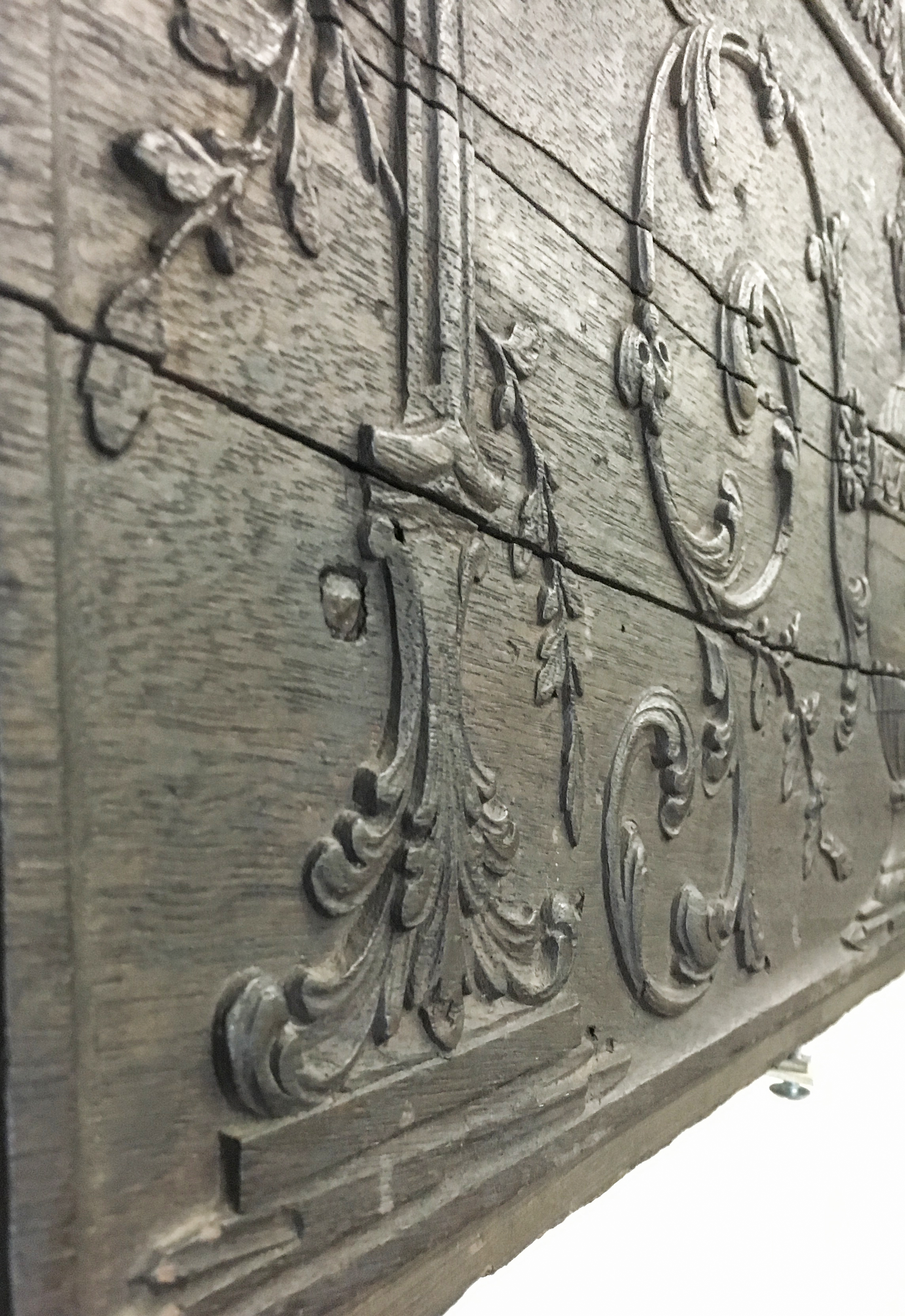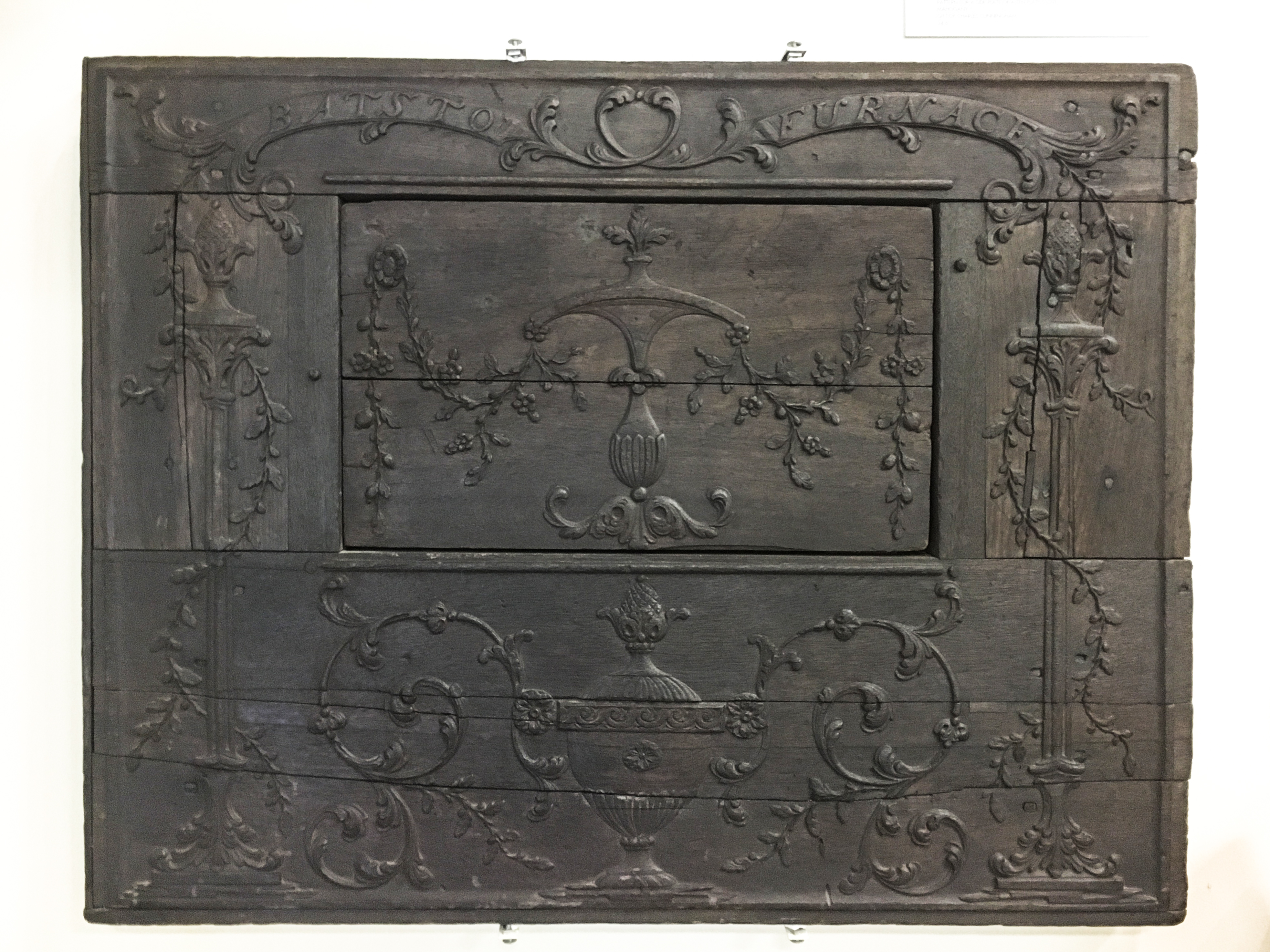 I recently spent the day working at the Burlington County Historical Society in Burlington, New Jersey. While there I was able to examine and photograph what is, for me, one of the treasures of their collection – a carved-wood pattern used to produce one side of a ten-plate cast iron stove. A small number of complete cast-iron stoves along with numerous chimneybacks and disassociated stove plates made in the Philadelphia region during the second half of the eighteenth century survive, but less than a handful of the carved wood patterns used to make an impression in moist sand into which the molten steel would be cast are extant. Primarily produced in furnaces in the Schuylkill Valley and West Jersey, or South Jersey as it is known today, six-plate stoves were introduced about 1760 and ten-plate stove were probably being made by the early 1770s.