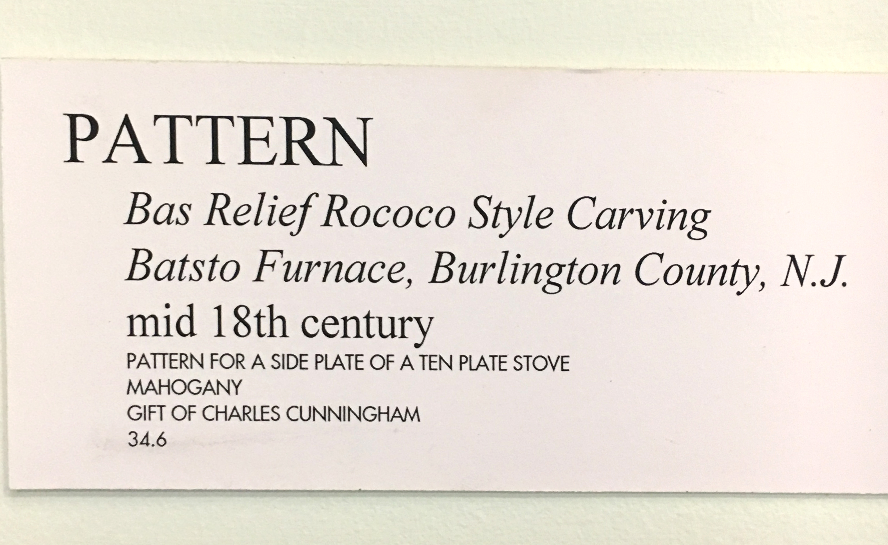 More information and photos of the carved mahogany stove plate pattern at the Burlington County Historical Society.