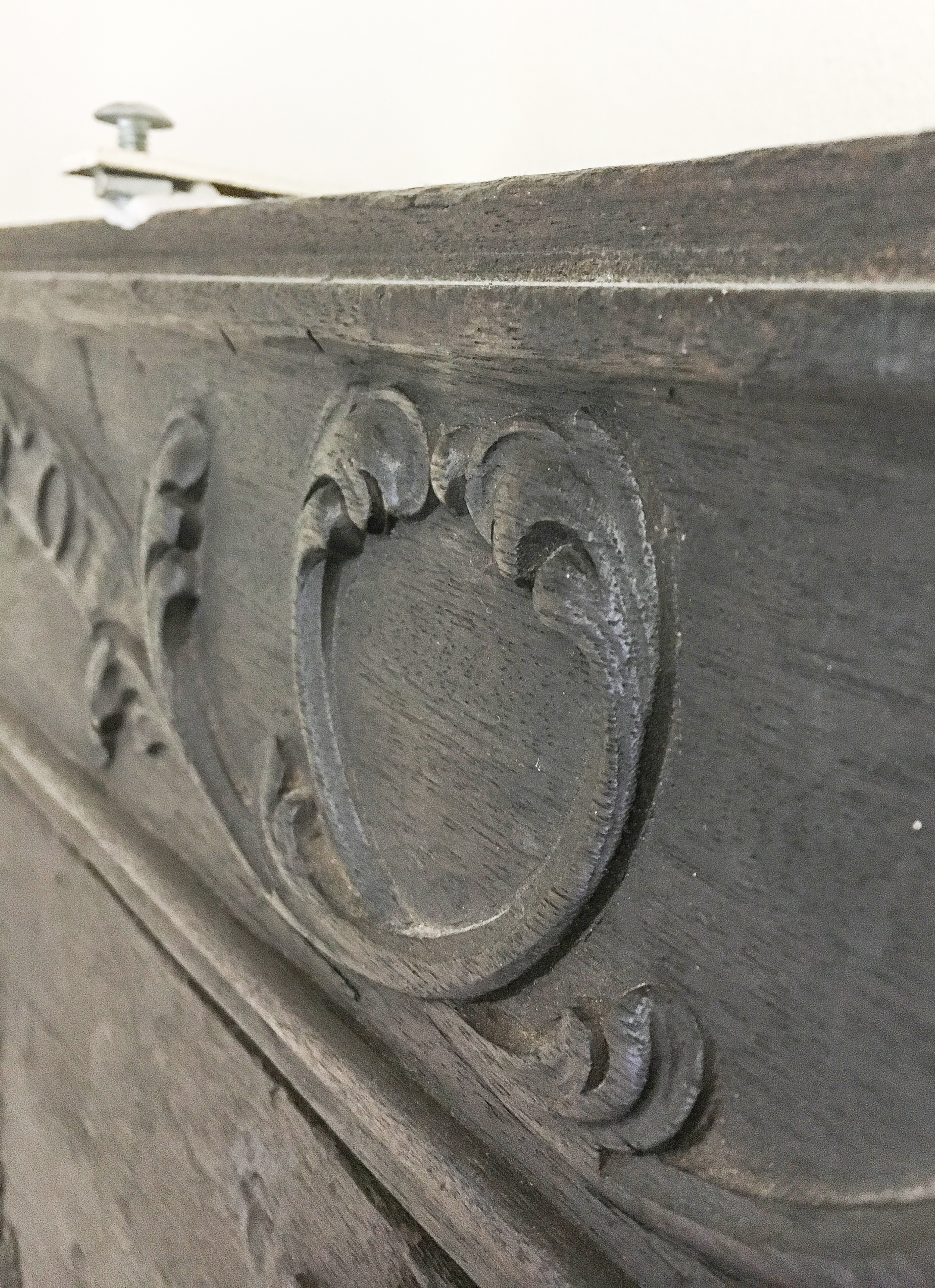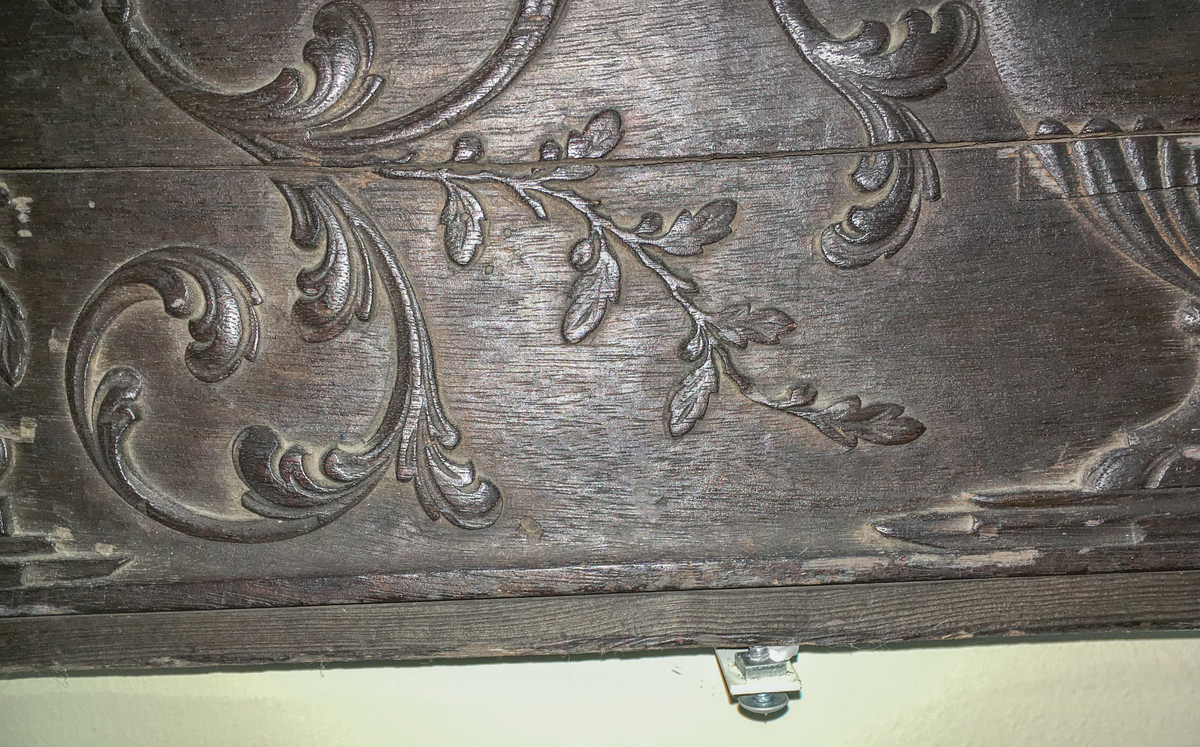 The size of the pattern is 26 inches high and 33 inches wide. The ground of the relief carving is on the shy side of 5/16 of an inch below the upper surface. I don’t believe a router was used to lower the background. It’s difficult to see in the photographs but the ground has an undulating surface, even with some areas of slight tear-out as the flat carving gouge used to produce the ground was worked across the grain, the carver knowing the tear-out would disappear in the iron casting.