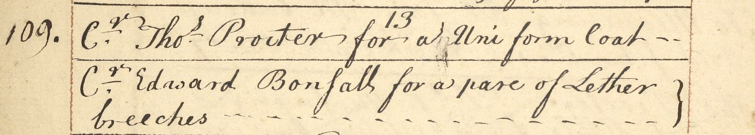 On February 13, 1776 Thomas Nevell credited Thomas Proctor for a “Uniform Coat” and Edward Bonsall for a “pair of Lether breechs”. July was six months off but the Continental Congress had previously met in Philadelphia at Carpenters’ Hall, which Nevell had helped design and build, in 1774 and 1775. In December 1775, John and Margaret Macpherson’s son John had been killed in the Battle of Quebec, perhaps the first commissioned officer from Philadelphia to die during the Revolution. Nevell anticipated war and readily took up the patriots cause, serving for several years as an officer in the Continental Army. He ordered and paid for his own blue coat and leather pants, the uniform of the day. A uniform we have all been reacquainted with thanks to a extraordinary recent Broadway play.