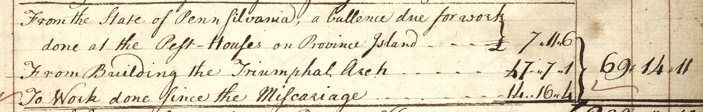 In 1784 Nevell was given a last, large project by the State of Pennsylvania, building Charles Wilson Peales Arch of Triumph across Market Street celebrating the end of the war. We will leave that story, and the story of its “miscariage” for another time.