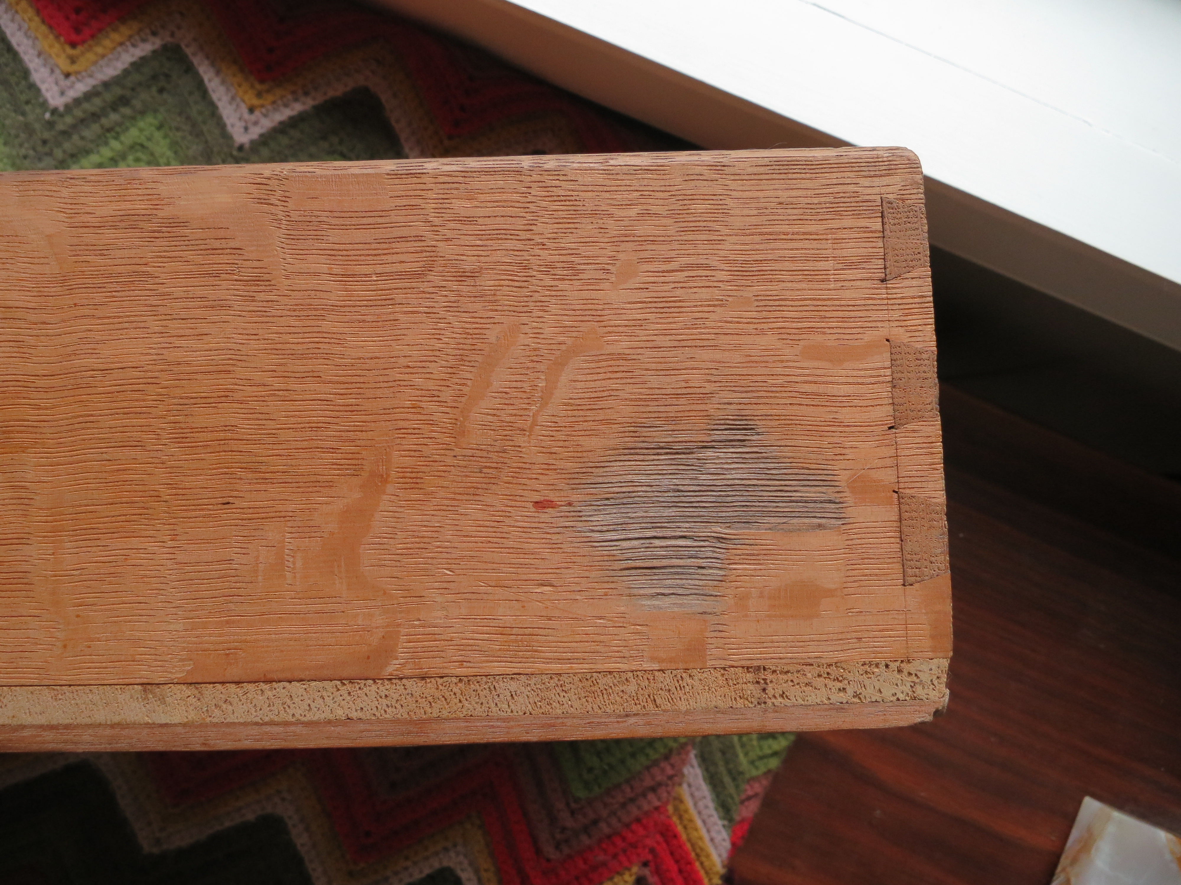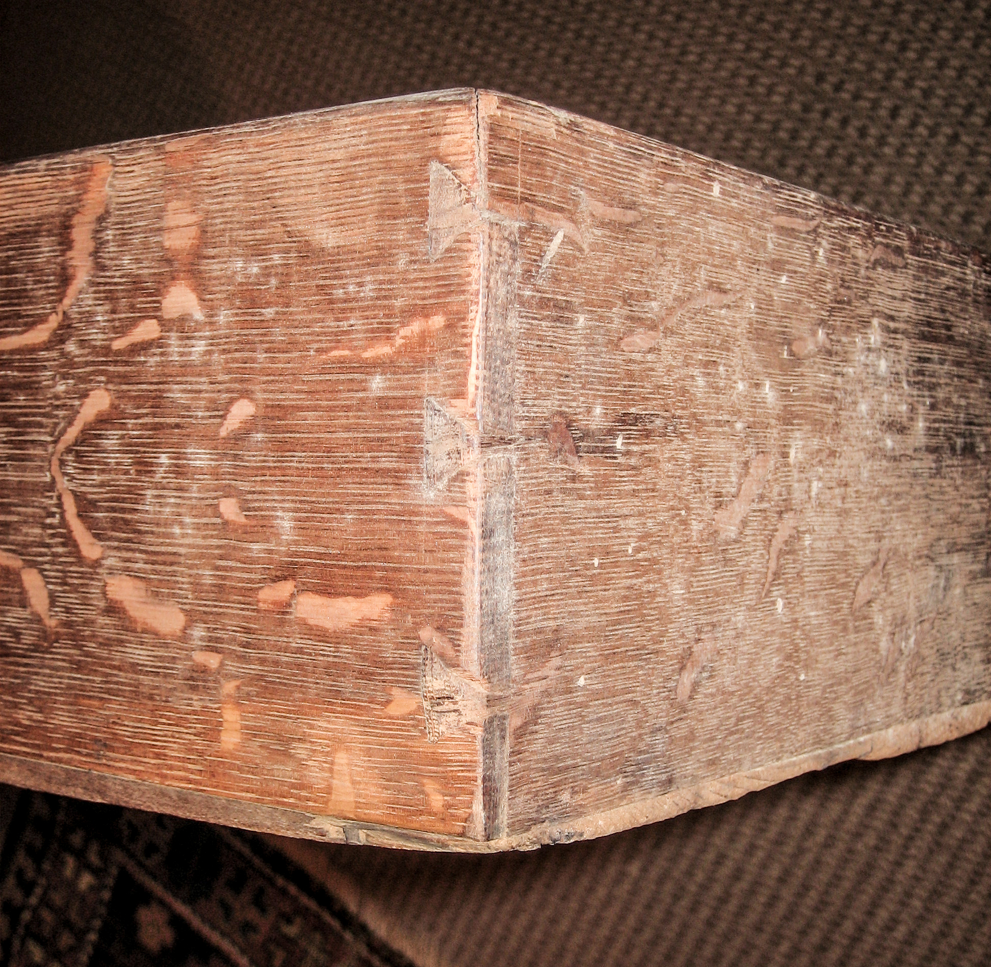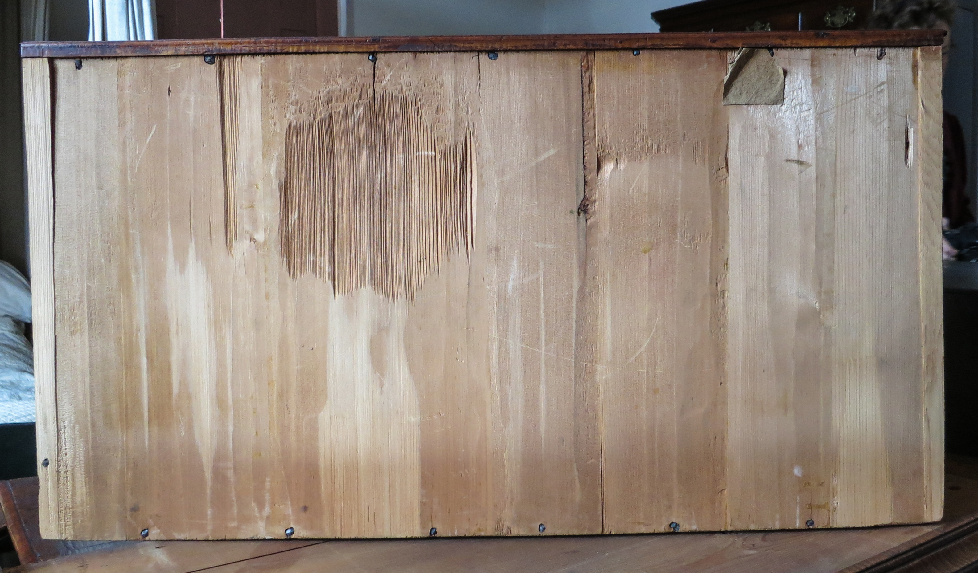 Chest of drawers, made in the Delaware River Valley, c. 1720. Another drawer from the framed chest with side hung drawers showing split grain that was not planed because of the changing grain direction.