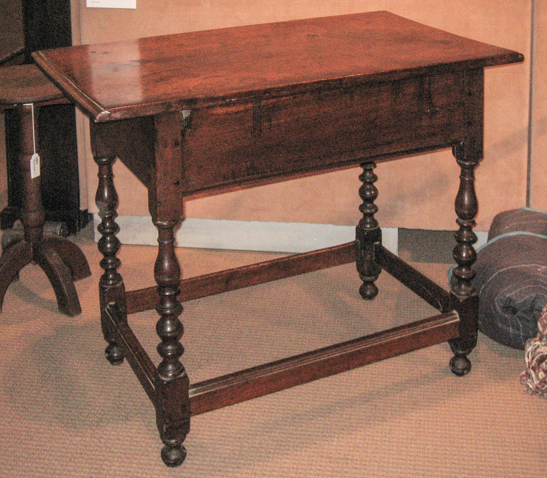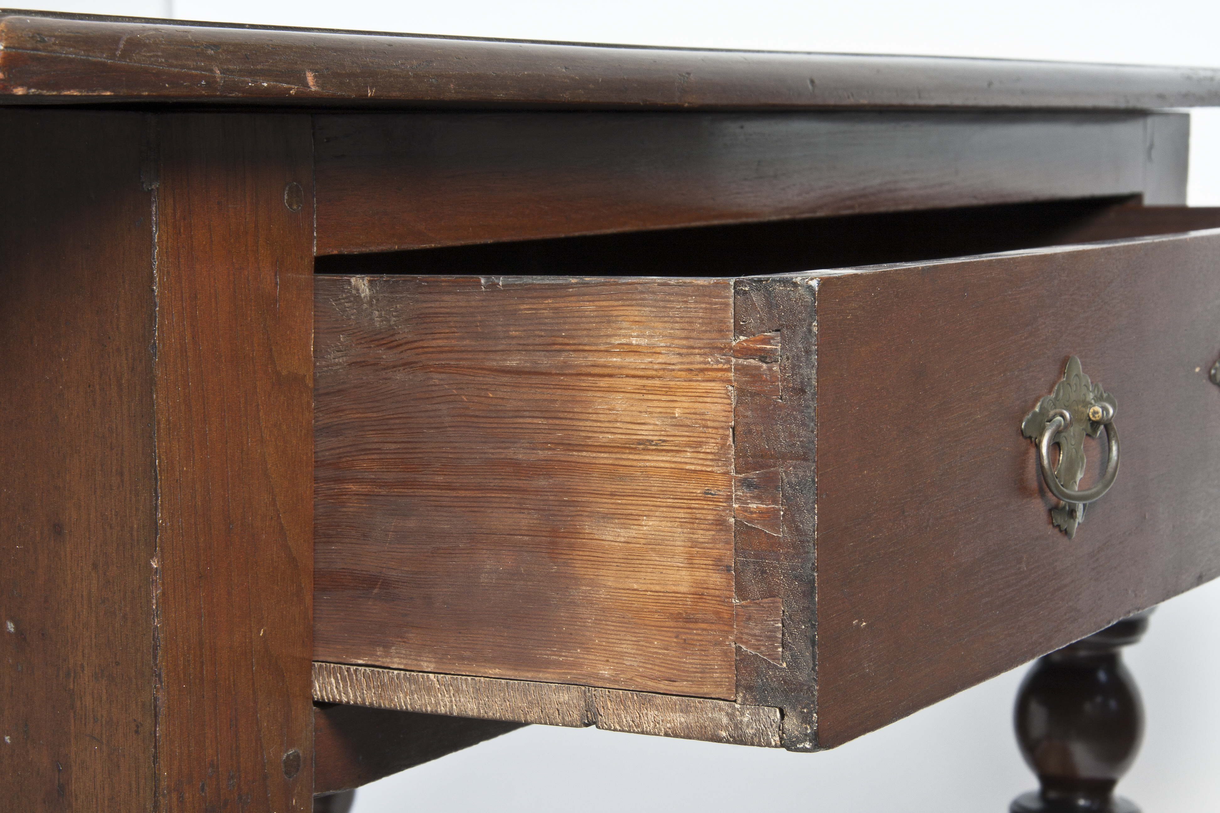 Table with drawer. Made in Philadelphia, c. 1710. Black walnut, hard pine. The only secondary wood of this early Philadelphia table is hard pine used for the drawer sides, back, and bottom.