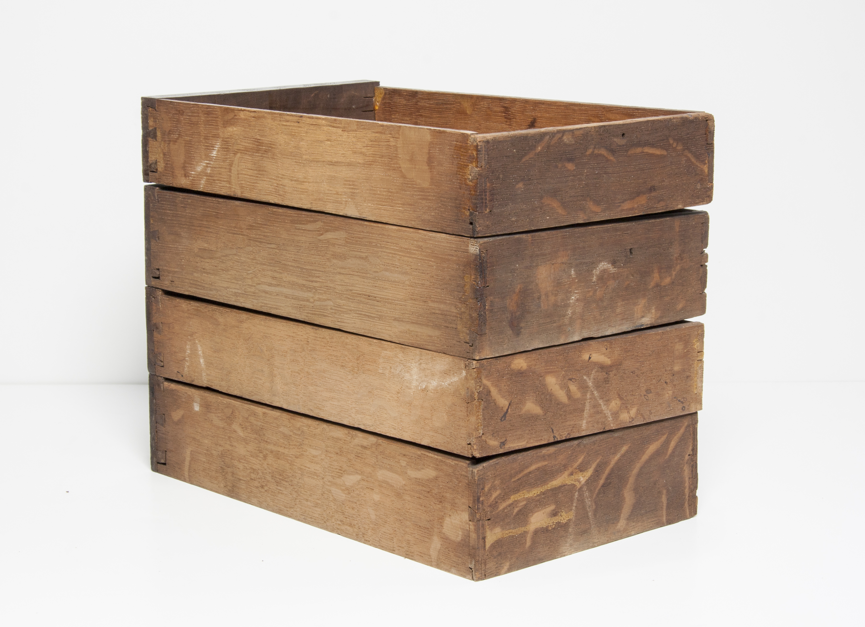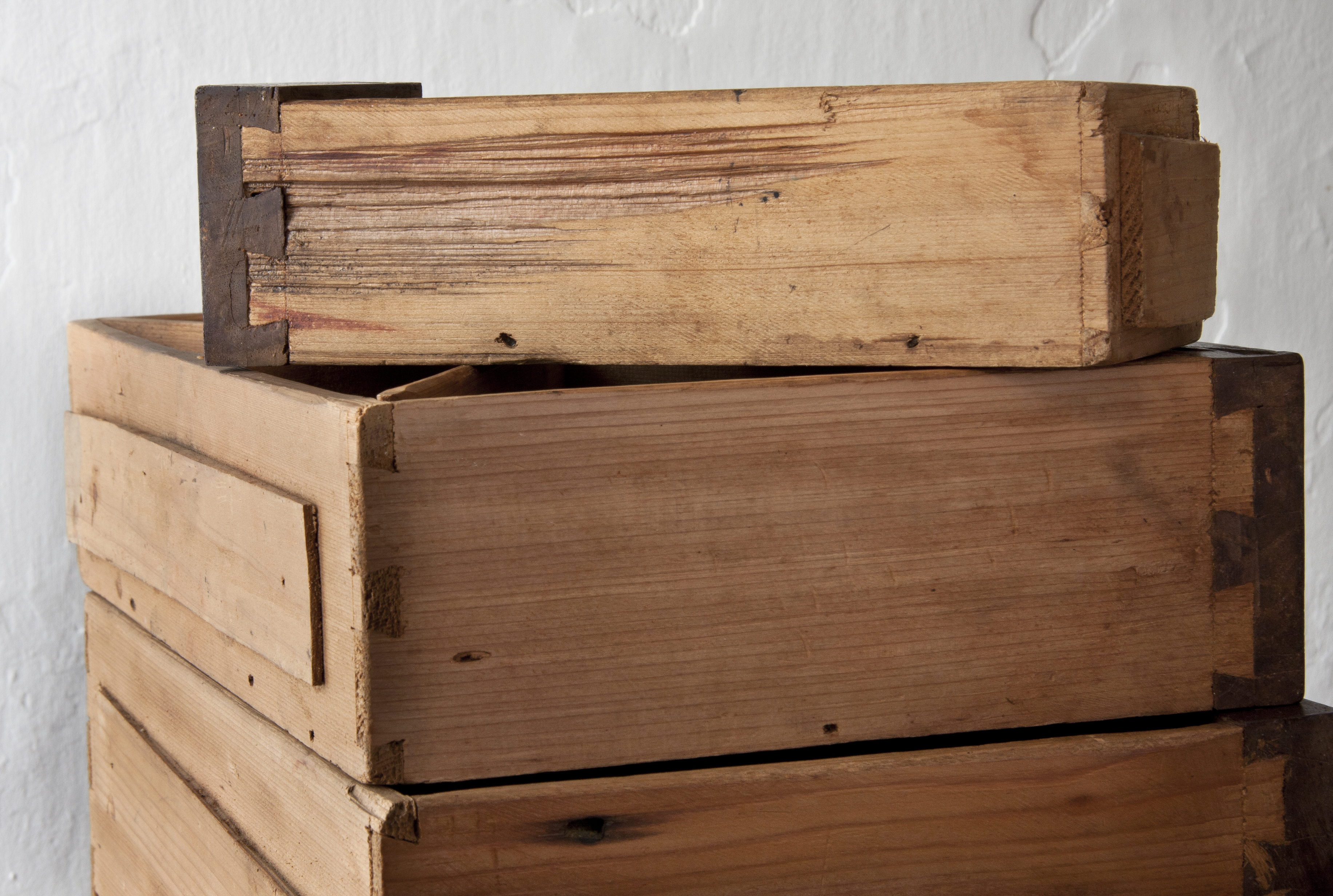 Interior drawers from a Delaware River Valley desk and bookcase c. 1740. The thin sides and backs of all the small drawers of the desk and bookcase interiors are riven white oak. The sides and backs of the long drawers of the desk are hard pine.