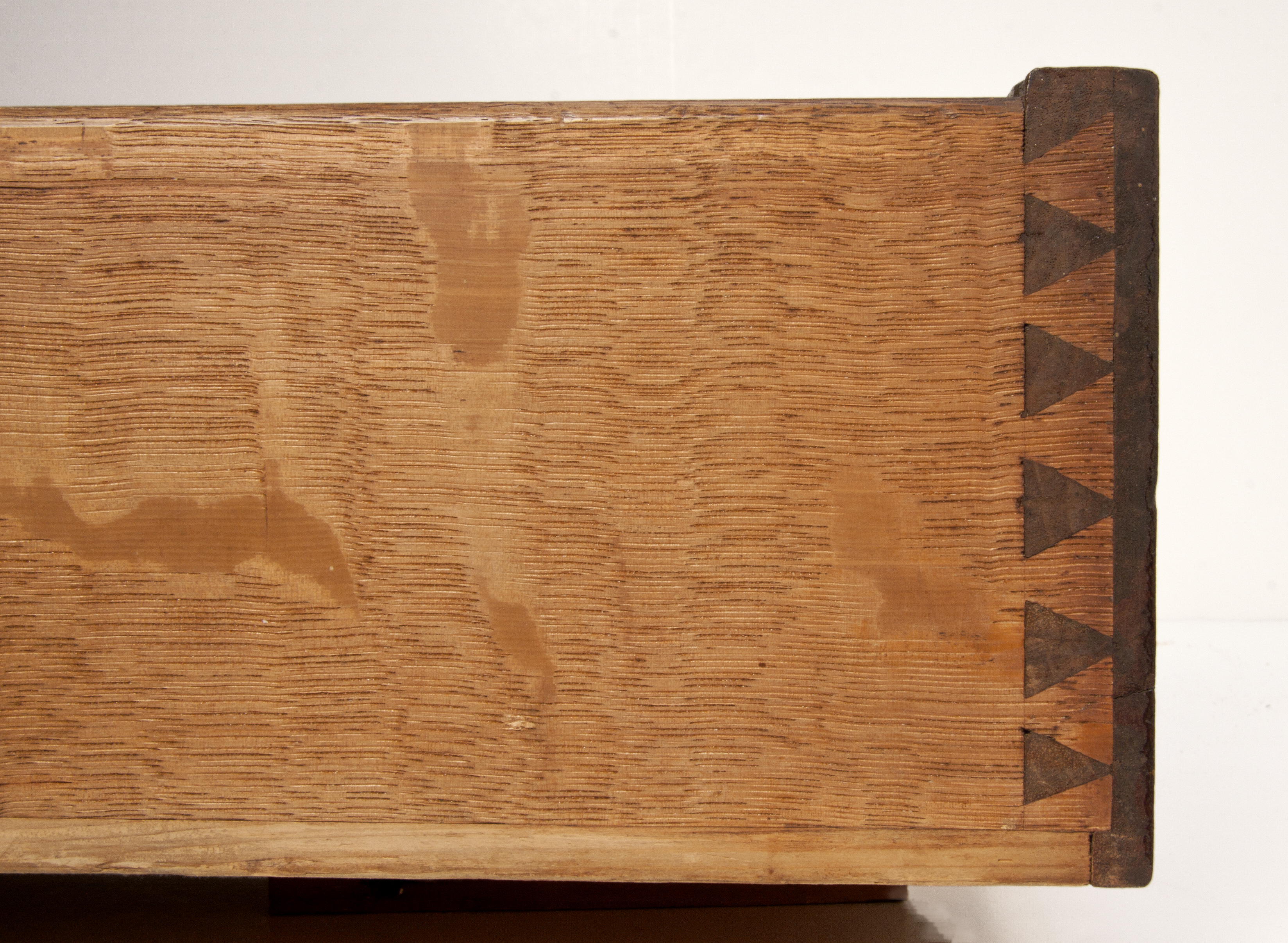 Chest of drawers. Made in the Delaware River Valley, c. 1720. The drawers of this framed chest are side hung, a relatively rare drawer construction in Delaware River Valley furniture. All three local secondary wood species are used in one drawer, white oak for the sides, hard pine for the back, and Atlantic white cedar for the bottom.