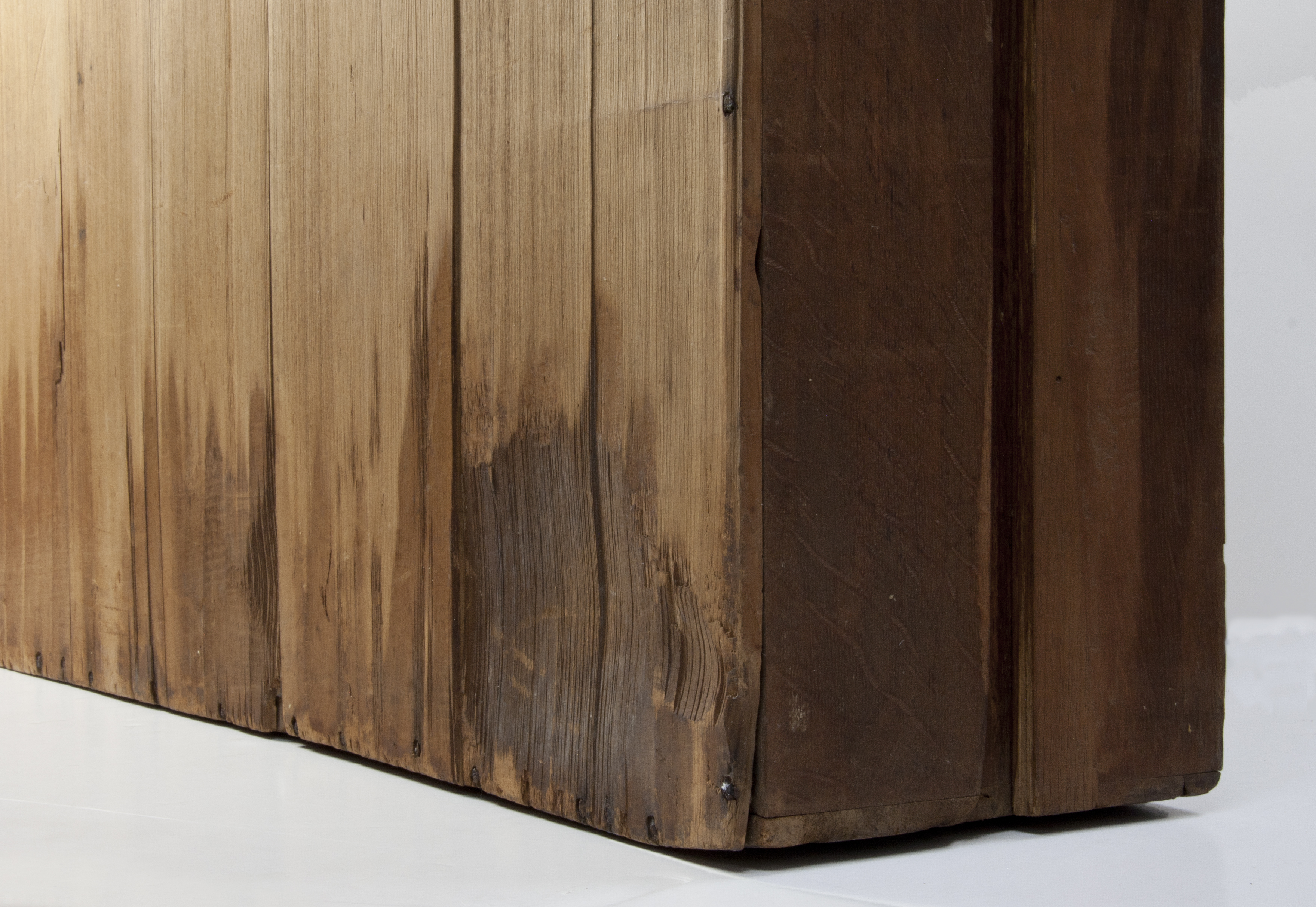 Chest on chest. Made in the Delaware River Valley, c. 1738. Black walnut, white oak, Atlantic white cedar, yellow poplar. Split grain is sometimes seen on outer surfaces of riven white oak drawer sides and backs. In this case, the riven board weathered to gray before it was planed during construction of the drawer.
