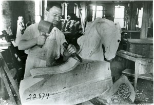 The Germantown neighborhood of Philadelphia, where Dan had his studio on Tulpehocken Street, has a history of intense activity in the woodworking trades, especially from the last quarter of the nineteenth century into the middle of the twentieth. The Dentzel Carousel Company, established in 1867 – at several locations on Germantown Avenue – and the Philadelphia Toboggan Company, established in 1904, later purchasing the Dentzel Company in 1928 – at 130 East Duvall Street – left a legacy of excellence in the creation of carved carousel animals. Dentzel had been absorbed by the Philadelphia Toboggan Company by the time of Dan’s arrival in the early 1960’s but the Philadelphia Toboggan Company would not leave Germantown for Lansdale, Pennsylvania until 1971 and there were still several carving and turning shops producing traditional work throughout the neighborhood during Dan’s time here though they are gone today. (Today Germantown has a thriving arts scene that includes contemporary furniture makers.)