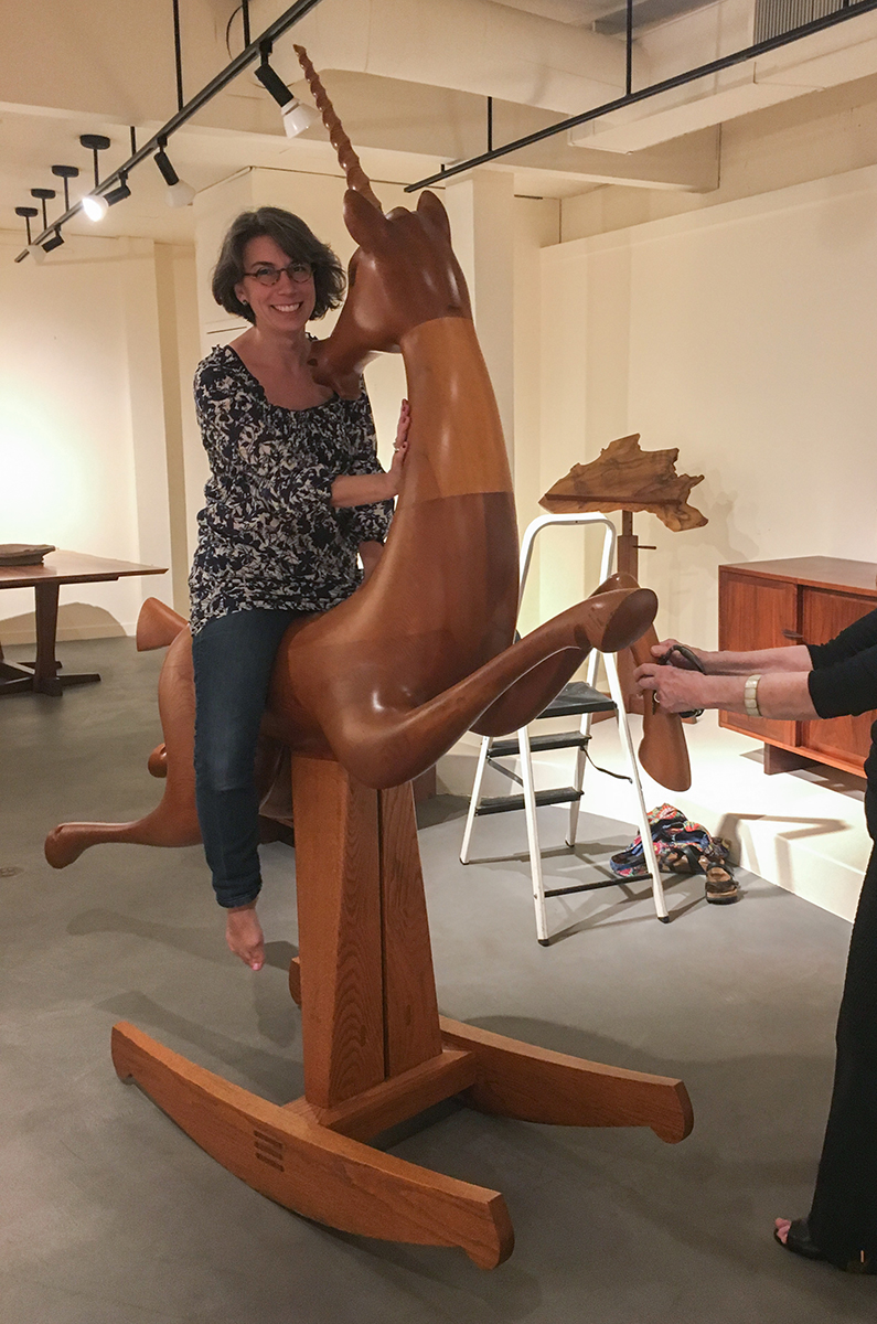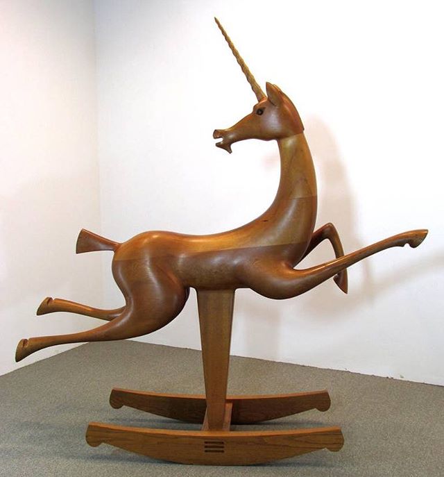 There is presently a rare opportunity to see the work of Daniel Kemper Jackson (October 18, 1938- August 3, 1995) in person. Dan’s Rocking Unicorn is on currently on display at the Moderne Gallery, 111 North Third Street, Philadelphia. A public viewing has not been possible since its creation in 1974. It was a private commission and was not included in the 2003 exhibition “Daniel Jackson: Dovetailing History” at the University of the Arts, the present name of what had been the Philadelphia College of Art when Dan taught there from 1964 to 1976. Dan made two previous carved rocking animals, in 1971 a rocking horse for his daughter Sophia and a rocking peacock in 1973. In scale and volume, the Unicorn rocker is the largest work Dan produced – it is 73 inches high, 76 inches long, and 15 inches deep – as well one of his last.