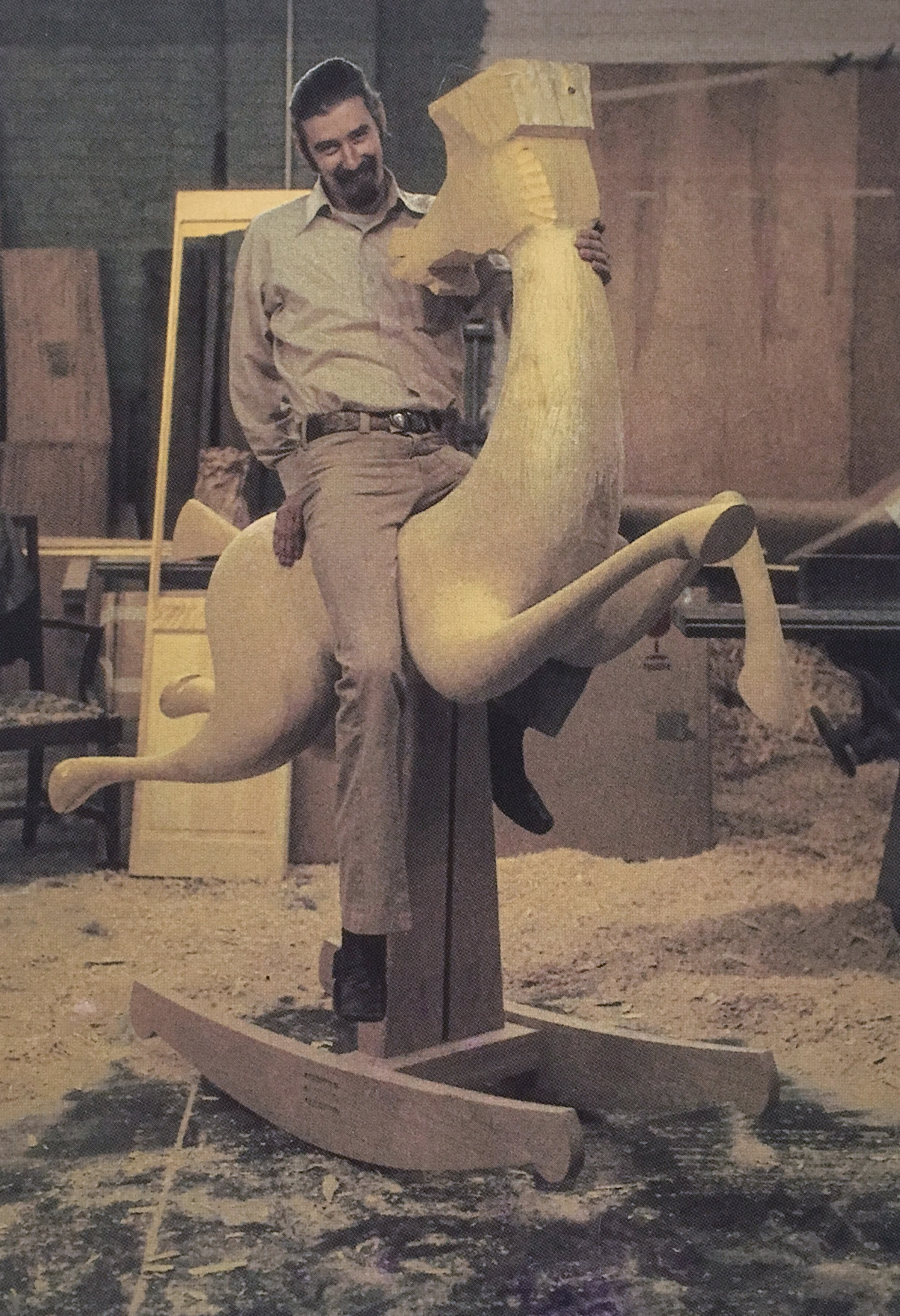 Dan Jackson in his studio during the making of the Unicorn Rocker. From “Daniel Jackson: Dovetailing History”, The University of the Arts, 2003. No photo credit given.