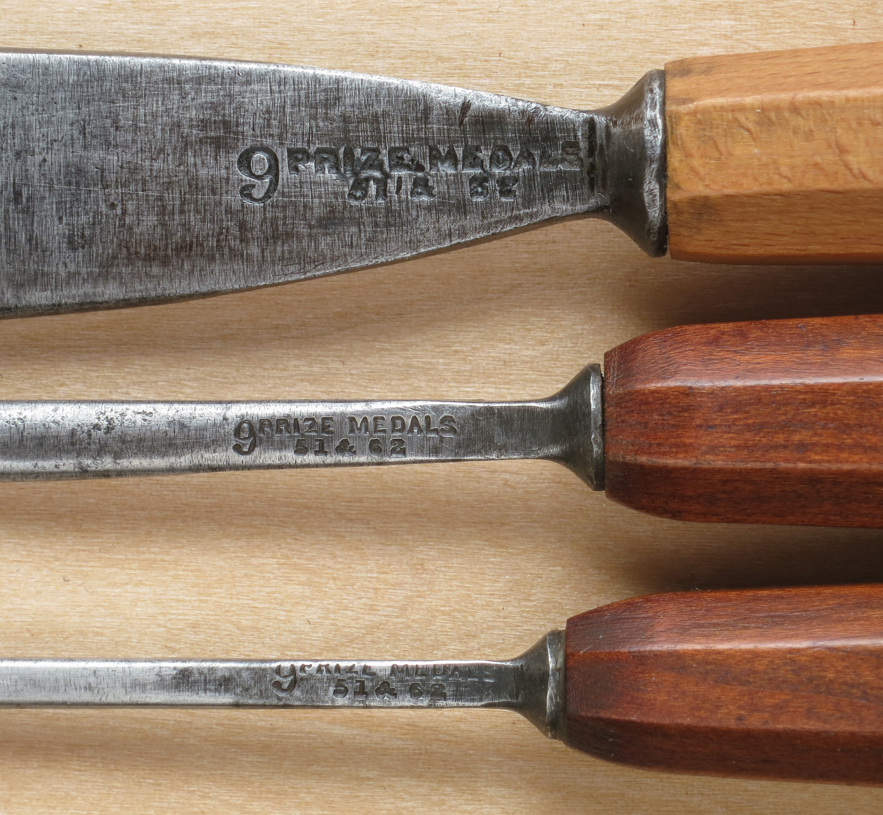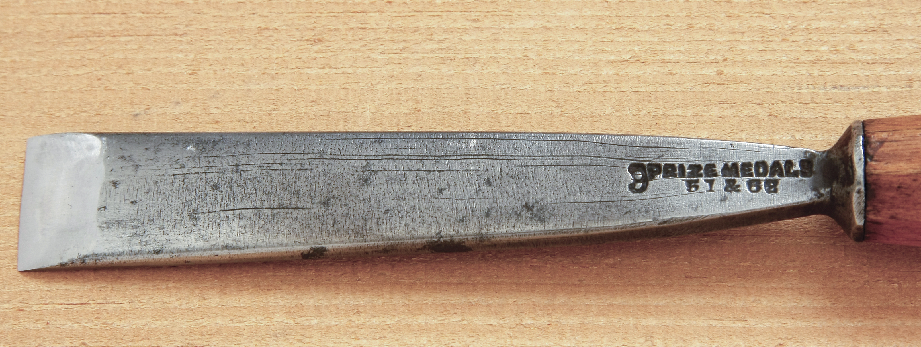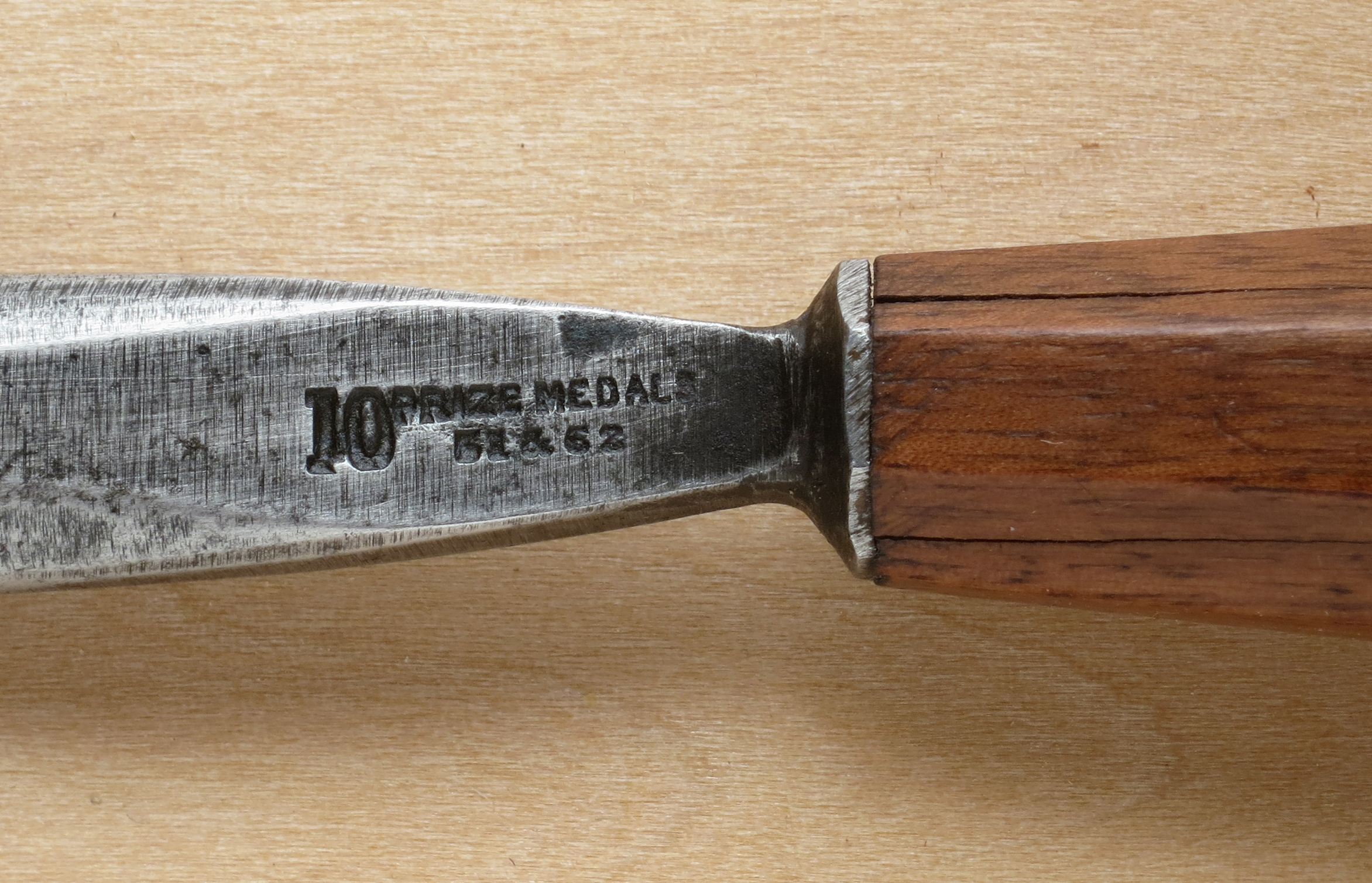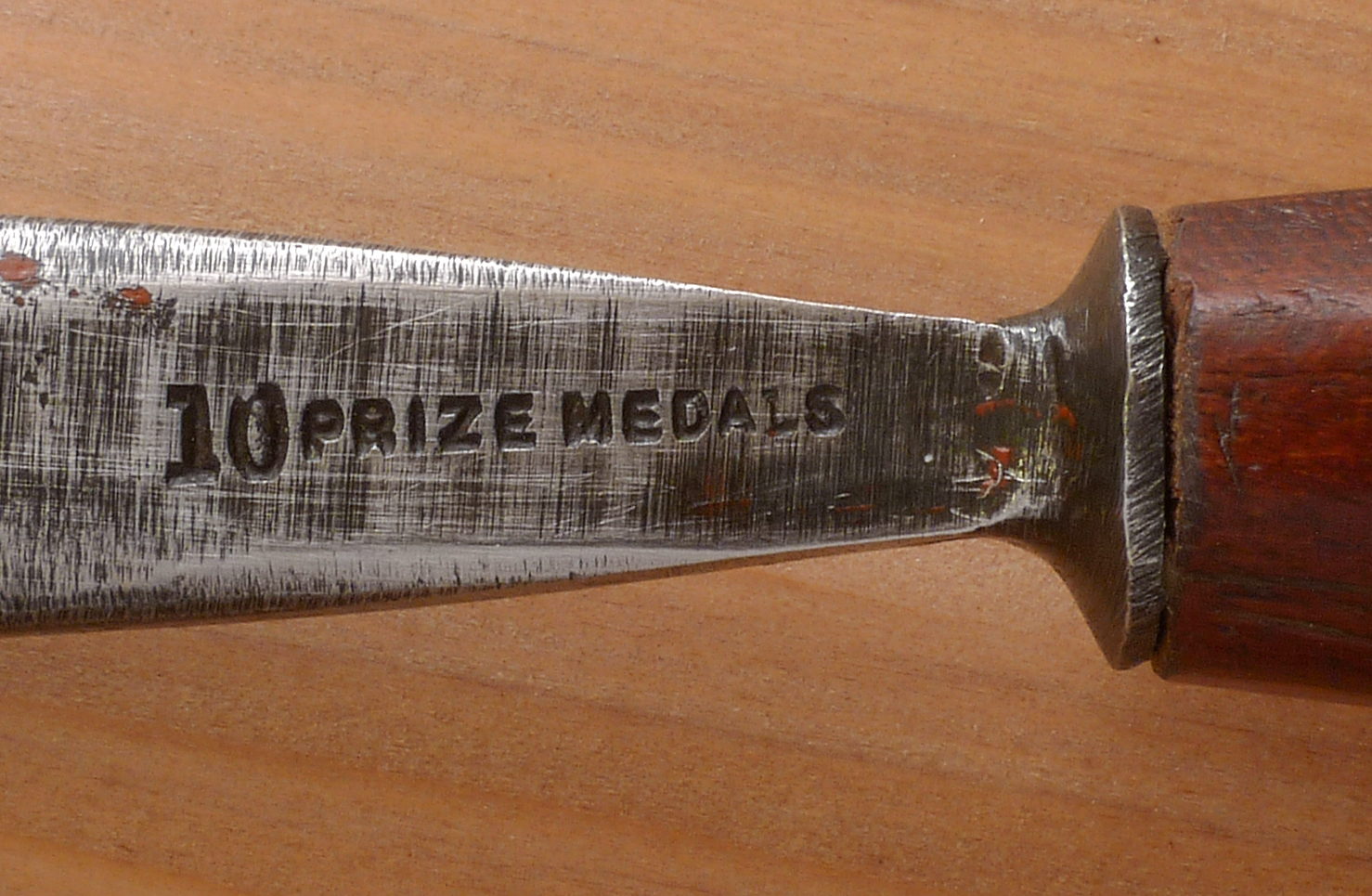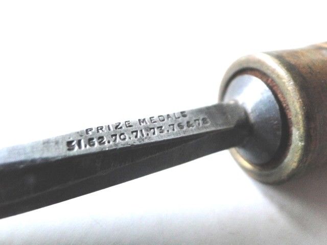 Reverse of the carving gouge in the previous slide. 10 PRIZE MEDALS. The 51 & 62 dates have been eliminated in this imprint. 1895-1910. Storb Collection.