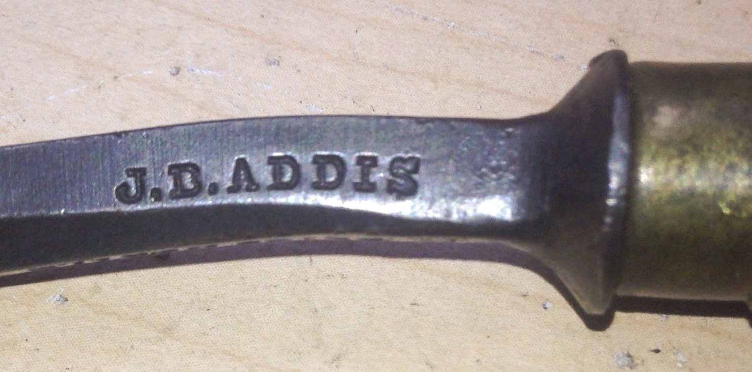 J. B. ADDIS & SONS over SHEFFIELD imprint. The city of origin imprint was likely added to tools in the late 1870s. 1881-1890. Storb Collection.