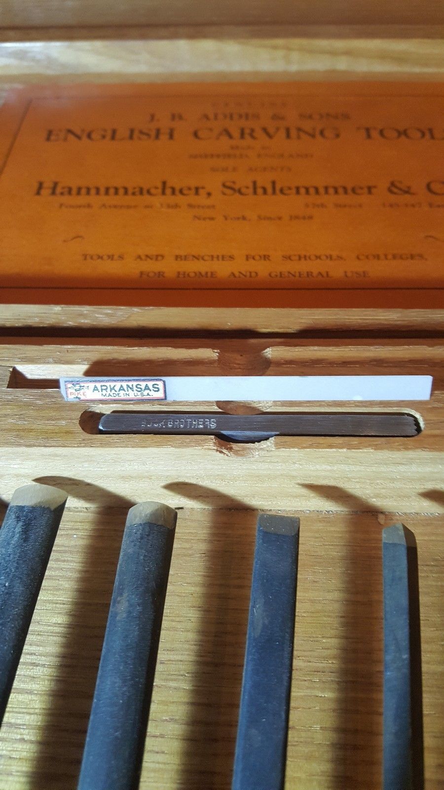 Hammacher, Schemmer & Co. is a New York City store that specialized in hardware and tools when it was founded in the mid-nineteenth century. The company name used on the label in this box of carving tools was adopted in 1883.  The boxed set of 12 tools likely date before WWII. J. B. ADDIS & SONS LTD. continued to operate into the 1950s. H.S. & CO. can be found stamped on many early twentieth century tools, hardware items, and workbenches. Web auction image.
