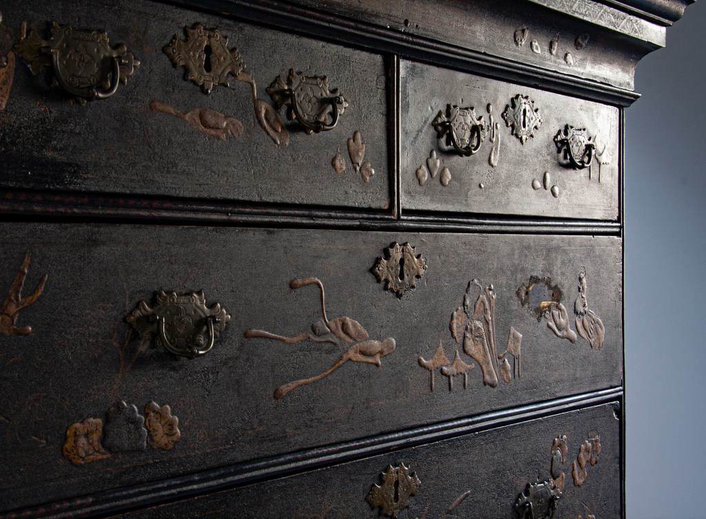 The article focuses on a single object from the Foundation’s collection, a japanned high chest, c. 1735, made by the English joiner John Brocas (d. 1740) who immigrated to Boston, Massachusetts prior to May 1696 when he is recorded as purchasing land there. Robust evidence of his furniture shop in the historical record have allowed furniture historians to study his life. But until “Brocas” was found inscribed in graphite on the exterior surface of the backs of the majority of the drawers the Foundation’s  high chest, no work had been documented or attributed to him.