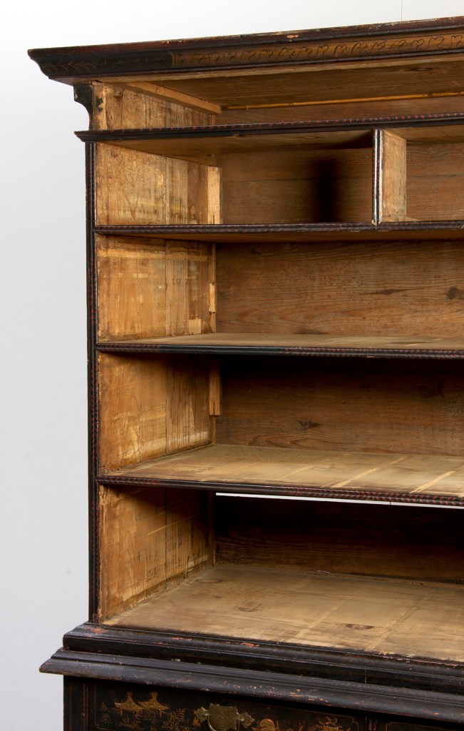 I find the mouldings intriguing: Despite the whole being japanned the waist mouldings are clearly crossgrain-veneered (walnut?) on a long-grain pine core.