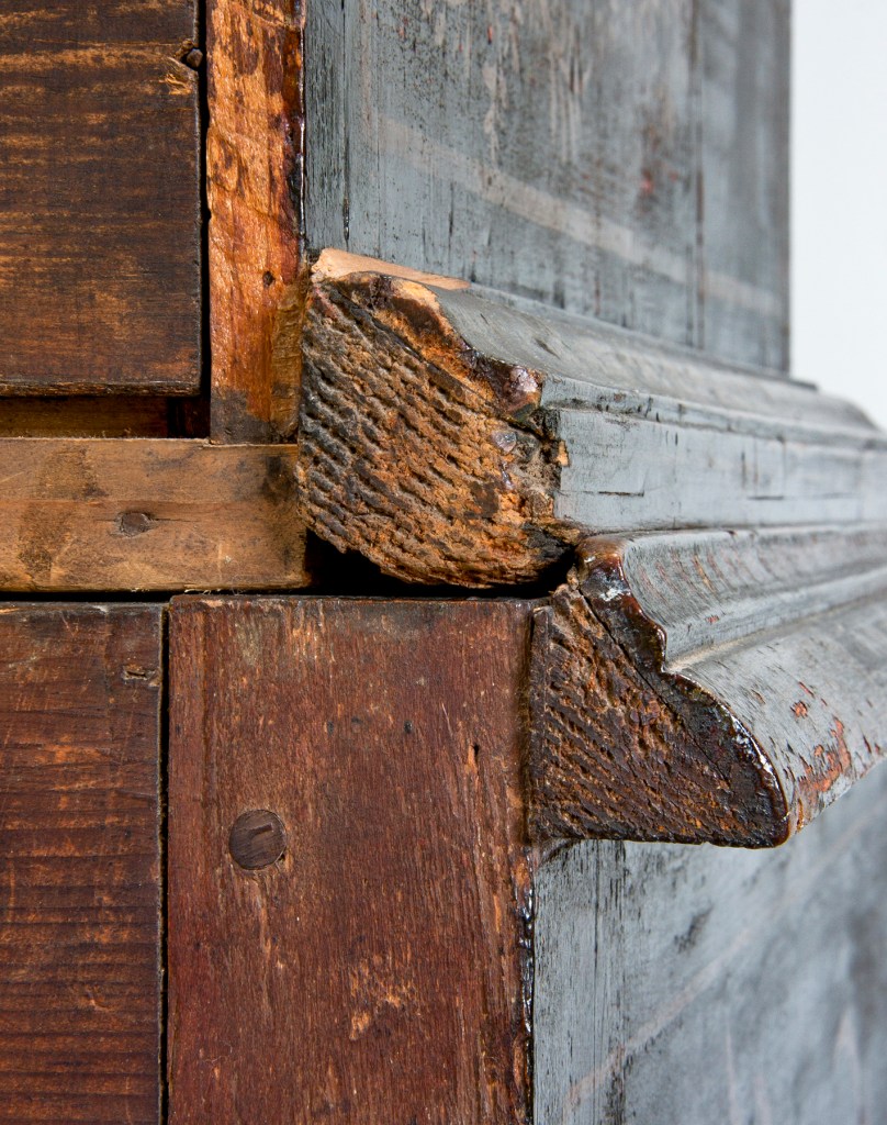 However, the cornice mouldings are a bit of a mixed bag. The upper composite arrangement appears to be simply testudinally painted long-grain pine while the lower section is thin (long-grain?) veneer on a long-grain pine core. Is one or other a repair? They don’t look as if they were even applied contemporaneously.