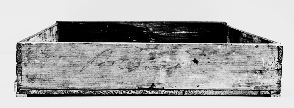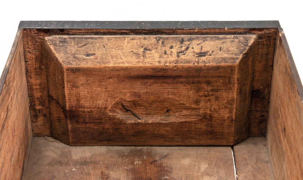 • The grain of the 1/2 inch dust boards runs side-to-side. The grooves and wear marks are from nails in the drawer bottom. The drawers originally ran on their flush bottoms, pure late 17th century technology. Wear strips were added to the drawer bottoms at a later date to alleviate the friction between the full width drawers and the dust boards. The dust boards are fit to 1/2 inch dadoes in the sides, that is their only support.