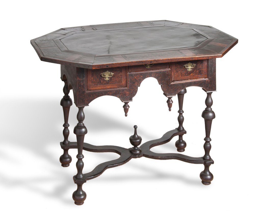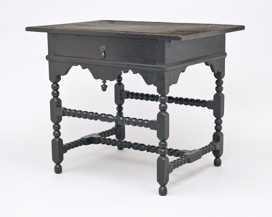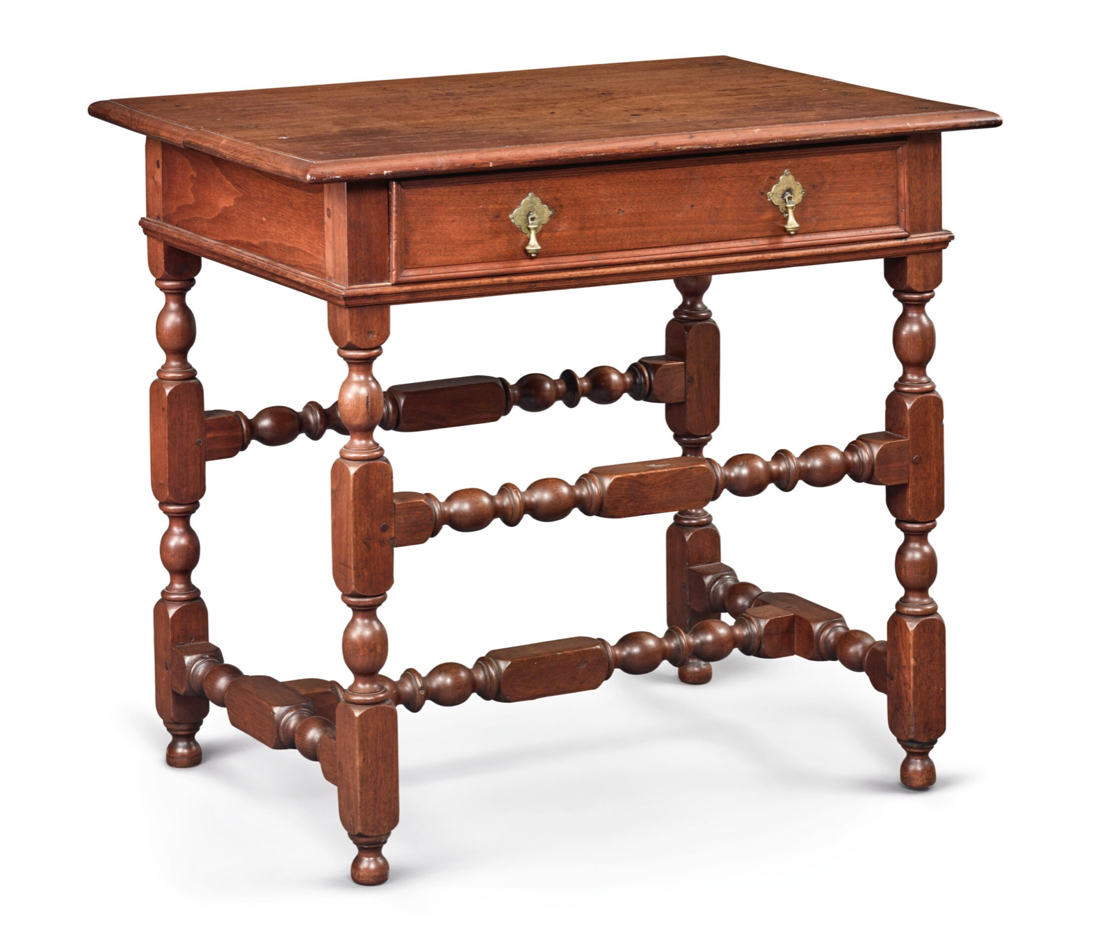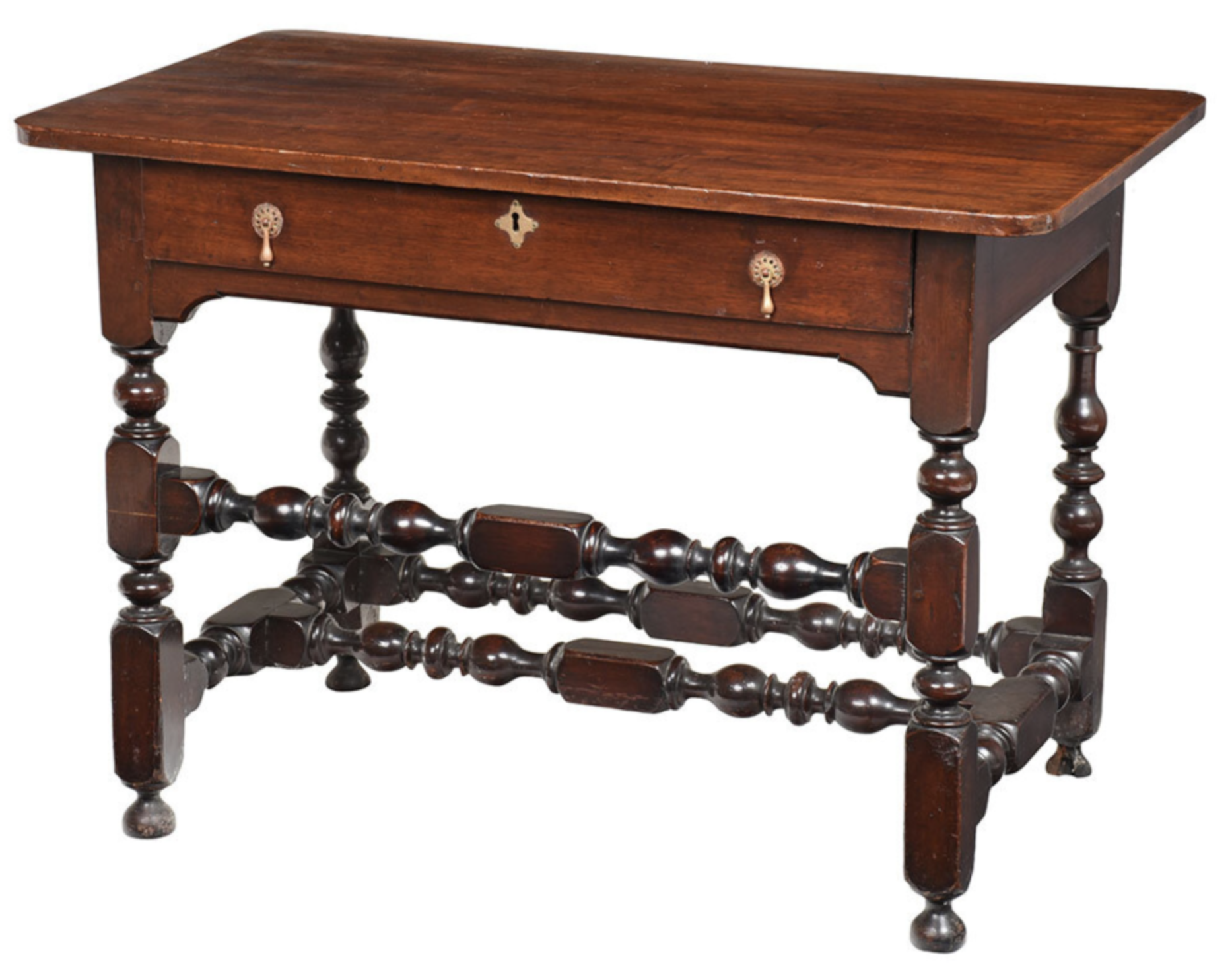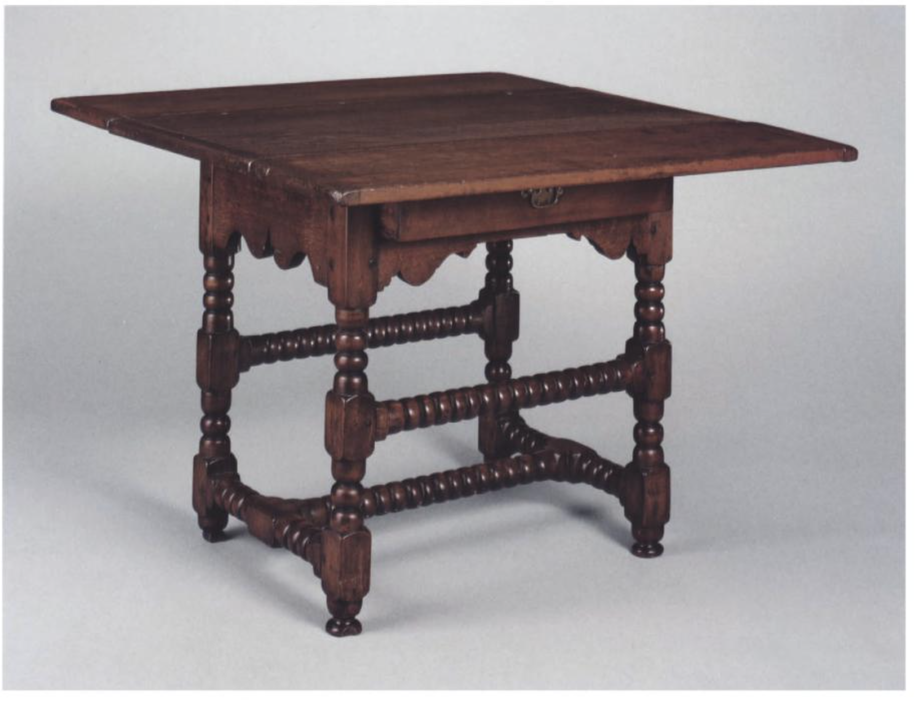 Since we have yet to document the table to Head’s shop, we risk getting ahead of ourselves, but I’ll add my comments to Jay’s. A “square walnut table” is exactly the appropriate title for the table featured in the last post – if indeed it did not originally have a slate top. In the “Worldly Goods” exhibition catalogue the Brunk Auction table was described as a “Dressing table, c. 1700-1720” and was included in the section of “case furniture” rather than the “tables and stands” section. But there is no reason to think this form is anything but a sideboard table, a common feature of British dining rooms since the Restoration. The courtly version, today called a “Triad” was the suite of table, stands, and a looking glass placed on a pier between windows or against a long wall. Provincial joiners, including those in the Delaware River Valley, made their own, less opulent versions, eliminating the stands, and often the looking glass as well. The table could serve multiple functions and might be moved to different rooms in the house. It could be used for food and drink service, a spice box or bible could be set on top, or chairs could be placed at the ends, transforming it into an impromptu desk. In the last quarter of the 17th century and the first of the 18th, a single drawer, as seen in this table, was a consistent feature.