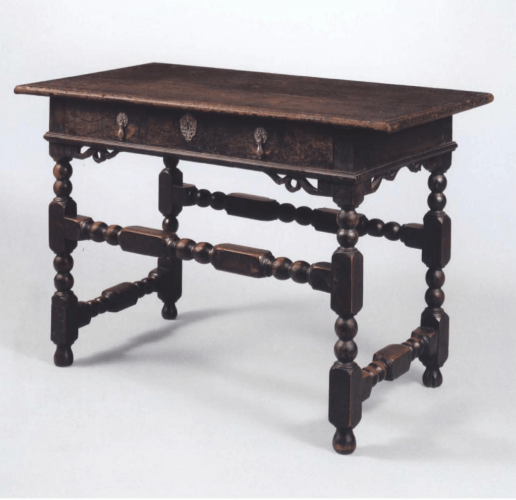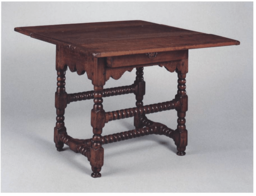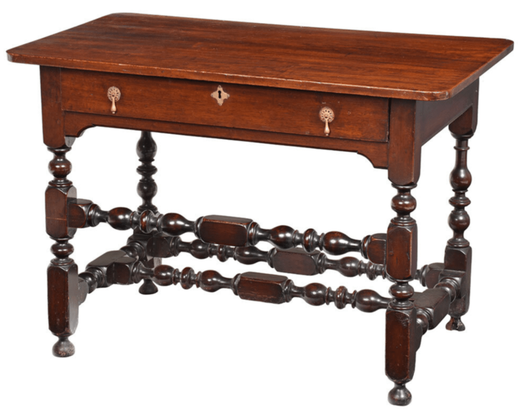 If you went looking for related tables after reading the last post, especially with an eye for the unusual stretcher placement, you would have been in for a surprise. There are abundant examples of this form of joiners table found in Britain and dozens in the American colonies, mostly made in New England, primarily Boston, but all published examples that I am aware of with a high stretcher at the front legs have a corresponding high stretcher at the back. An H-stretcher at the bottom typically completes the joinery of the frame.