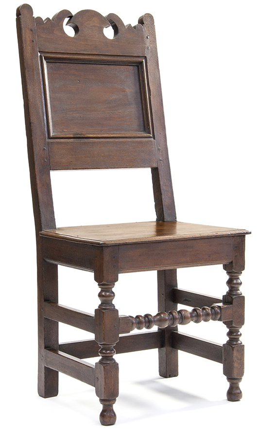 With a high stretcher spanning the front legs and a low stretcher at the same level as the H-stretcher at the back of the frame, the Brunk Auction table may be a unique design. This unusual design approach to what was a standardized form, necessitates two different leg patterns. It is unexpected, unfamiliar, and also – to date – not found on another contemporary turned table frame. (I would be happy to see a similar table if a reader comes across one). The question then is why? Four identical legs with high stretchers front and back would have made a perfectly fine table, particularly given the attention to the design of the profiles and the execution of the turning. There is nothing structurally to be gained by this unusual stretcher placement. Is it purely a design consideration? Could the rear legs have been destined for an oval able commission that didn’t happen? Or did the maker desire a more complex baluster-turned design for rear legs? Joined Delaware River Valley joined chairs, which were plentiful in and around Philadelphia at this time might have provided an inspiration.