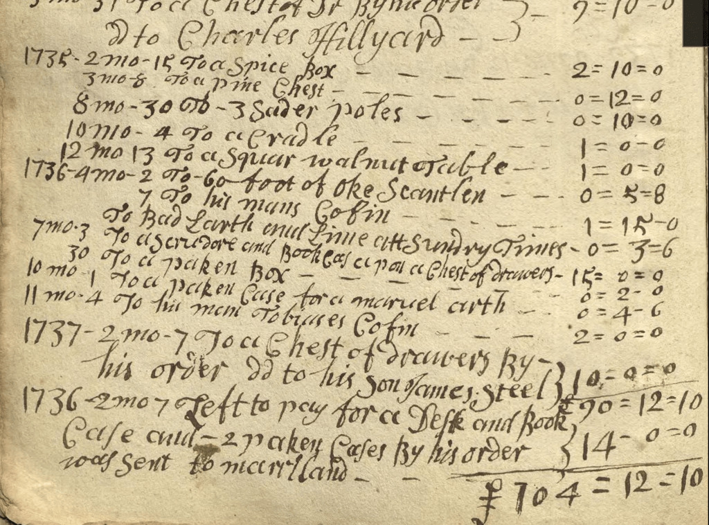 Jay’s comment in the previous post described a unique debit entry in James Steele’s account with the joiner John Head on 12/13/1735, “To a Square walnut Table – £1-0-0.” Jay suggested that if Head made the Brunk Auction table it may be this entry, or alternatively it might be the “frame for a slat Table” Head debited to Steele on 1/11/1724.
