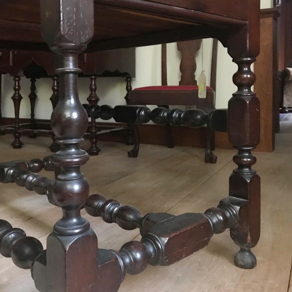 Since this table came back to my attention in December I have pored over the books and museum websites and I also have not found another table with this hi-low stretcher placement, nor a turned leg table with two different designs for the legs. Expediency was the rule of the day, and while I don’t necessarily think the two different leg designs and additional work in laying out the mortises and tenons would have added much additional time in the making of the table, the consistency of the design of this form of table over decades and across continents must mean there a reason of some importance to go this direction.