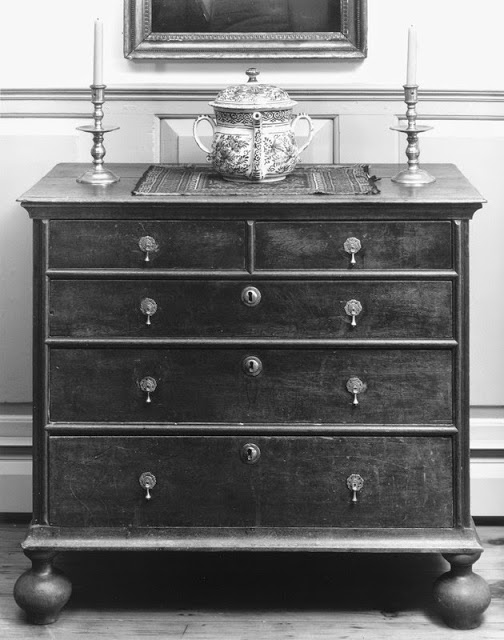 Chest of drawers by William Beakes (1691 – 1761). Delaware River Valley. Black walnut, hard pine, Atlantic white cedar, brass hardware, iron locks. The chest as it appeared in the collection of Joseph A. McFalls, Jr. The chest is currently is another private collection. Decorative Arts Photographic Collection, Winterthur Museum.