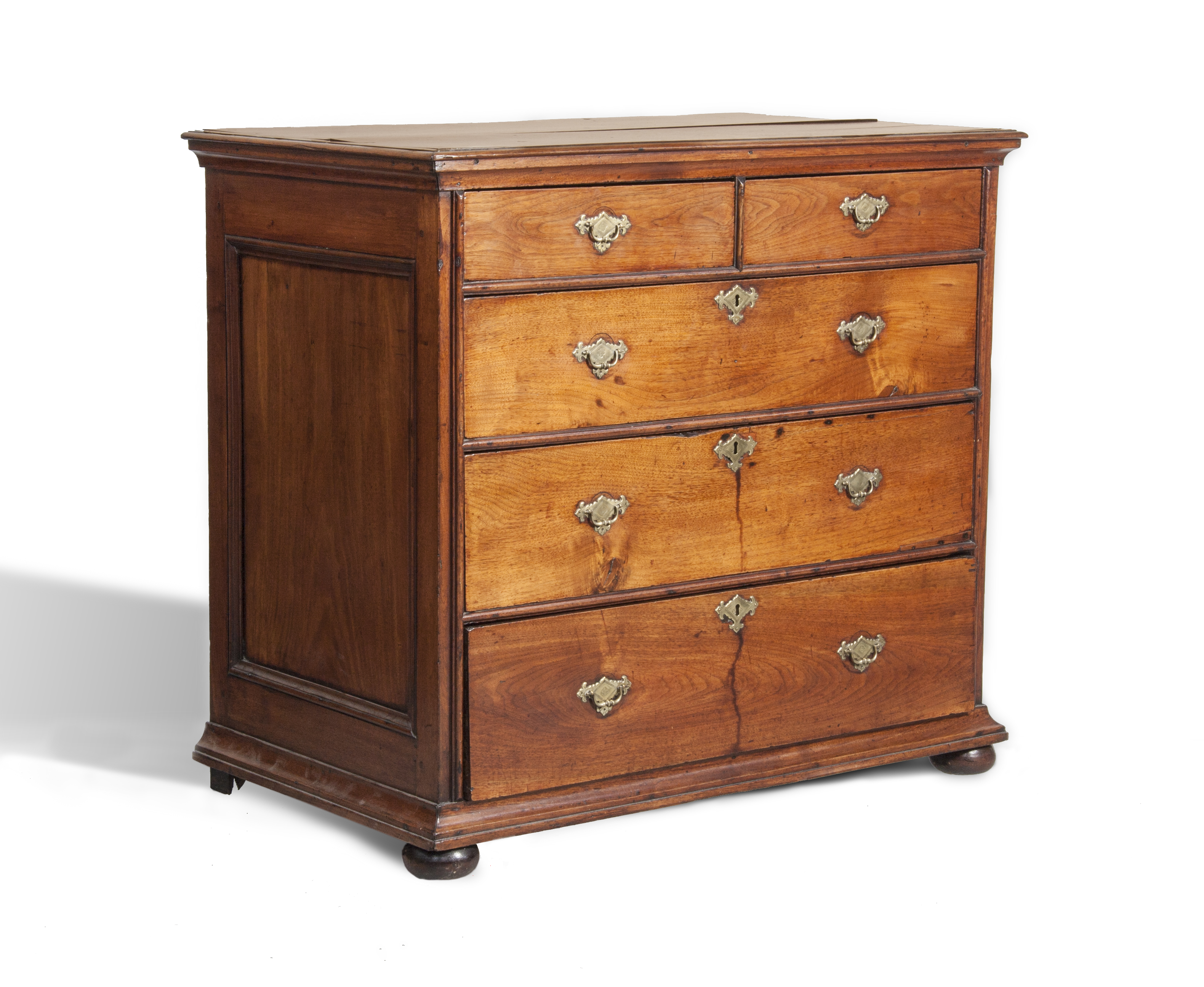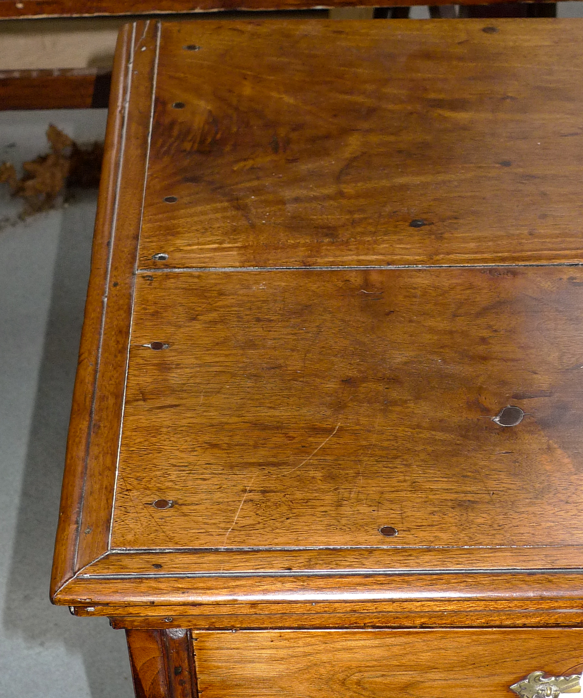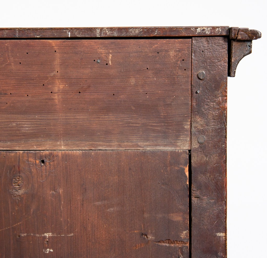 Chest of drawers by William Beakes (1691 – 1761). Delaware River Valley, probably Burlington County, New Jersey, 1720 or 1721. Black walnut, hard pine, Atlantic white cedar, brass hardware, iron locks. H. 36 ½ in., W. 40 ¼ in., D. 23in. The Dietrich American Foundation.The rails are double pegged to the stiles. (The second peg is covered by the moulding under the top.) A bolection moulding that stands proud of the stiles and rails are mitered at the corners and attached to the panel with glue and wrought iron sprigs.At the back, hard pine top and bottom rails are pegged to the stiles. Three vertically oriented boards are lap joined and nailed to rebates in top and bottom rails at the rear of the case. The rear stiles continue below the case to serve as rear feet. All four feet of this chest have been reduced in length.The horizontal hard pine drawer dividers are tenoned to the front stiles. The drawer runners are notched into the rear stiles and tenoned into the front dividers. The hard pine vertical drawer divider between the two top drawers runs front to back and is notched into the front rail of the case and nailed through the dust board and drawer divider it sits on. Dust boards fit in grooves in the drawer dividers and runners. Vertically oriented strips of wood are glued and nailed to the rear stiles act as drawer stops. Mortises for the spring locks are cut into the top drawer divider.