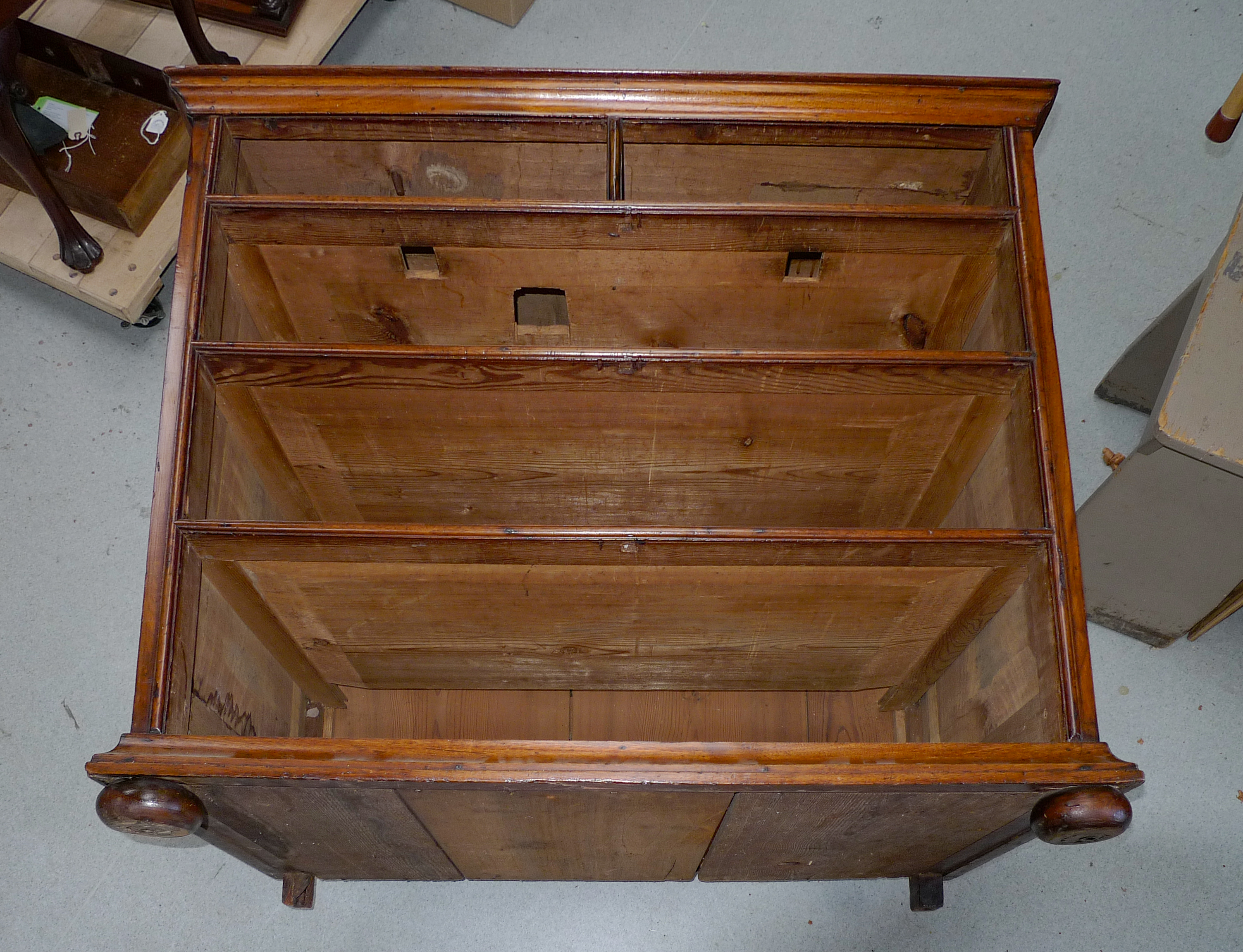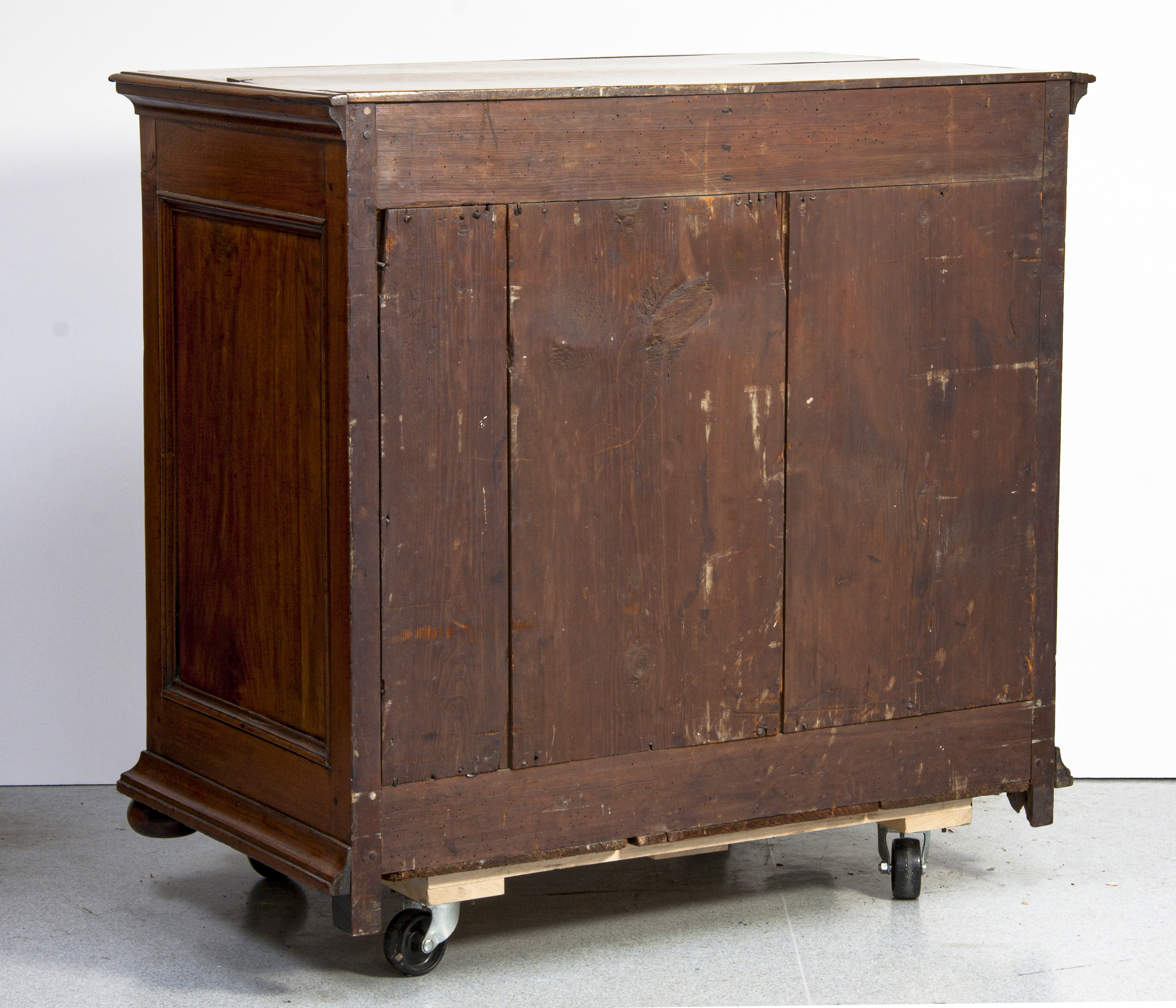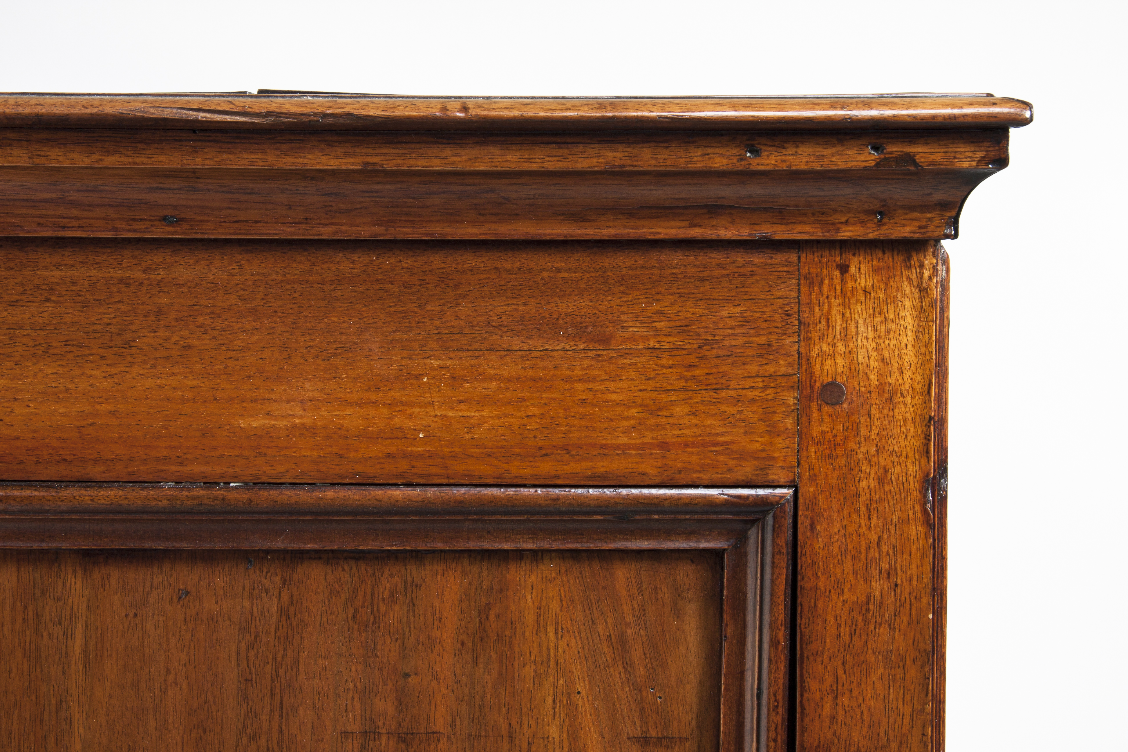 Chest of drawers by William Beakes (1691 – 1761). Delaware River Valley, probably Burlington County, New Jersey, 1720 or 1721. Black walnut, hard pine, Atlantic white cedar, brass hardware, iron locks. H. 36 ½ in., W. 40 ¼ in., D. 23in. The Dietrich American Foundation.The rails are double pegged to the stiles. (The second peg is covered by the moulding under the top.) A bolection moulding that stands proud of the stiles and rails are mitered at the corners and attached to the panel with glue and wrought iron sprigs.At the back, hard pine top and bottom rails are pegged to the stiles. Three vertically oriented boards are lap joined and nailed to rebates in top and bottom rails at the rear of the case. The rear stiles continue below the case to serve as rear feet. All four feet of this chest have been reduced in length.The horizontal hard pine drawer dividers are tenoned to the front stiles. The drawer runners are notched into the rear stiles and tenoned into the front dividers. The hard pine vertical drawer divider between the two top drawers runs front to back and is notched into the front rail of the case and nailed through the dust board and drawer divider it sits on. Dust boards fit in grooves in the drawer dividers and runners. Vertically oriented strips of wood are glued and nailed to the rear stiles act as drawer stops. Mortises for the spring locks are cut into the top drawer divider.