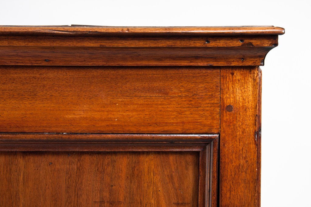 The joiner William Till, with whom Beakes was apprenticed, died in 1711 and it has been suggested that Beakes signed and dated the chest to “mark and celebrate his entry into the trade as a free artisan.” This is a possible explanation for the signature but the last numeral is not visible. It’s possible the full date was not readable even during its construction. Chamfering, or feathering, the top edge of the panel to fit it to the top rails of the side may removed part of or all of the last numeral.