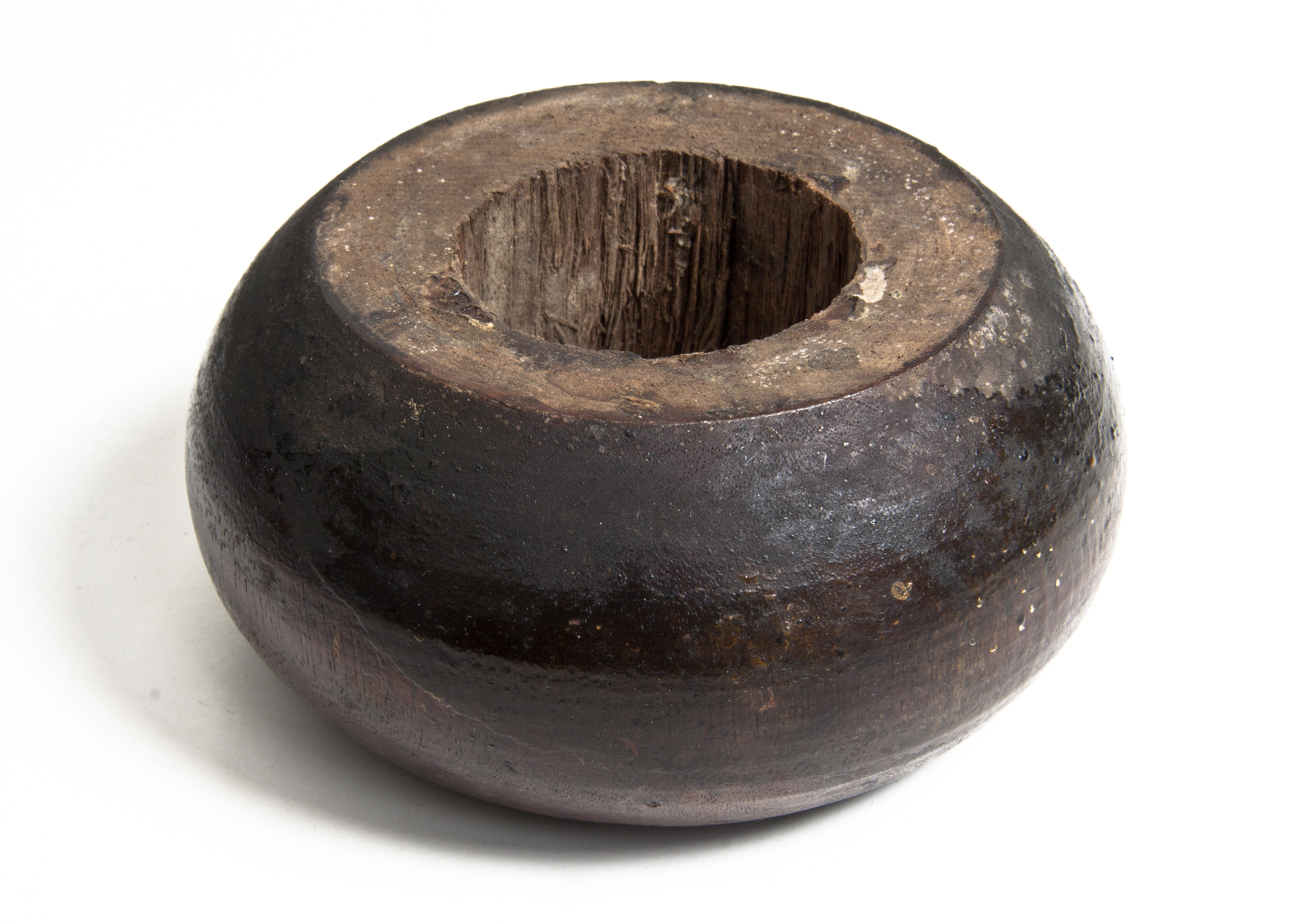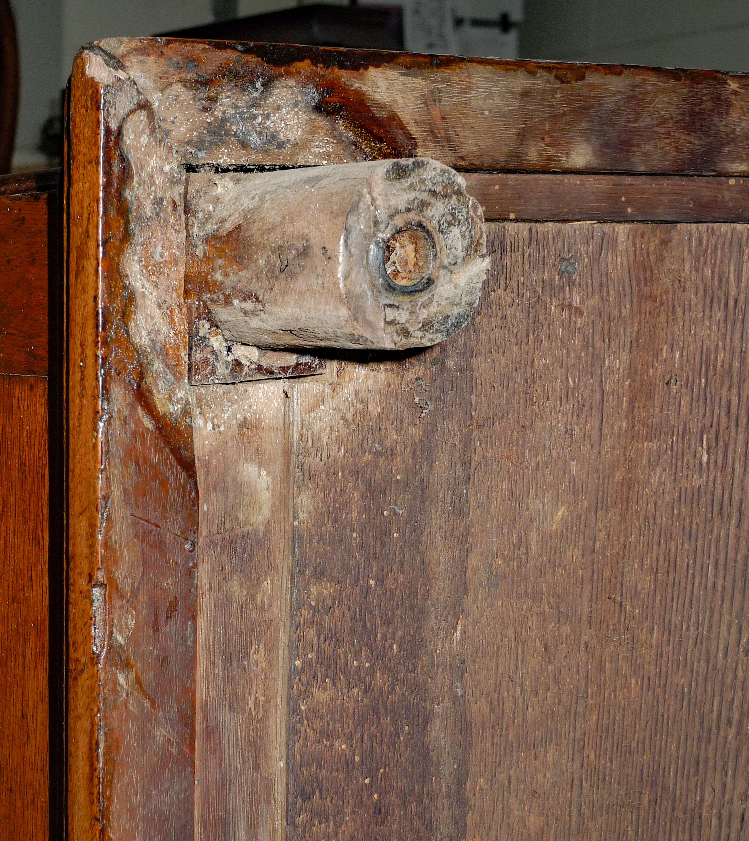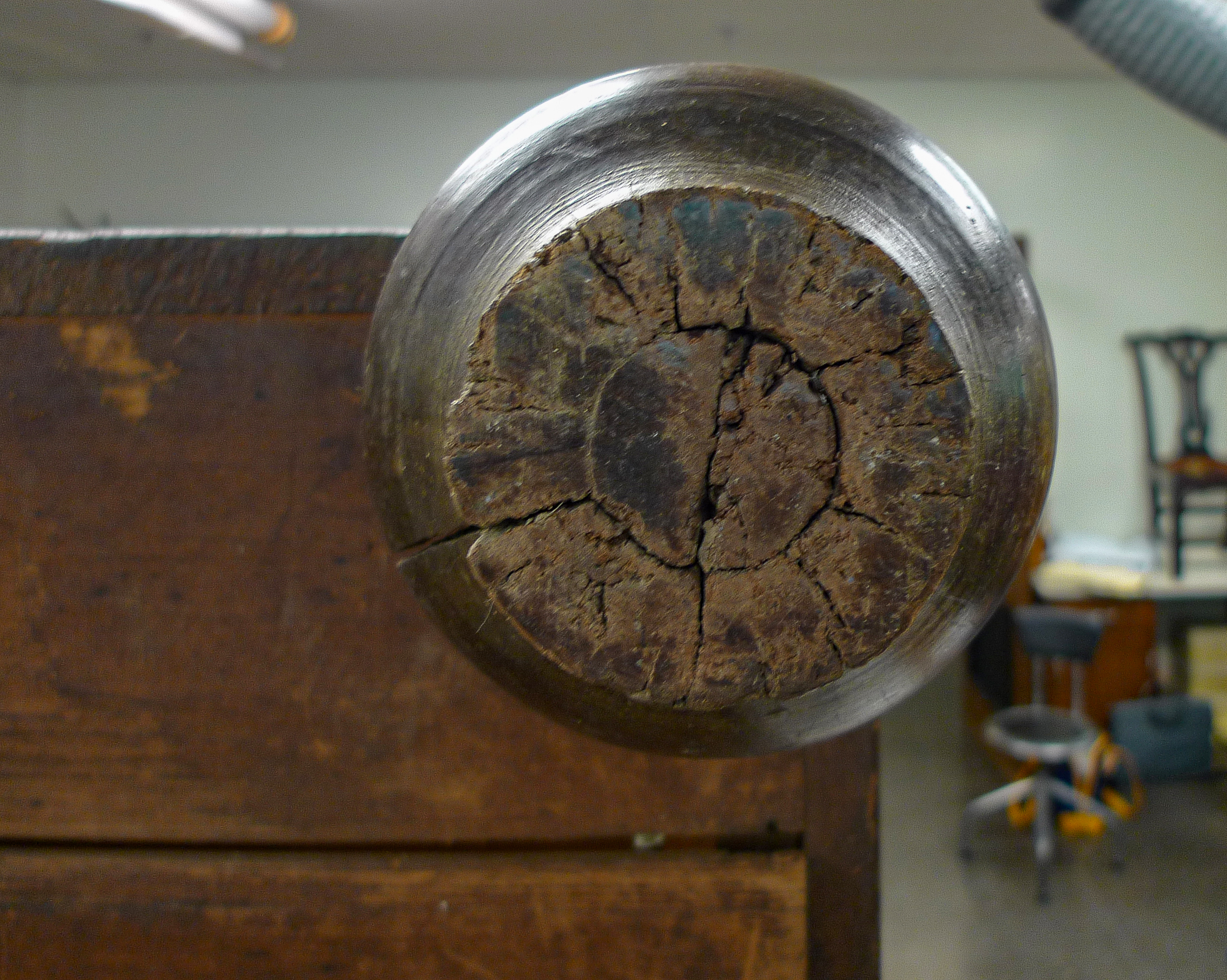 The dust boards sit below the level of the drawer runners. Friction is reduced with the flush drawer bottoms running only along the sides and the three inch drawer blades rather than the entire dust board.The hard pine bottom boards are nailed the the back rail and a rebate in the front rail. The center board is replaced. Water-mill saw kerfs are visible on the bottom surface of the boards. The interior surfaces are planed. Only the top torus element of the turned feet survive. Casters were installed after the lower section of the feet were removed.Below the base moulding, the front stiles are rounded to fit holes bored in the turned feet, a common form of construction at this time.The surviving upper element of the foot. Large diameter holes bored through the wood destined to be made into turned feet hastened the drying process and helped prevent splitting and checking as the wood dried.This view of the bottom of a full height turned foot on a chest signed by Beakes shows that the dowels worked on the stiles continue to the bottom of the feet and are wedged.The thin two-board top is pegged to the upper rails. Moulded wood strips at the front and sides are nailed to the large cove moulding below. This is a refinement not seen on Beakes’ other chests which have the moulding worked on the front and sides of the top boards. The next post will concentrate on the drawers of the chest and Beakes’ use of wedges in both through and lapped dovetailed corners. This is an unexpected aspect of his working methods, as wedged dovetails has traditionally been attributed to German immigrant joiners and cabinetmakers in America by furniture historians. That Beakes was a third generation Pennsylvanian trained by an English immigrant complicates that story.