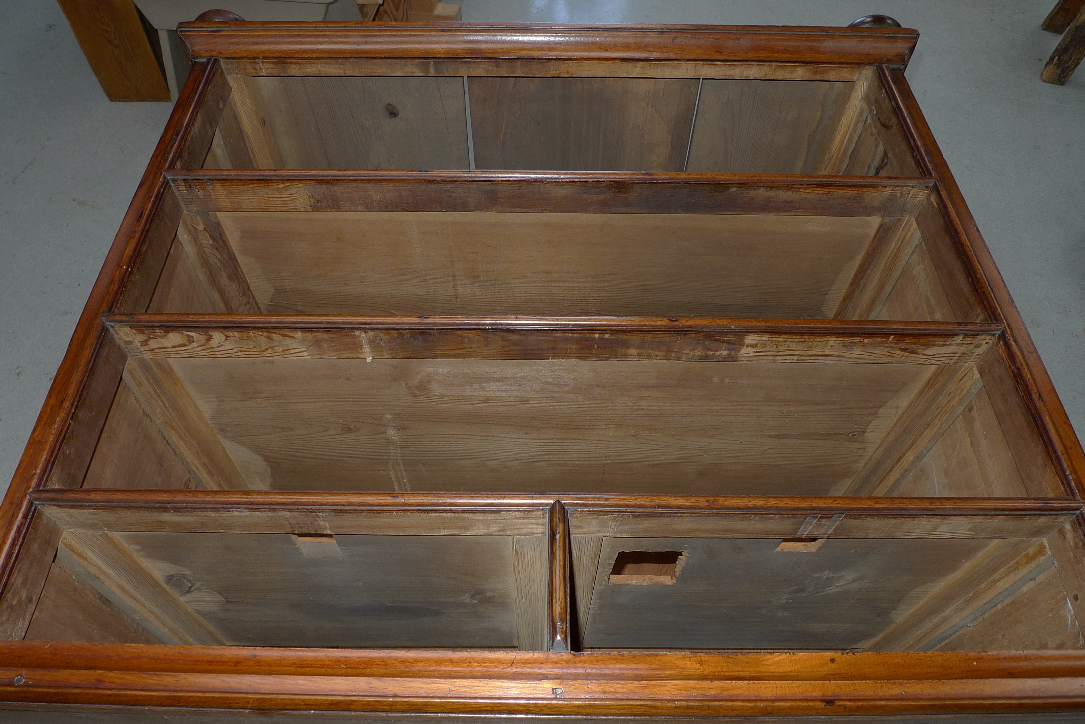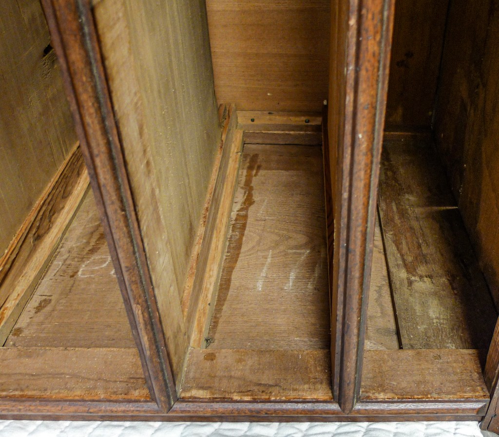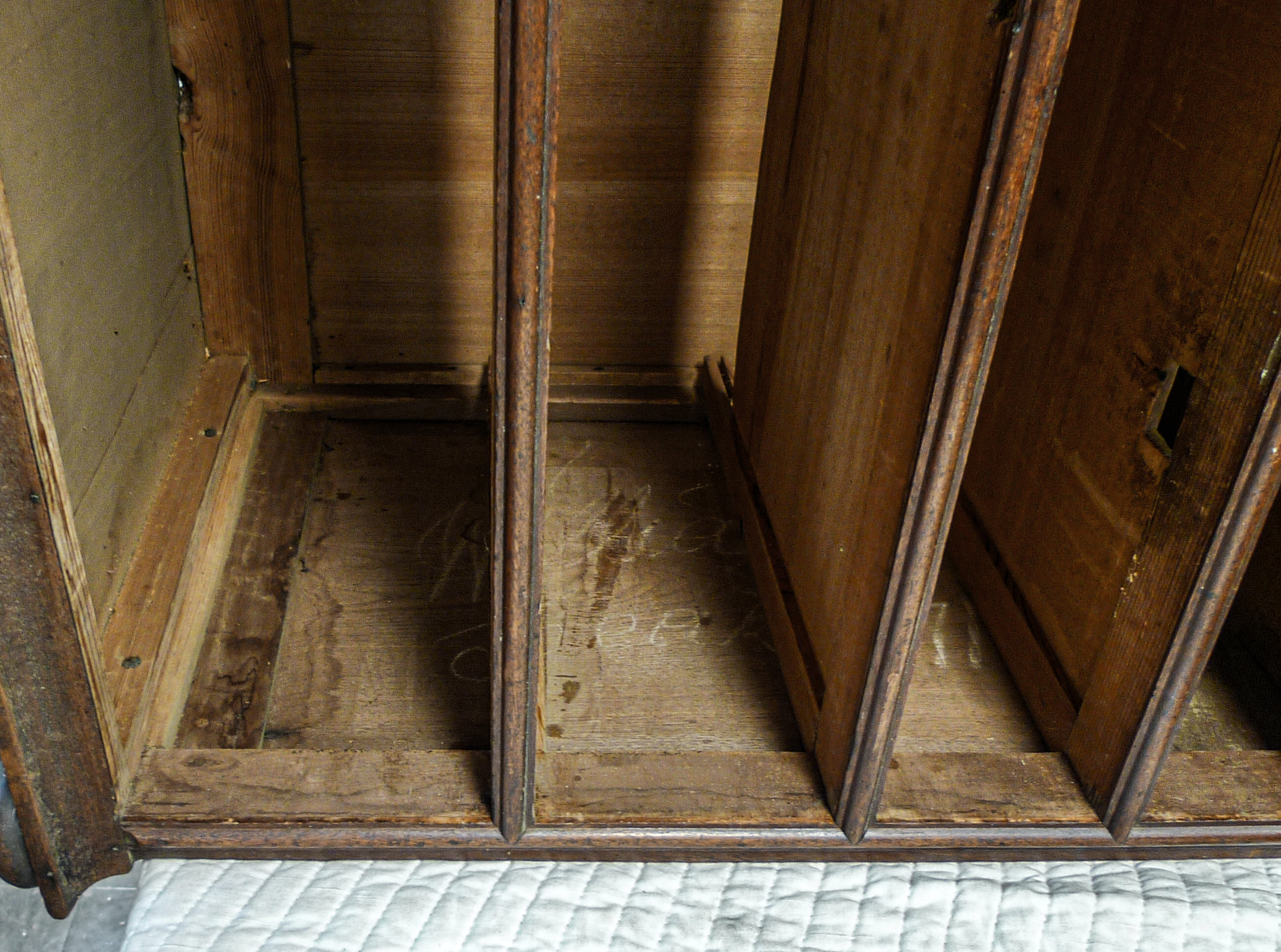 An overall view of the interior of the chest.Detail of the interior of the chest. Detail of the interior of the chest. The framing for the dust board and the strip of wood, or kicker, that fills in the space between the panel and the drawer side obscures the last numeral of the date.