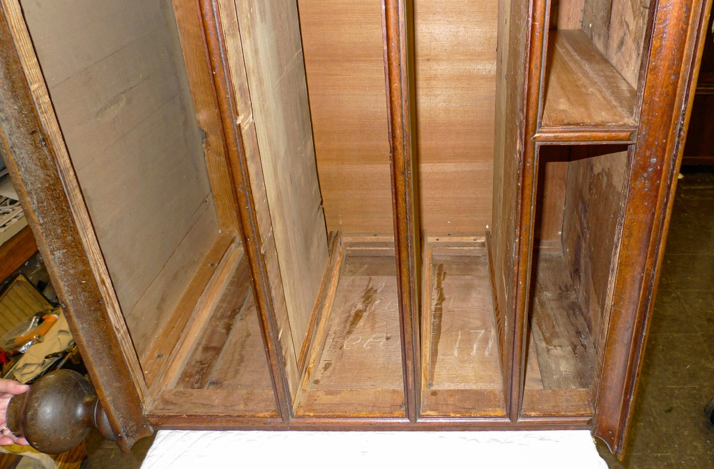 When the chest was first published in 1979, the date was reported as 1711 though there is no way to know the last numeral without disassembling the drawer runner covering it. The author of the article may have known that a William Beakes died in 1711 so surmised the last numeral must be a “1.” But it was the joiner’s namesake father who died in that year. In 1985 the chest was correctly dated 1711-1719 by Benno Forman in his 1985 article “The Chest of Drawers in America.”