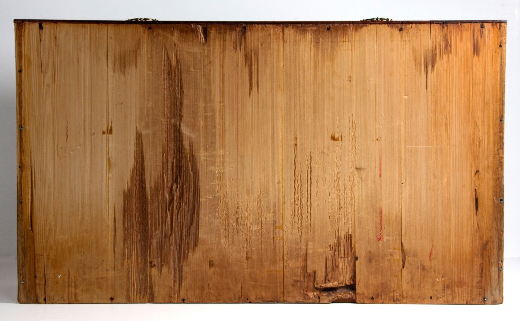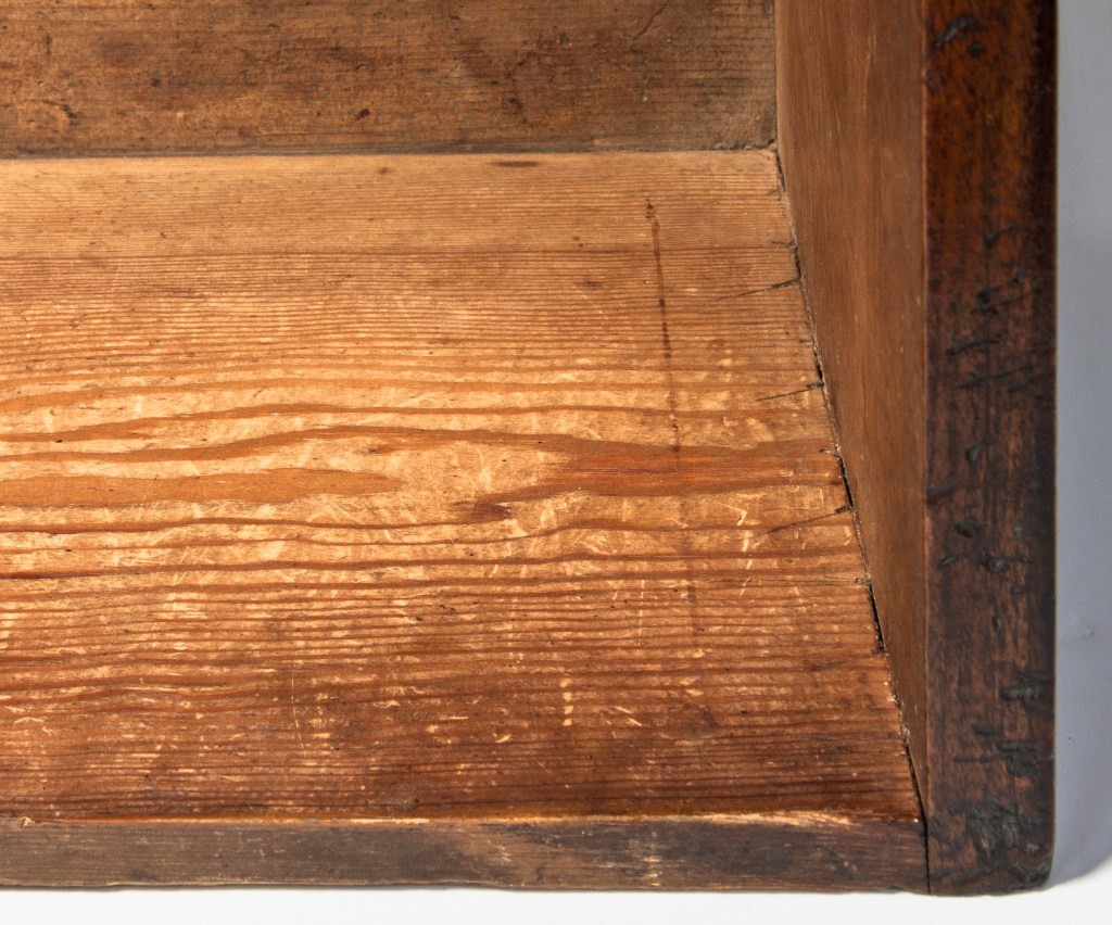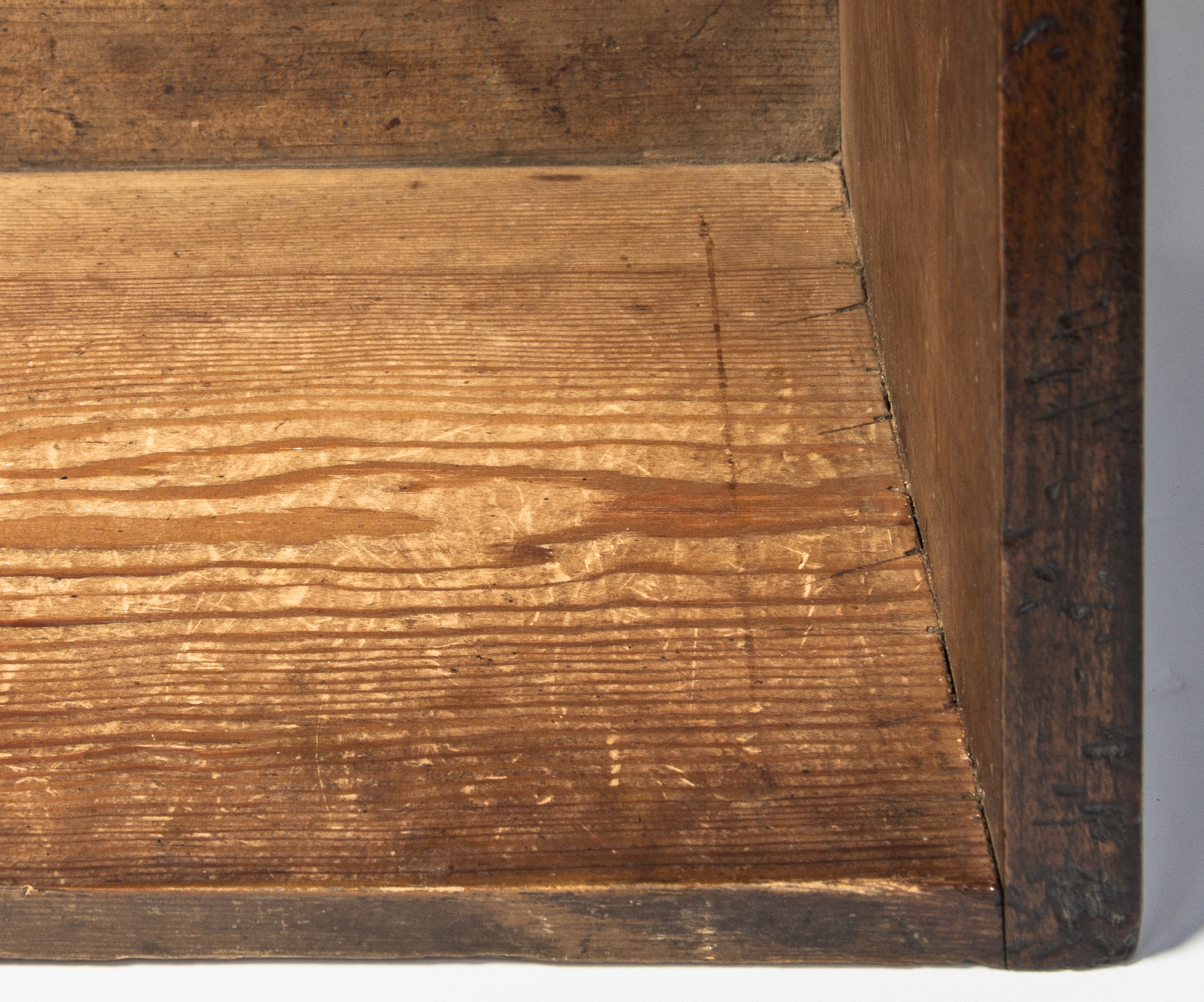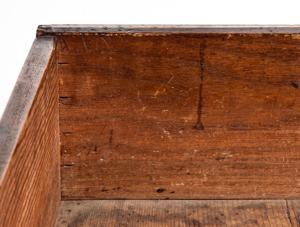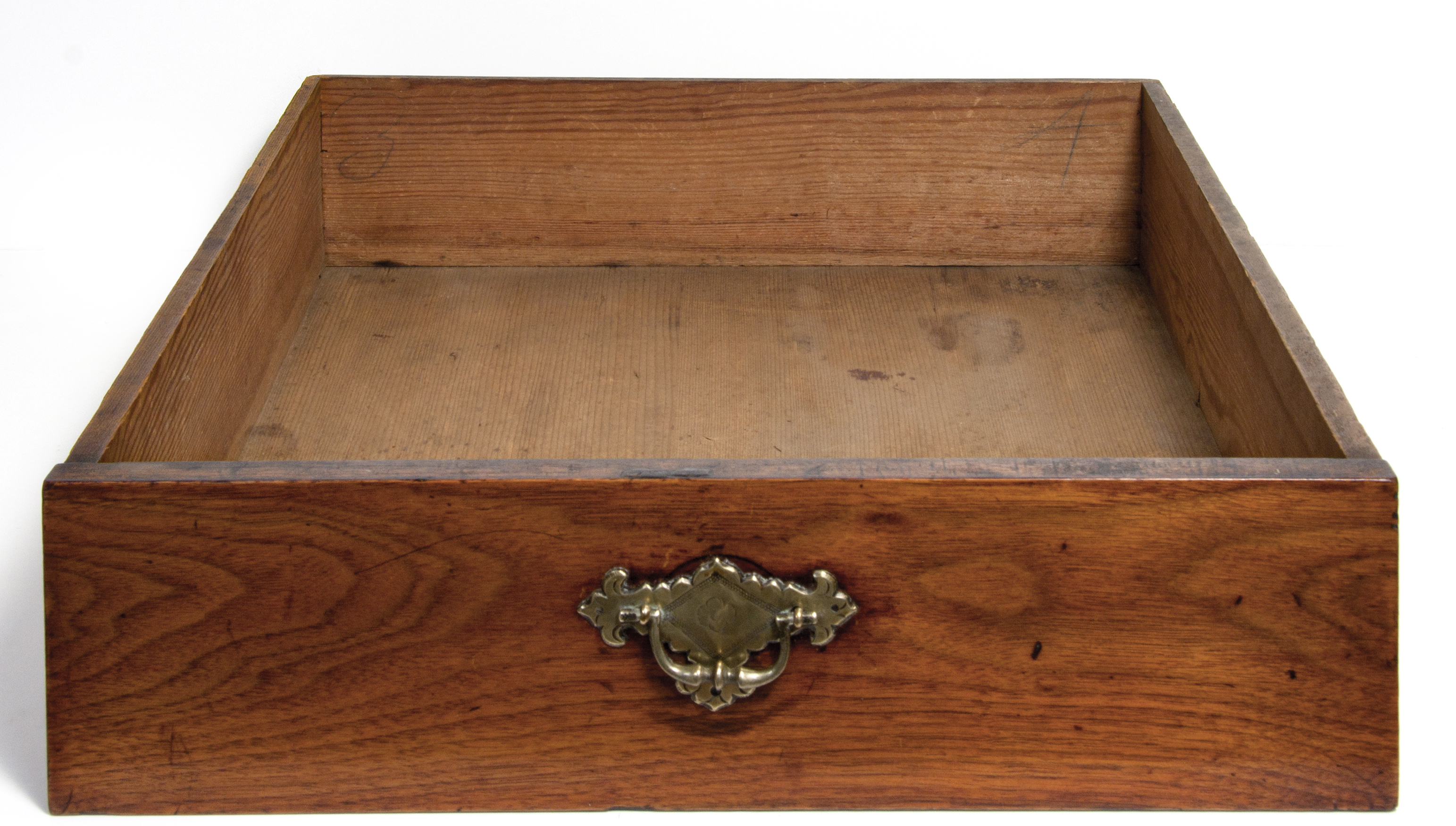 William Beakes’ drawer construction is common to late seventeenth and early eighteenth joiner’s work. The wood species were similarly used by the majority of Delaware River Valley joiners and cabinetmakers. Black walnut was the principle primary wood species used in furniture making in the early eighteenth century, drawer sides were most often of hard pine, and the drawer bottoms are made of riven Atlantic white cedar. These two secondary woods were logged in New Jersey, black walnut was primarily logged in Pennsylvania.