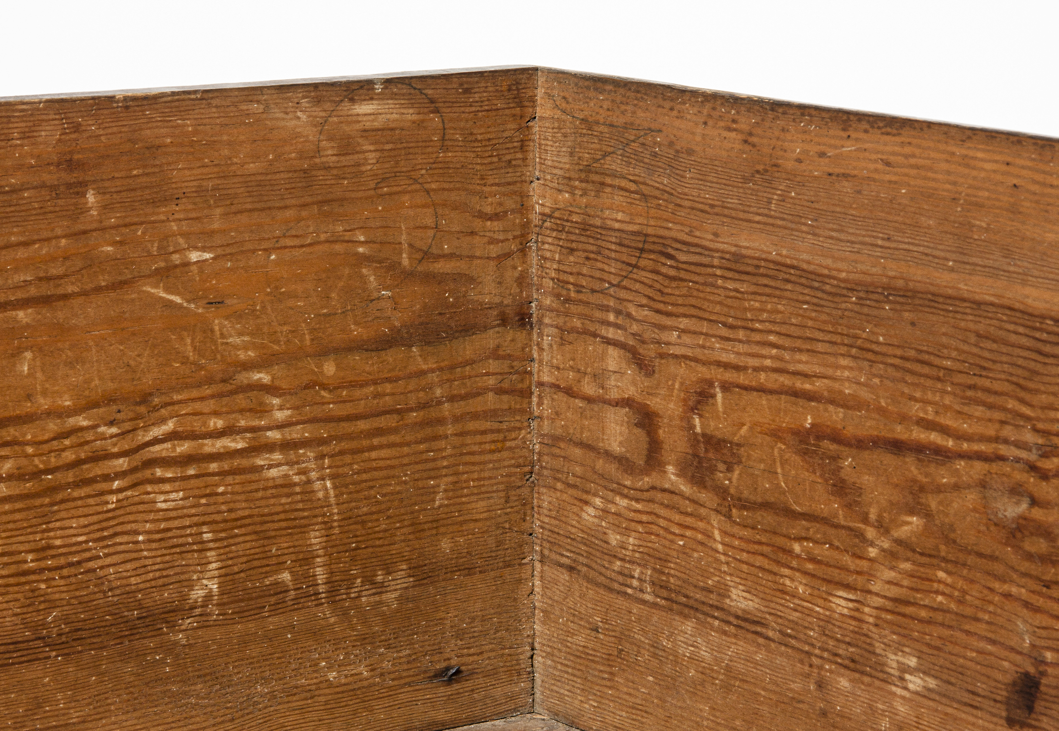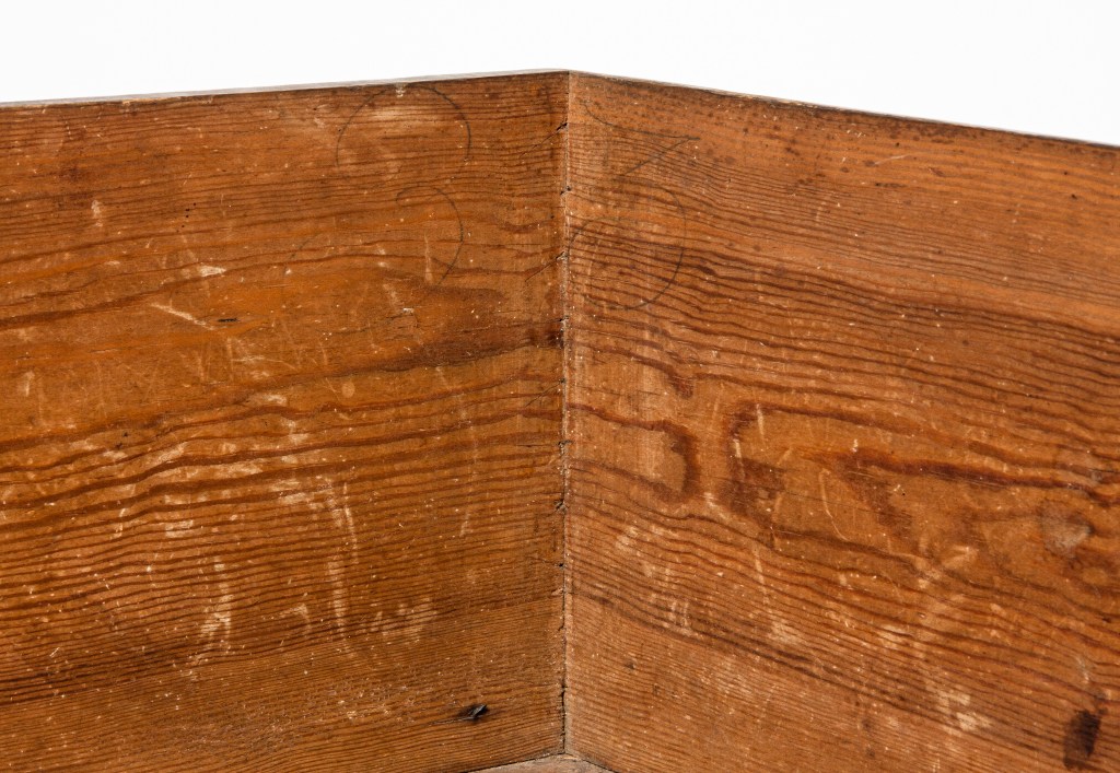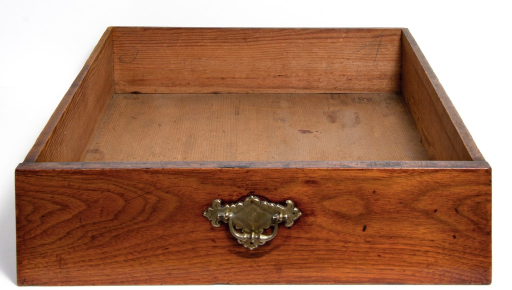 An interesting feature of these drawers is the chamfered top rear arrises of the drawers’ back boards, as opposed to a slightly lowered back board with chamfered upper rear corners of the side boards. Is this German influence too?