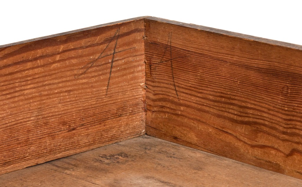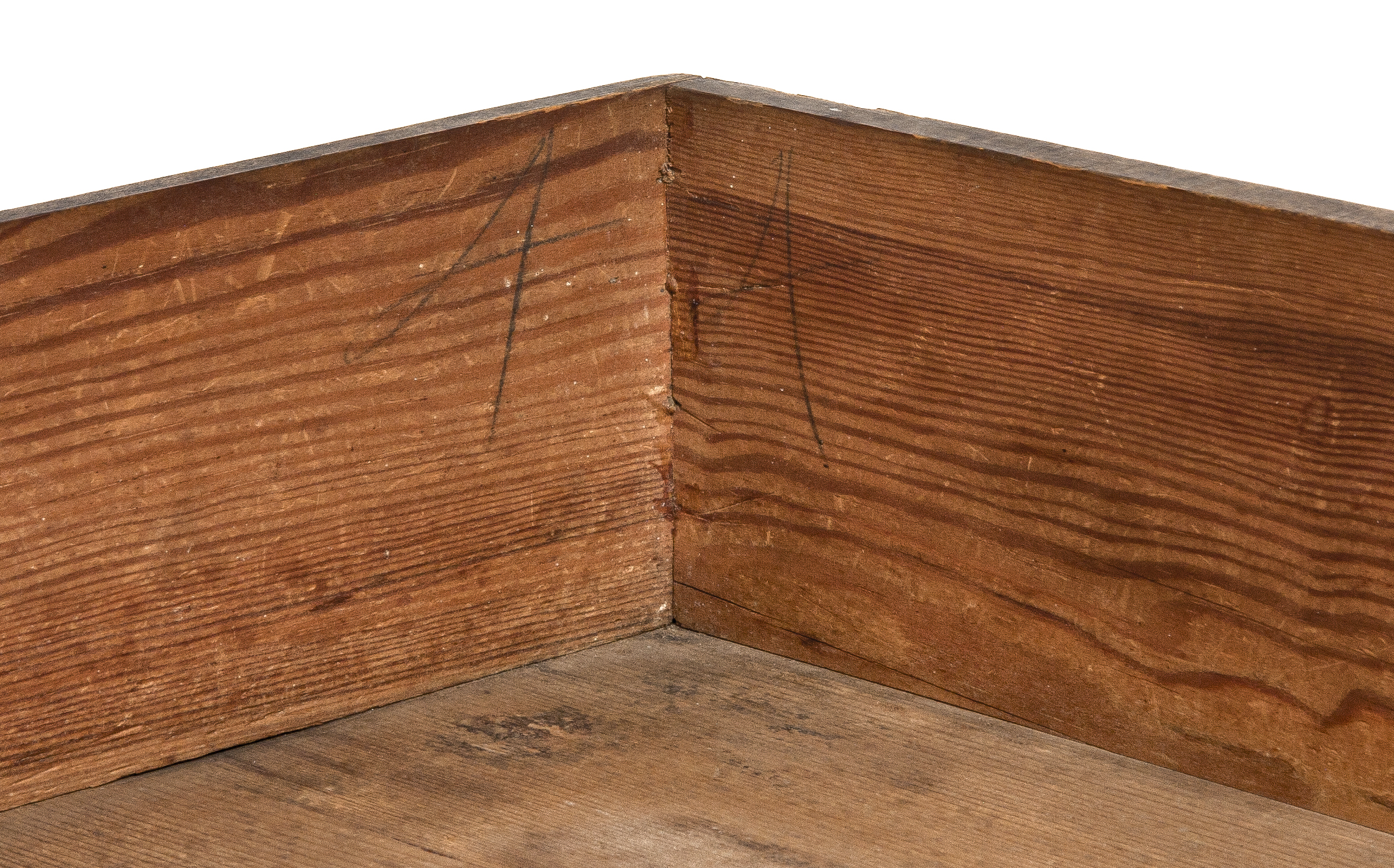 Drawer linings are numbered at the top of the interior corners to identify corresponding parts during construction. The system that Beakes used for marking his drawer parts was still being taught in the twentieth century.