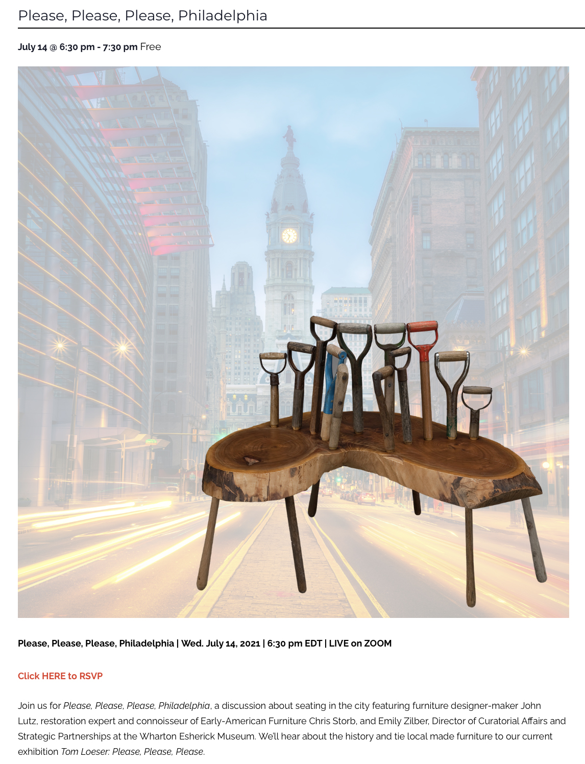 Please, Please, Please, Philadelphia is a free Zoom event from the Center for Art and Wood. I’m looking forward to participating on the panel with John Lutz, General Manager of George Nakashima Woodworkers, and Emily Zilber, the Director of Curatorial Affairs and Strategic Partnerships at the Wharton Esherick Museum. You can RSVP here.